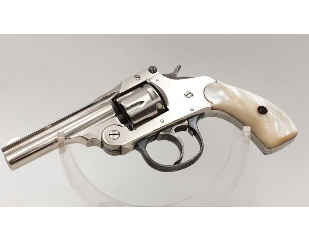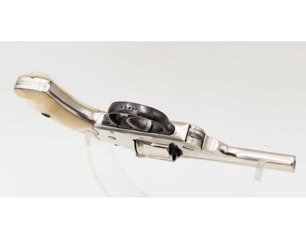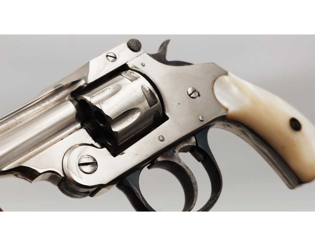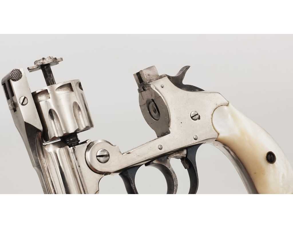 Superbe revolver de poche Iver Johnson patent 1896 calibre 22LR 7 coups simple et doubla action dans sa finition luxe d'origine nickelé à plaquettes nacre intact sans usure particulière. Mécanisme complet et fonctionnel sans jeu, rayures brillantes. Longueur totale 18,5cm.