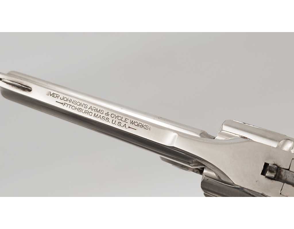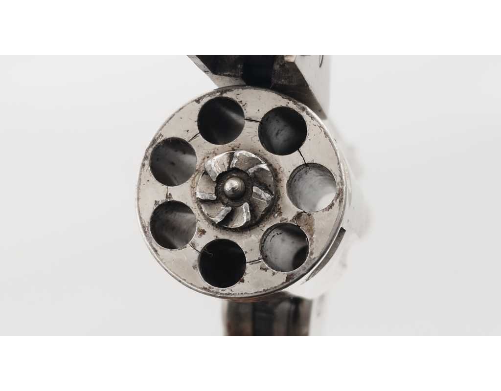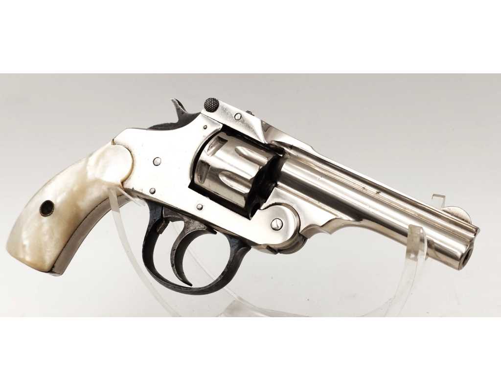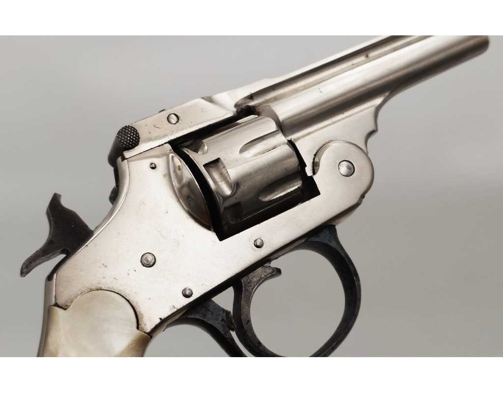 Superbe revolver de poche Iver Johnson patent 1896 calibre 22LR 7 coups simple et doubla action dans sa finition luxe d'origine nickelé à plaquettes nacre intact sans usure particulière. Mécanisme complet et fonctionnel sans jeu, rayures brillantes. Longueur totale 18,5cm.