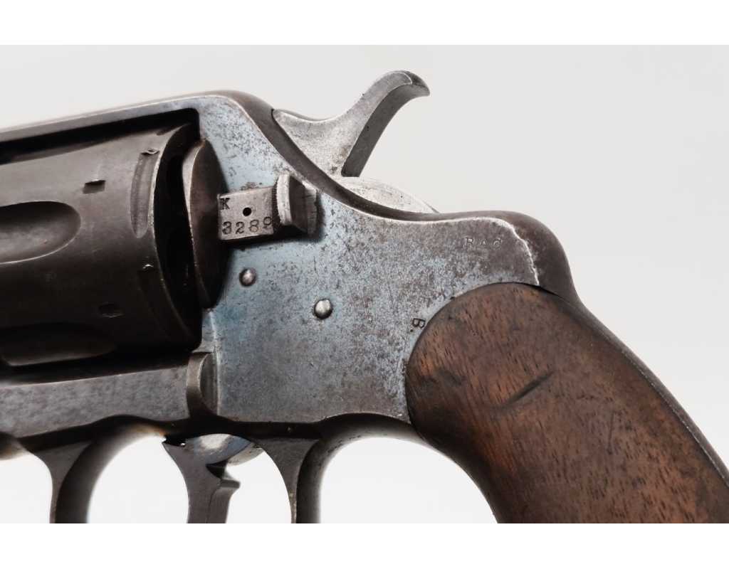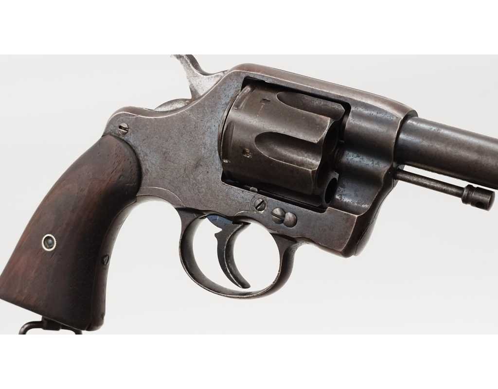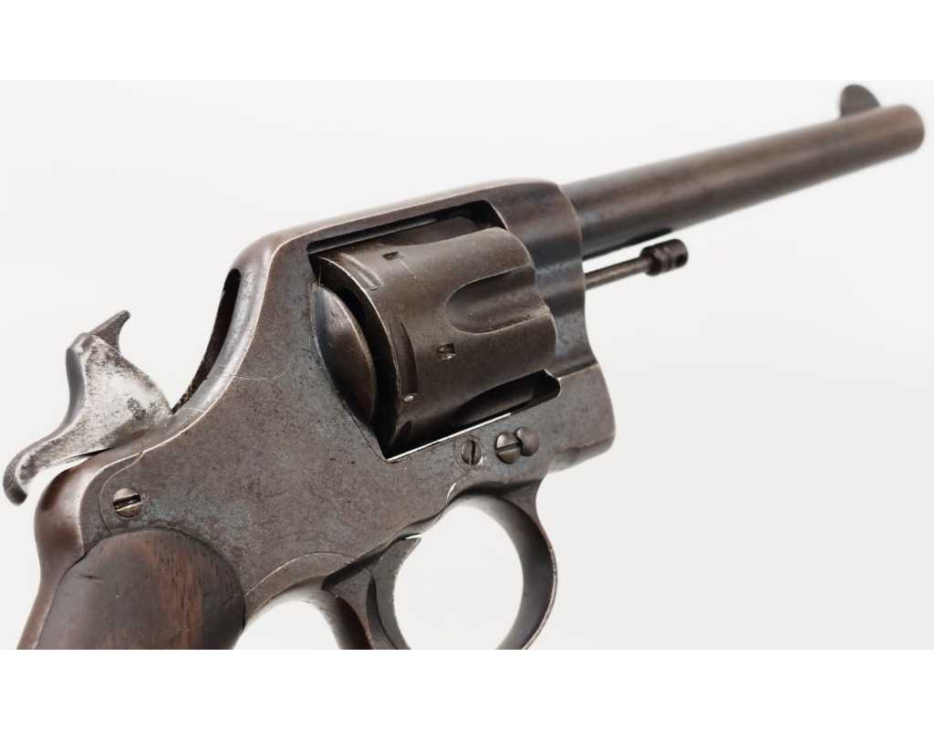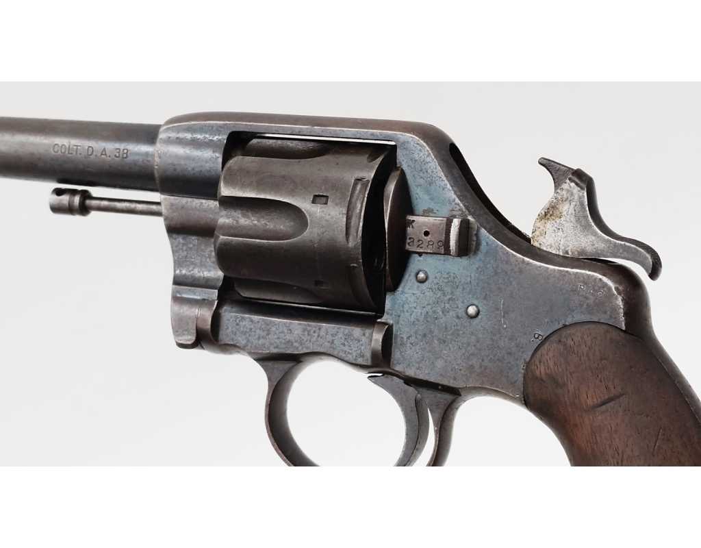 Revolver Colt Modele 1894 US ARMY Numéroté 103289, capacité de 6 coups simple et double action en calibre 38 Long Colt (357"), sortie de barillet à 9.5mm fond de rayures 9.14mm. Bronzage d'époque première guerre patiné sans oxydation, beaux marquages sur le canon avec brevet et indication du calibre non atténués, marquage du contrôleur RAC à la place du logo Colt que l'on retrouve sur le barillet, sur la face arrière du barillet et sous le canon. Mécanisme complet au fonctionnement irréprochable avec toutes pièces d'origine bien frappé du même numéro d'assemblage 3289, pas d'entre fer excessif entre le canon et le barillet, excellent verrouillage sans jeu, indexation parfaite. Canon de 6" remplacé en arsenal en 1917 pour pallier au manque d'armement des troupes extérieurs arrivées en France, poinçon du contrôleur L.E.B. côté gauche de la carcasse (manque le L), très belles rayures bien nettes non usagées d'aspect brillantes miroir sans tache. Plaquettes de crosse en noyer usagées.