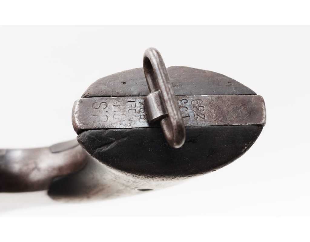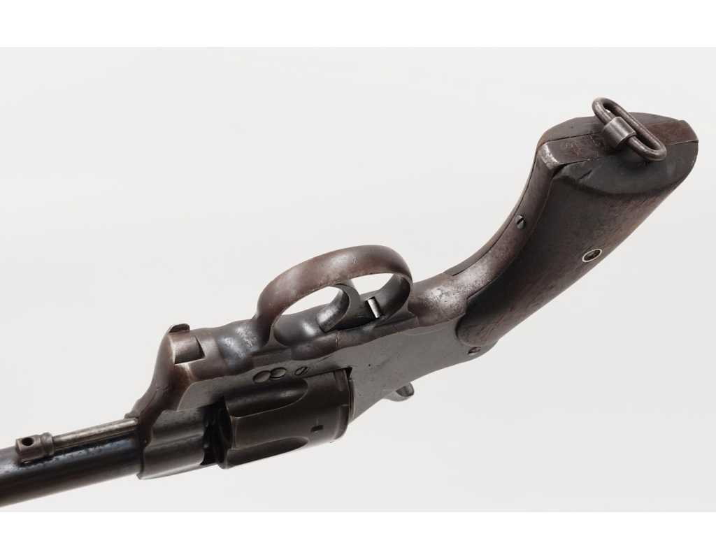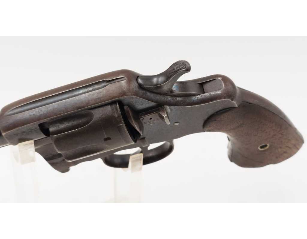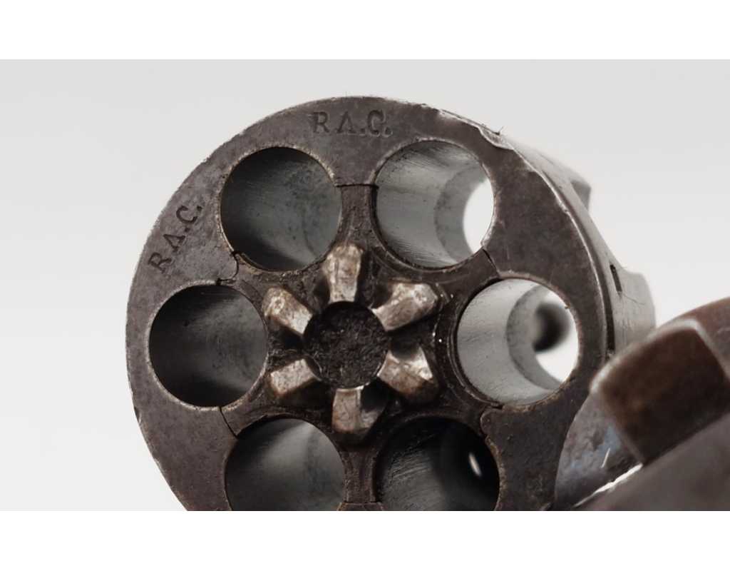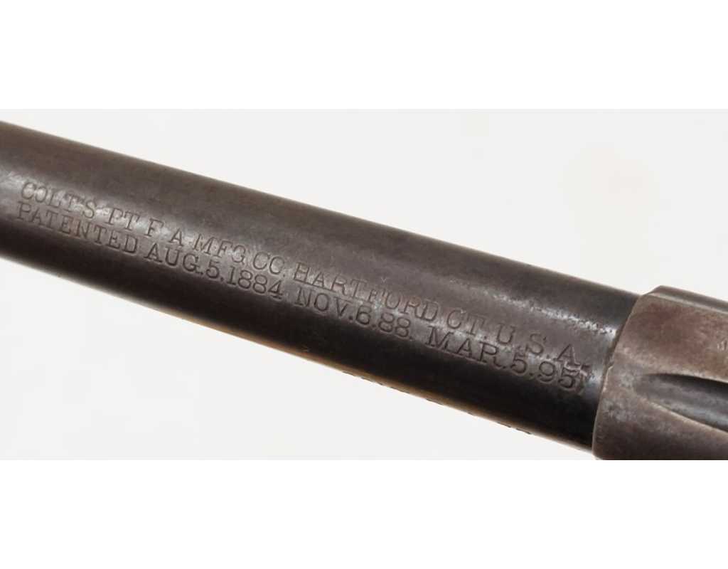 Revolver Colt Modele 1894 US ARMY Numéroté 103289, capacité de 6 coups simple et double action en calibre 38 Long Colt (357"), sortie de barillet à 9.5mm fond de rayures 9.14mm. Bronzage d'époque première guerre patiné sans oxydation, beaux marquages sur le canon avec brevet et indication du calibre non atténués, marquage du contrôleur RAC à la place du logo Colt que l'on retrouve sur le barillet, sur la face arrière du barillet et sous le canon. Mécanisme complet au fonctionnement irréprochable avec toutes pièces d'origine bien frappé du même numéro d'assemblage 3289, pas d'entre fer excessif entre le canon et le barillet, excellent verrouillage sans jeu, indexation parfaite. Canon de 6" remplacé en arsenal en 1917 pour pallier au manque d'armement des troupes extérieurs arrivées en France, poinçon du contrôleur L.E.B. côté gauche de la carcasse (manque le L), très belles rayures bien nettes non usagées d'aspect brillantes miroir sans tache. Plaquettes de crosse en noyer usagées.