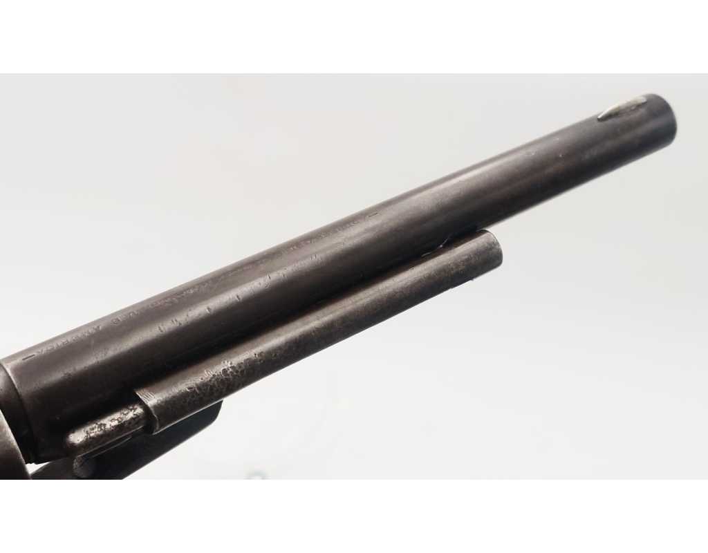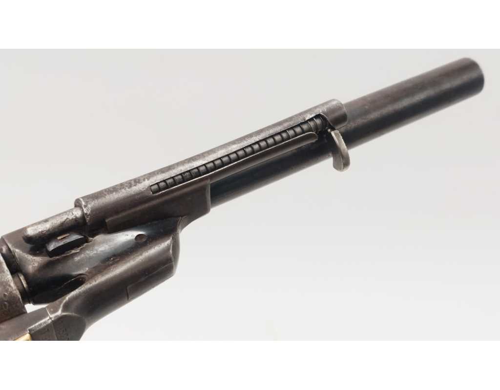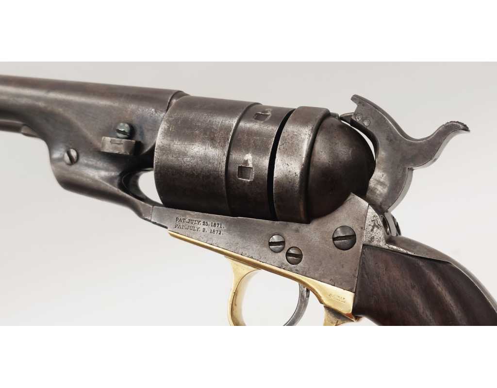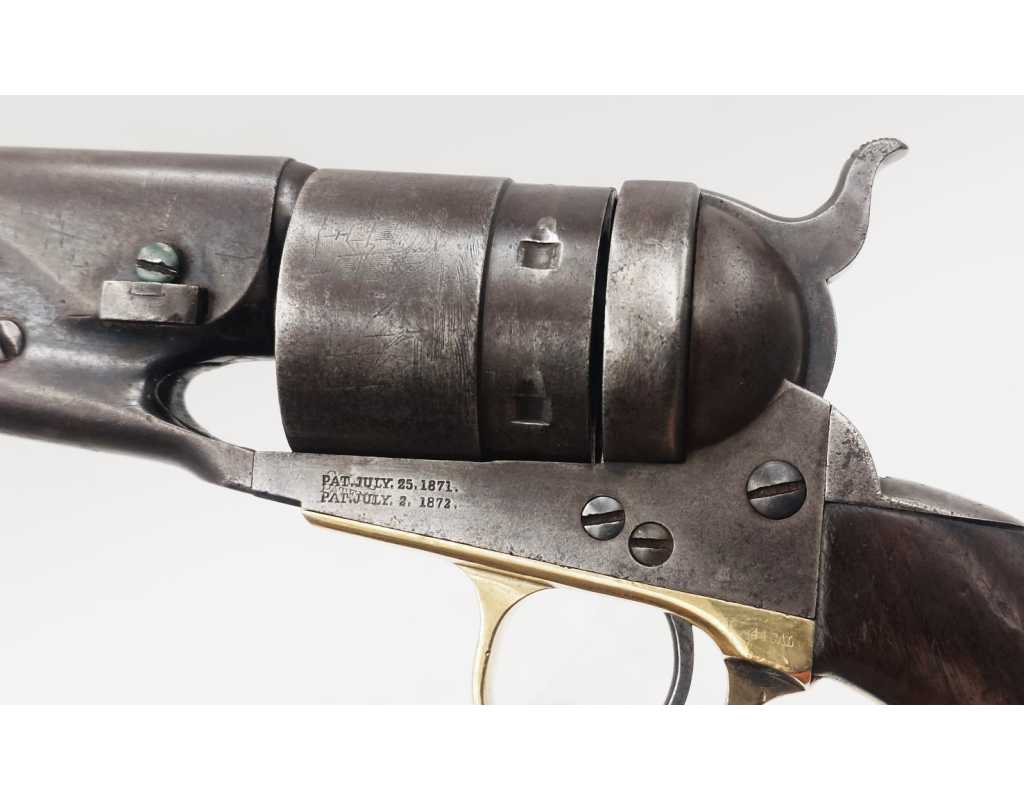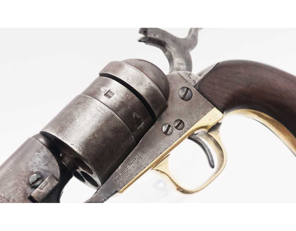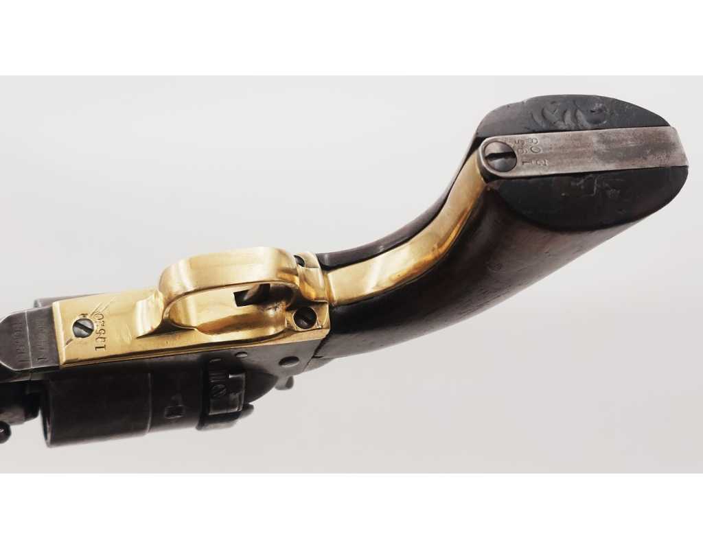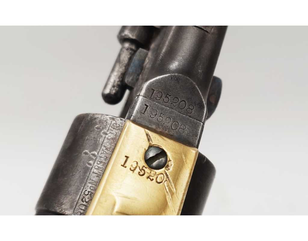 Rare revolver Colt modèle 1860 Army Conversion Richards en calibre 44 percussion centrale de 1873 à 1878, environ 9000 exemplaires, numéroté 195208 produit en 1871. Finition d'origine dans une belle patine homogène, toutes les pièces d'origine au même numéro, marquages réglementaires bien visibles. Mécanisme sans jeu, bonne indexation et entrefer. Canon de 8 pouces à belles rayures encore bien nets, tachées par une légère croute d'oxydation qui devrait s'atténué après tir de quelques plombs.
