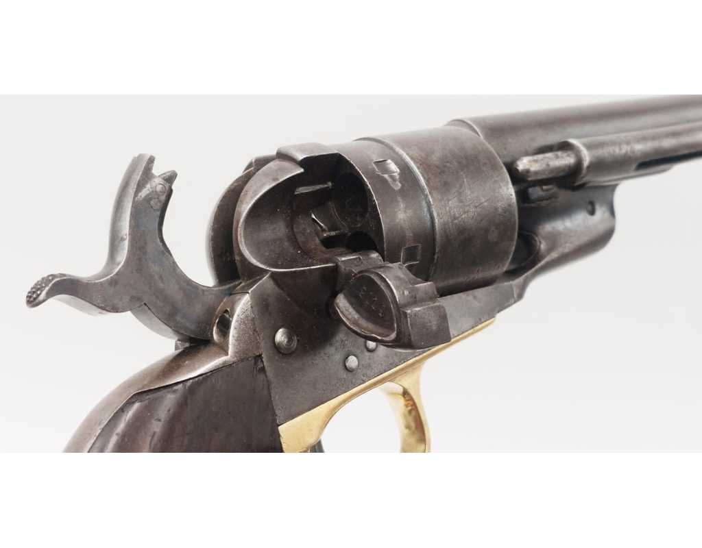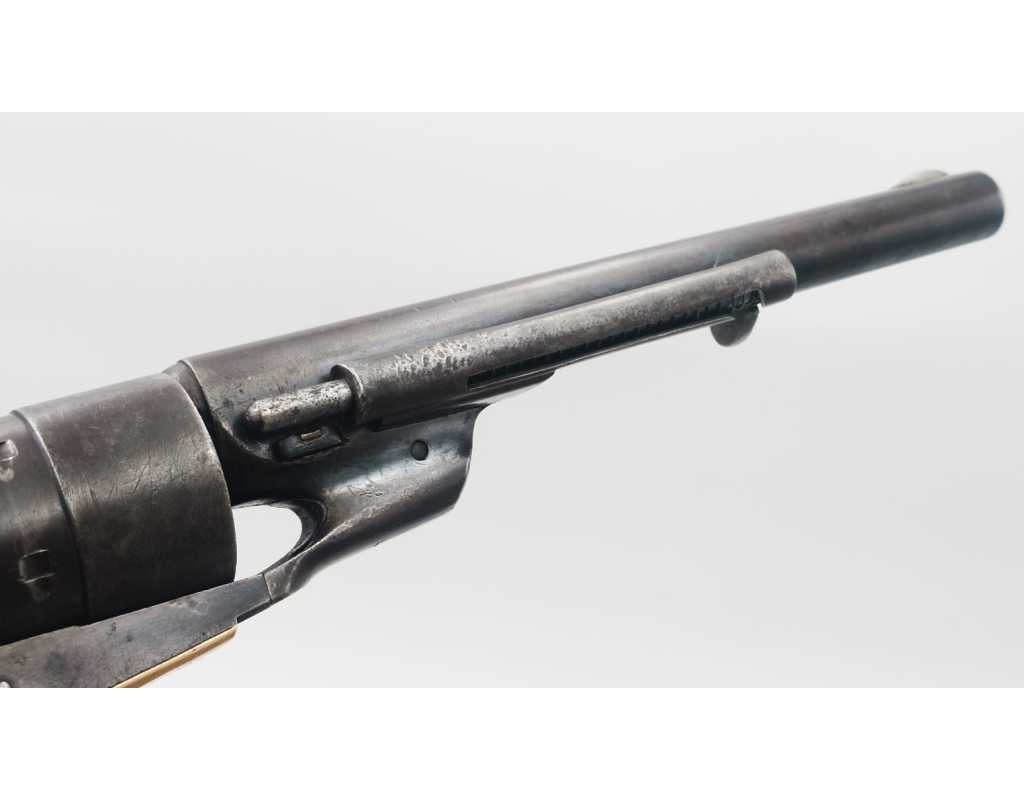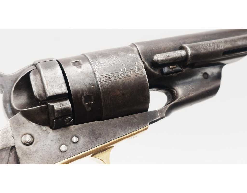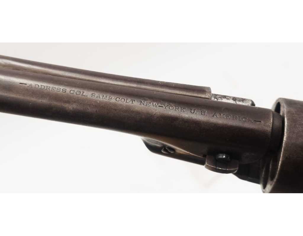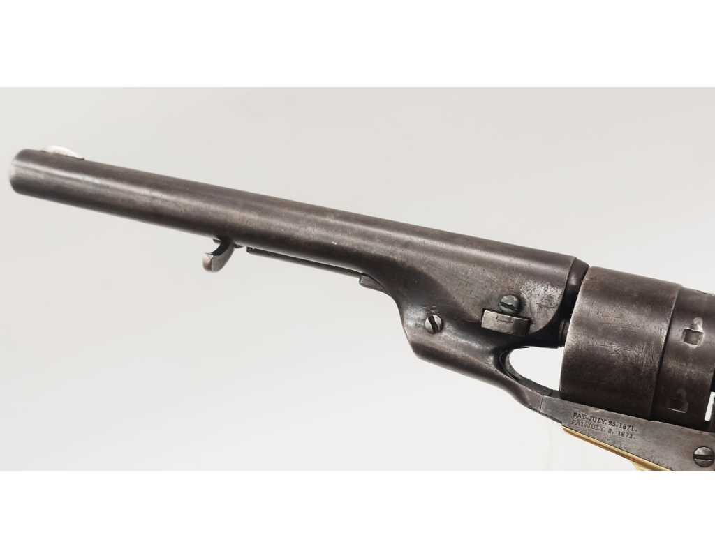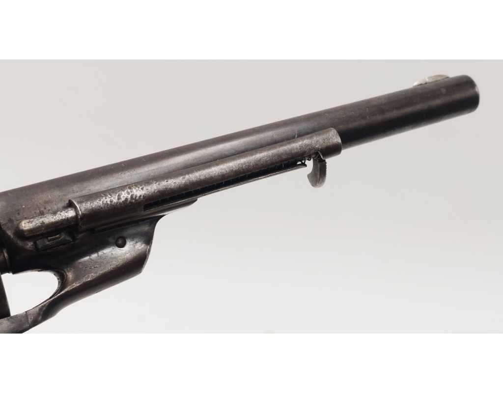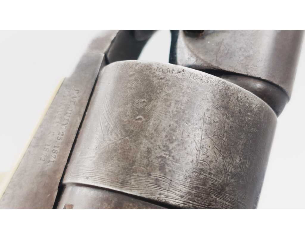Rare revolver Colt modèle 1860 Army Conversion Richards en calibre 44 percussion centrale de 1873 à 1878, environ 9000 exemplaires, numéroté 195208 produit en 1871. Finition d'origine dans une belle patine homogène, toutes les pièces d'origine au même numéro, marquages réglementaires bien visibles. Mécanisme sans jeu, bonne indexation et entrefer. Canon de 8 pouces à belles rayures encore bien nets, tachées par une légère croute d'oxydation qui devrait s'atténué après tir de quelques plombs.