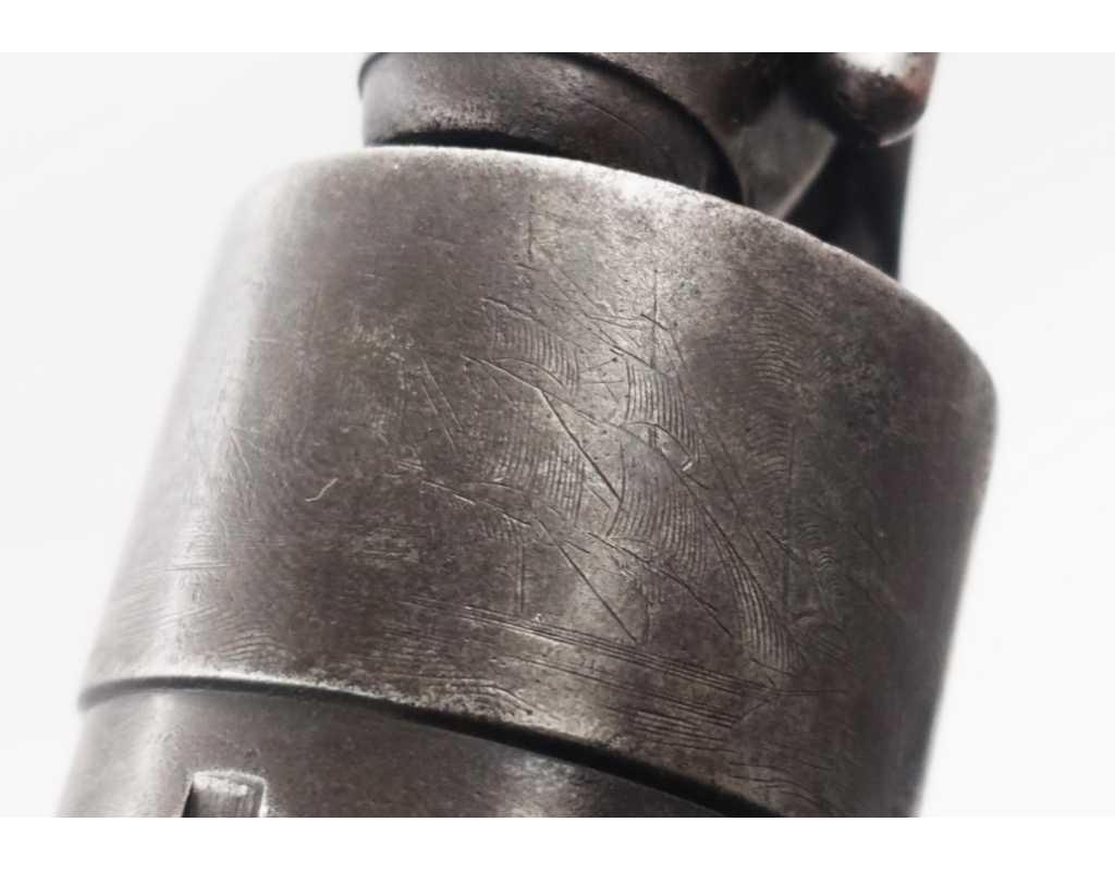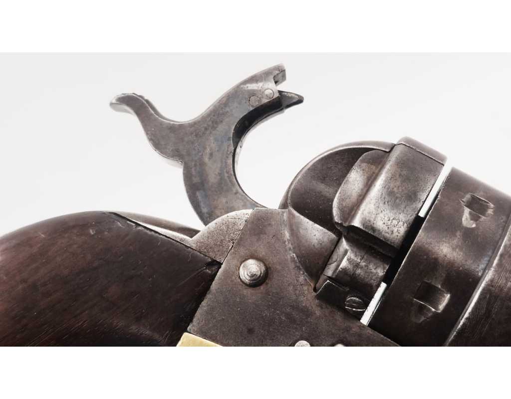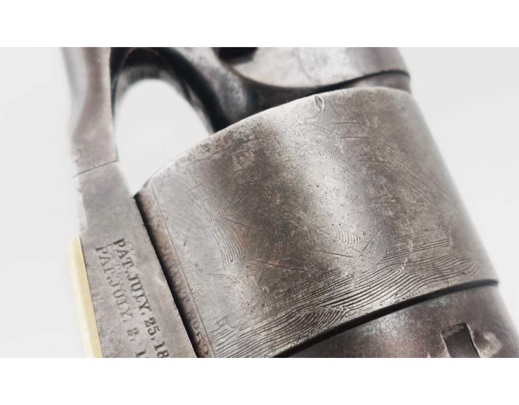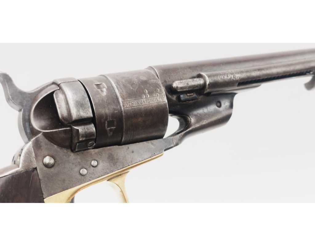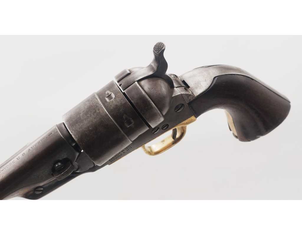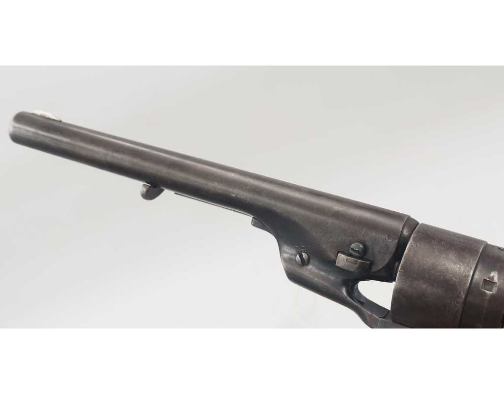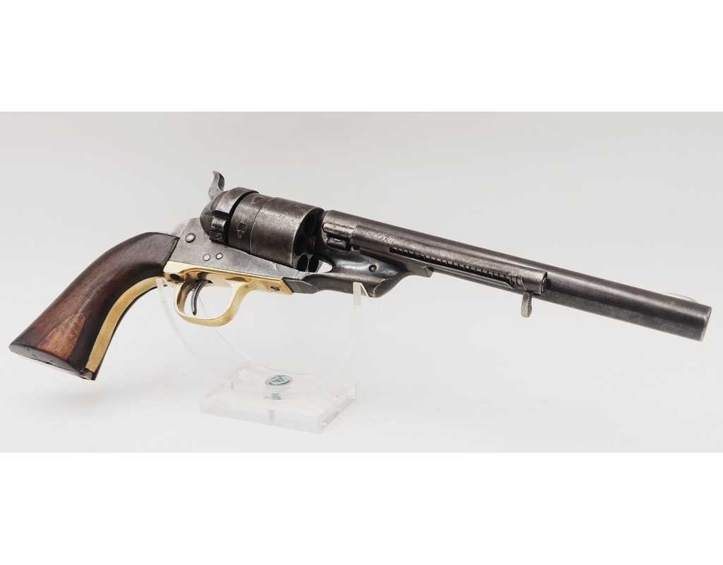 Rare revolver Colt modèle 1860 Army Conversion Richards en calibre 44 percussion centrale de 1873 à 1878, environ 9000 exemplaires, numéroté 195208 produit en 1871. Finition d'origine dans une belle patine homogène, toutes les pièces d'origine au même numéro, marquages réglementaires bien visibles. Mécanisme sans jeu, bonne indexation et entrefer. Canon de 8 pouces à belles rayures encore bien nets, tachées par une légère croute d'oxydation qui devrait s'atténué après tir de quelques plombs.