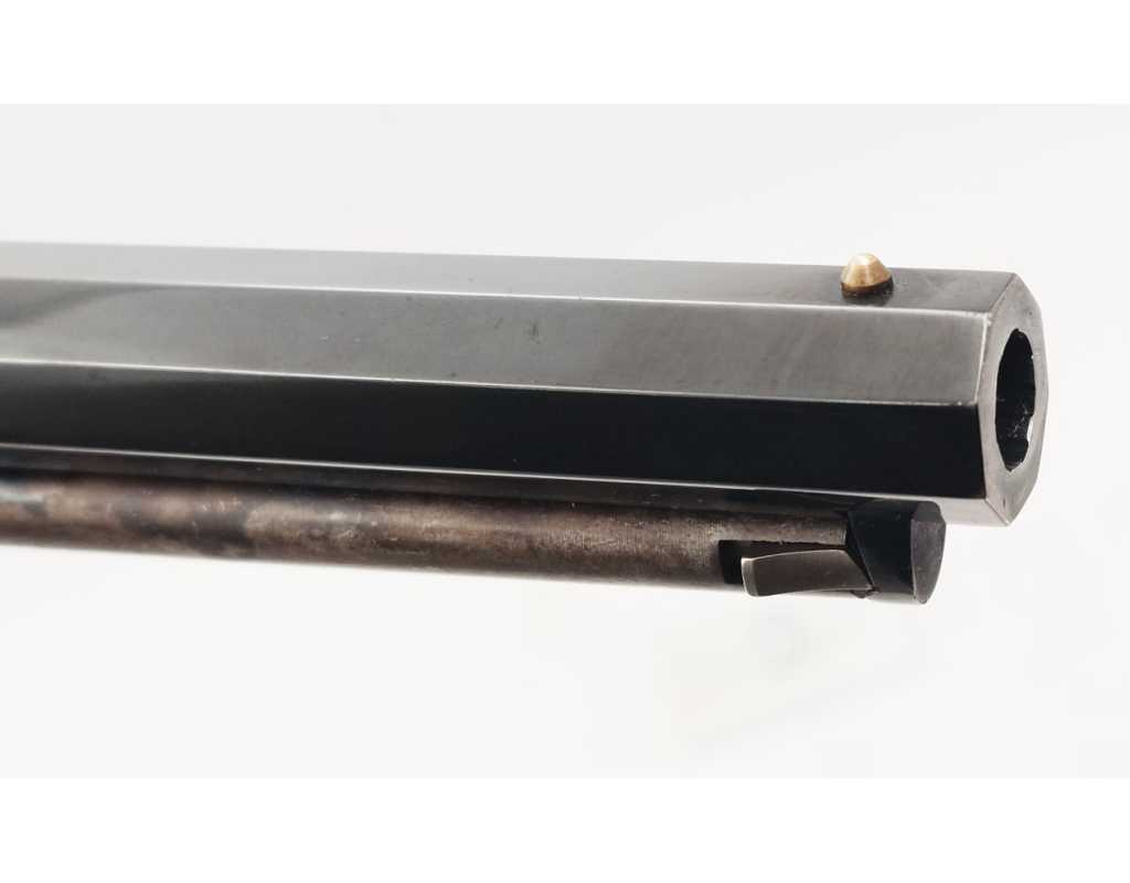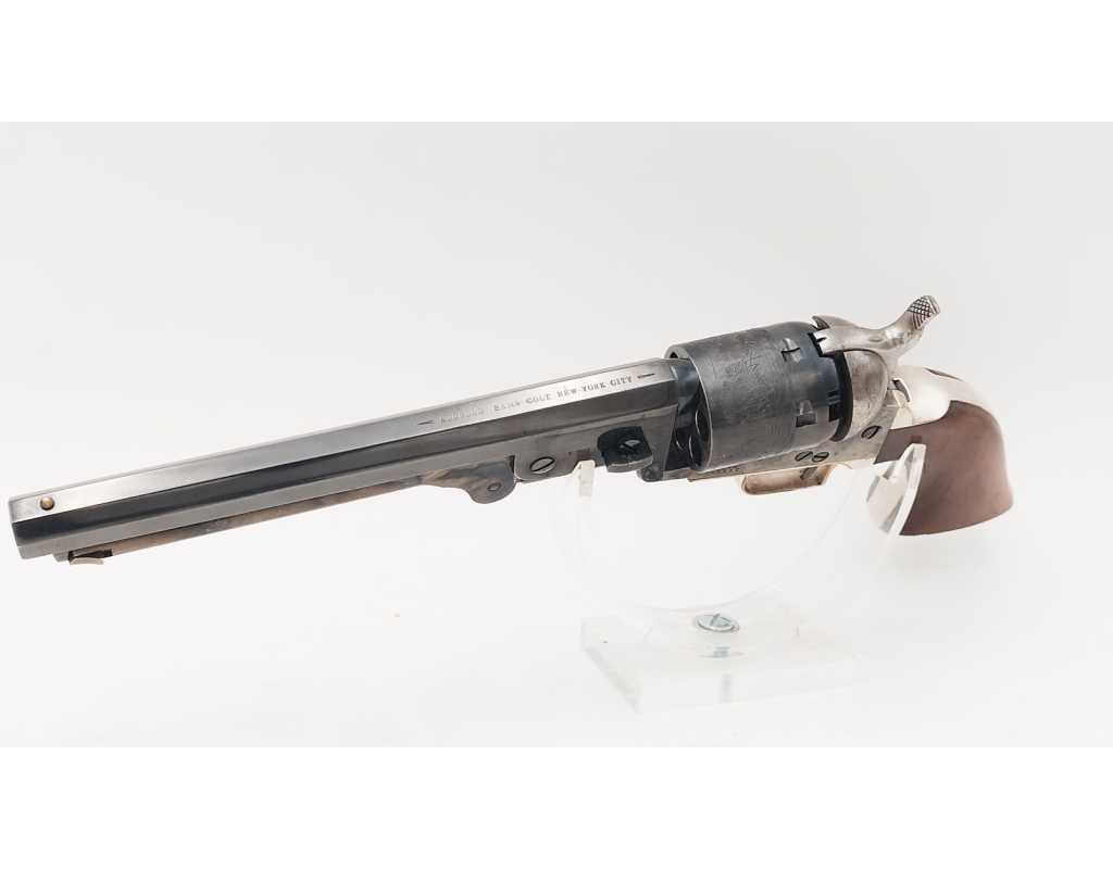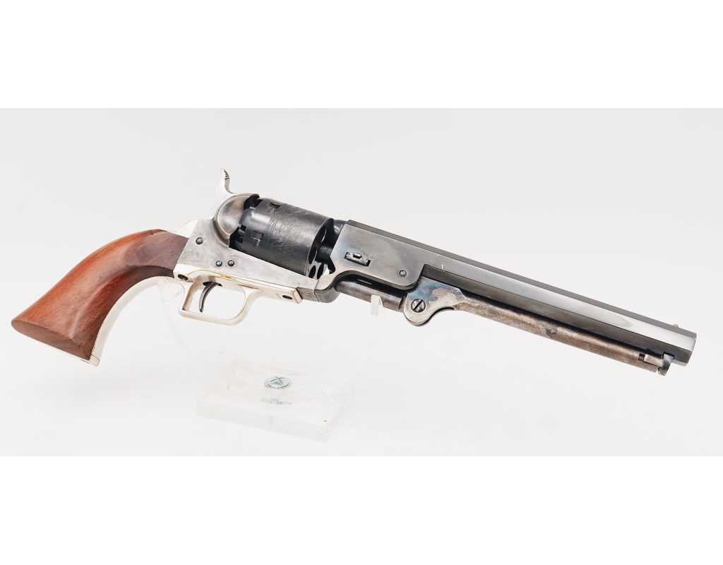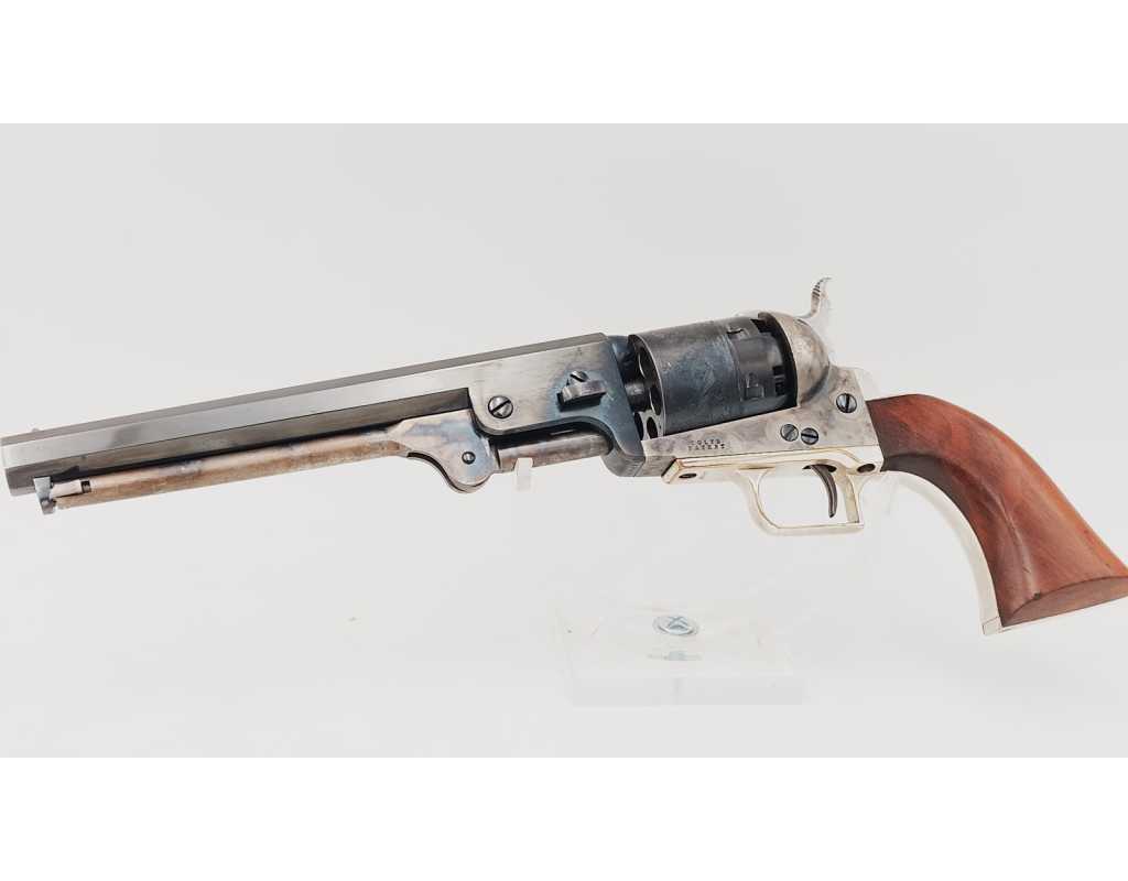Peu commun revolver Colt 1851 de la seconde génération produit à l'identique aux USA de 1971 à 1978, finition jaspée et bronzée sans usure, pontet et bride de crosse en laiton argenté, plaquette en bois clair, mécanisme sans jeu, rayures miroir canon octogonal de 19cm, marquages bien nets. 6 coups en simple action calibre 36 à percussion.