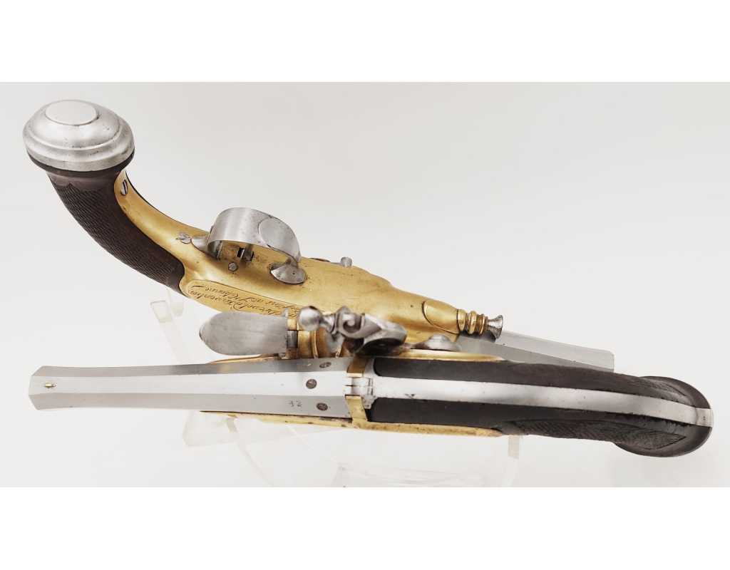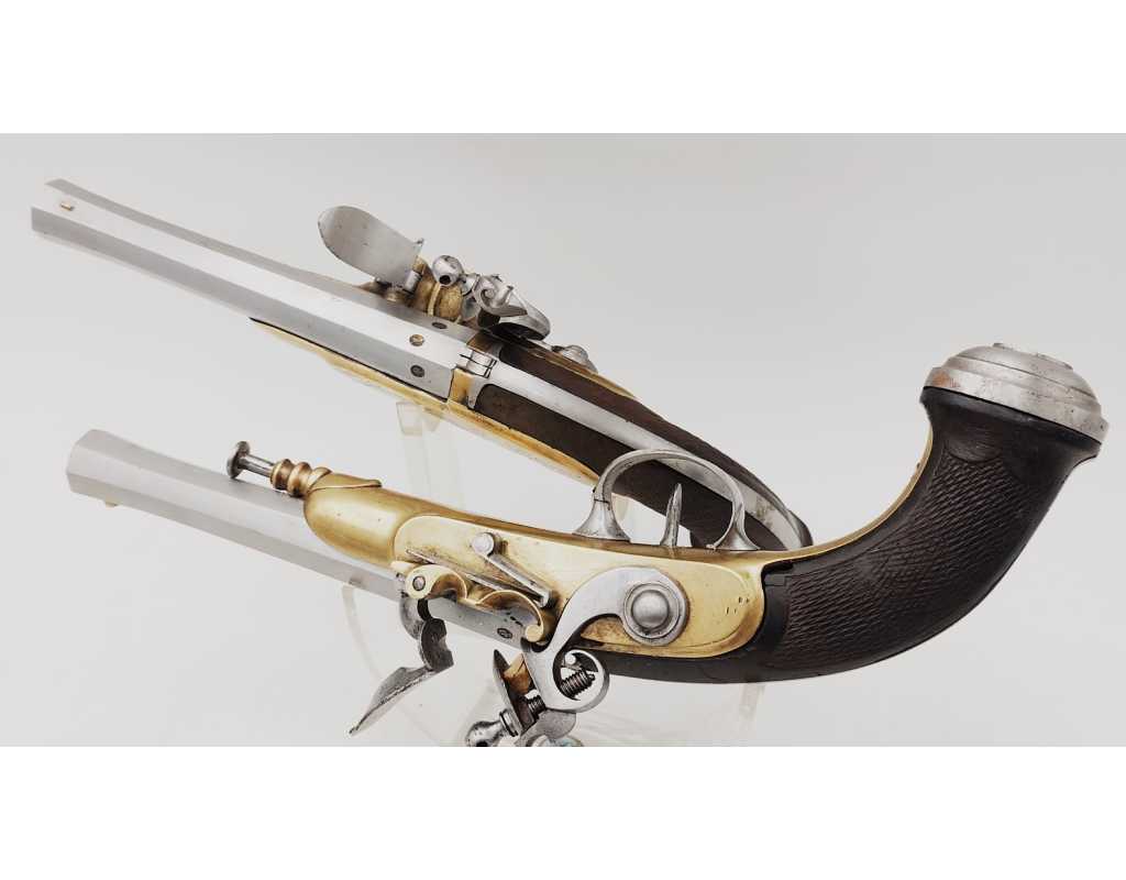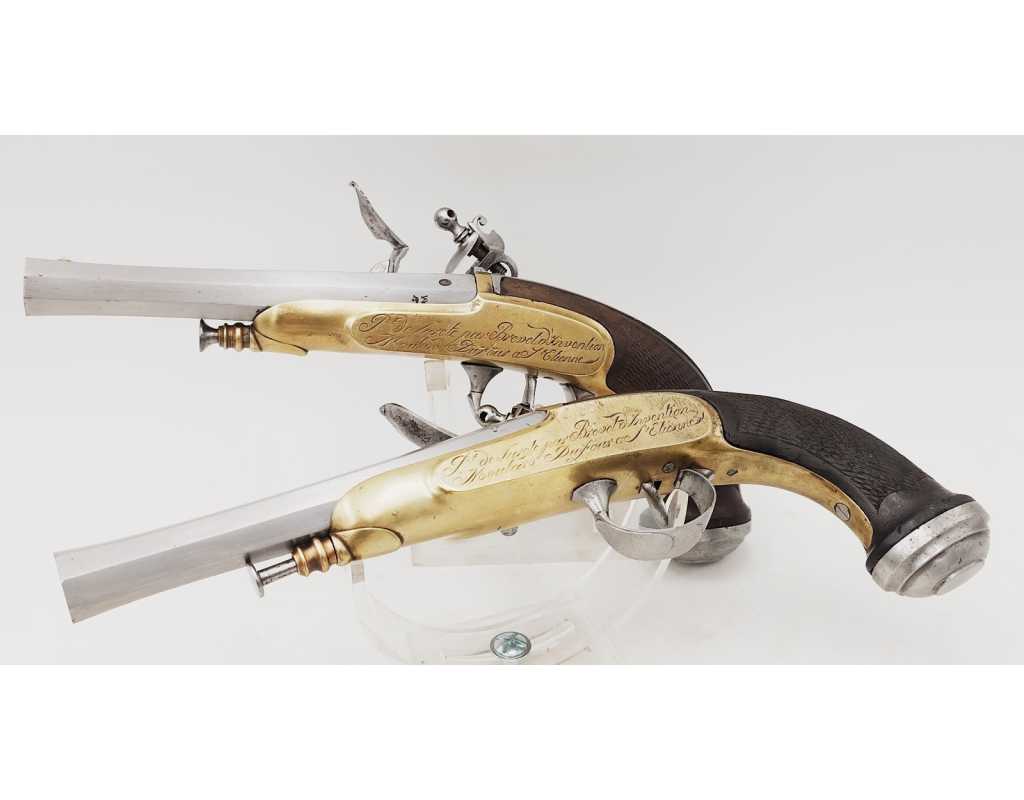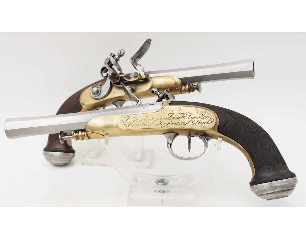Paire de pistolet à silex à coffre en laiton système brevet d'invention Moulard Dufour à Saint-Étienne. Mécanismes complet et fonctionnel contenus dans de gros coffre de laiton, chiens à col de cygne, canons à pans en fer maintenus par les baguettes d'entretien, long de 16,3cm à bouches tromblonnées, calibre 15,5mm à rayures cheveux, poinçonnés de Augustin Merley et du canonnier Leclerc. Hausses de visée et guidon laiton. Pontets, batteries et leurs ressorts, calottes et brides de crosse supérieur en fer sans oxydation. Crosses quadrillées en noyer blond, avec légère usures sans accident. L. totale 30cm