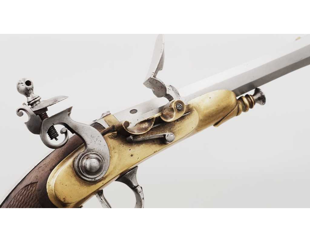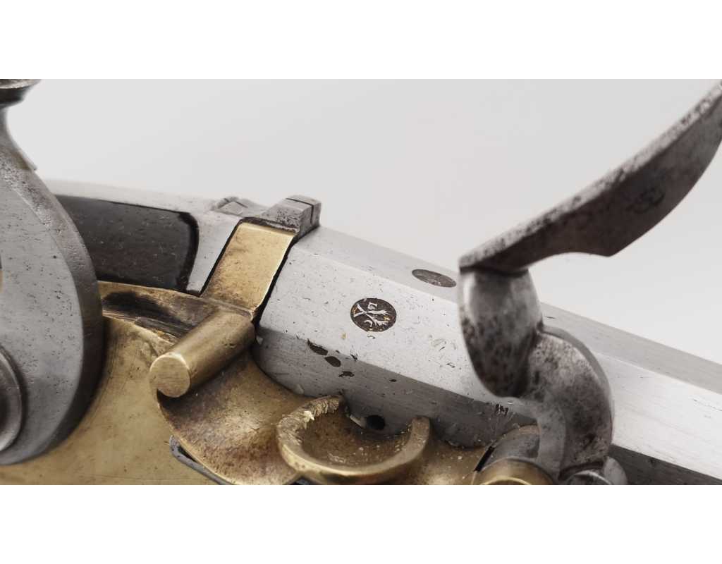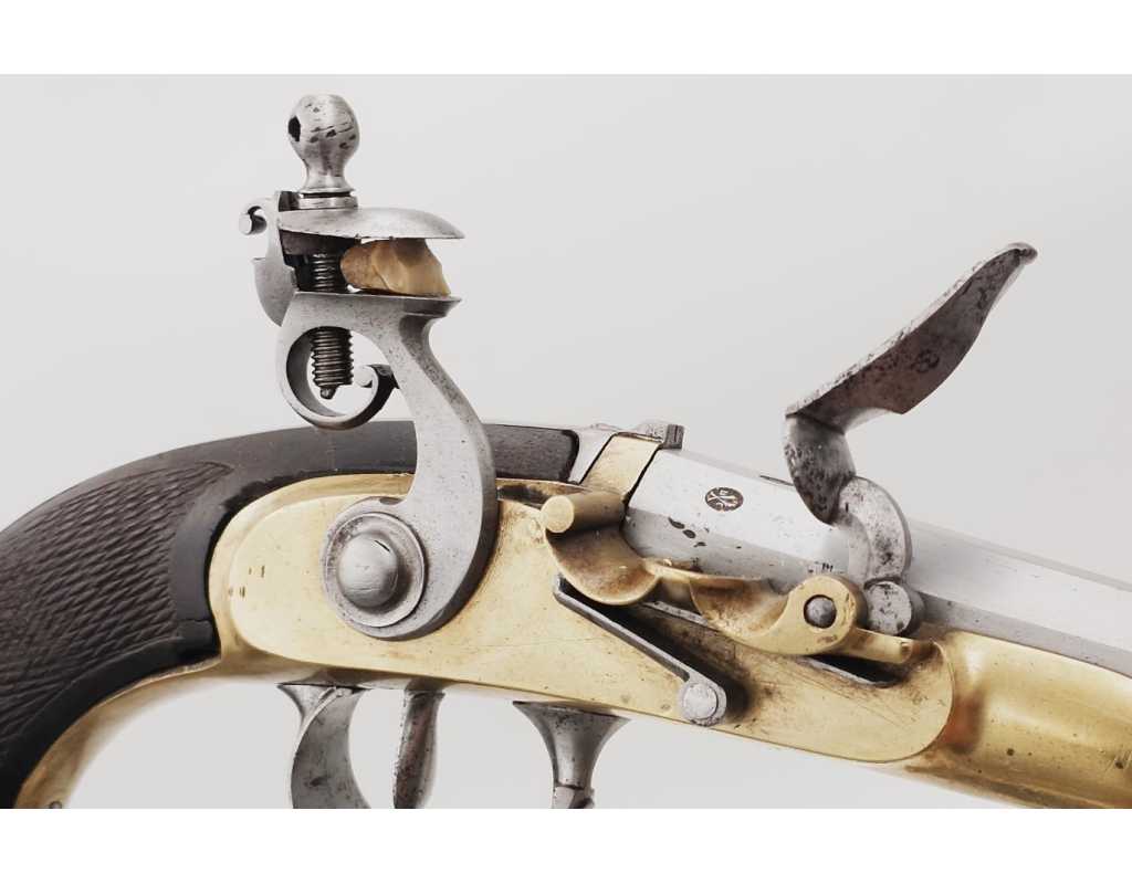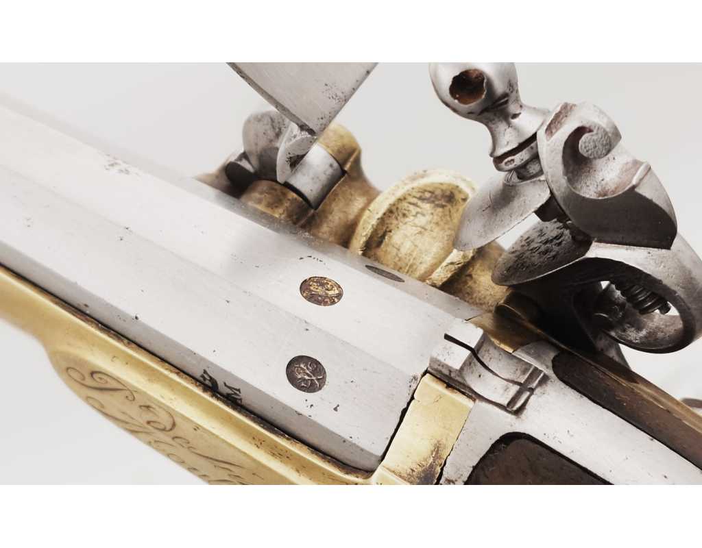 Paire de pistolet à silex à coffre en laiton système brevet d'invention Moulard Dufour à Saint-Étienne. Mécanismes complet et fonctionnel contenus dans de gros coffre de laiton, chiens à col de cygne, canons à pans en fer maintenus par les baguettes d'entretien, long de 16,3cm à bouches tromblonnées, calibre 15,5mm à rayures cheveux, poinçonnés de Augustin Merley et du canonnier Leclerc. Hausses de visée et guidon laiton. Pontets, batteries et leurs ressorts, calottes et brides de crosse supérieur en fer sans oxydation. Crosses quadrillées en noyer blond, avec légère usures sans accident. L. totale 30cm