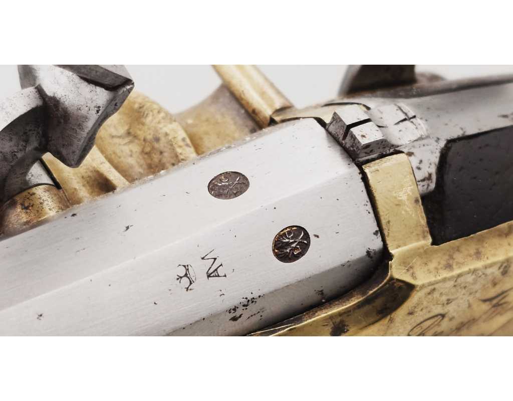 AM couronné : Augustin Merley, né en 1738 à Saint-Etienne, éprouveur du commerce (banc d’épreuve) en 1782, jusqu’en 1811, 1er Réviseur à la Manufacture en l’AN VI.