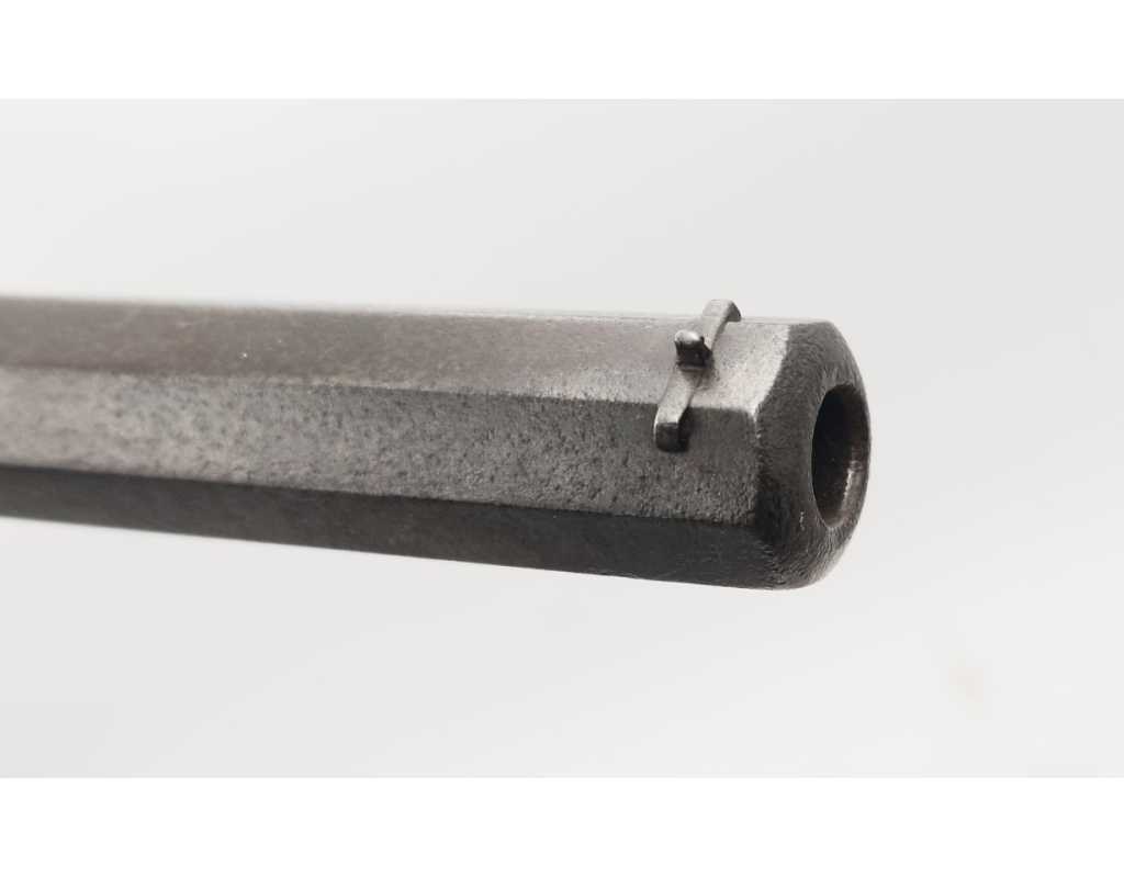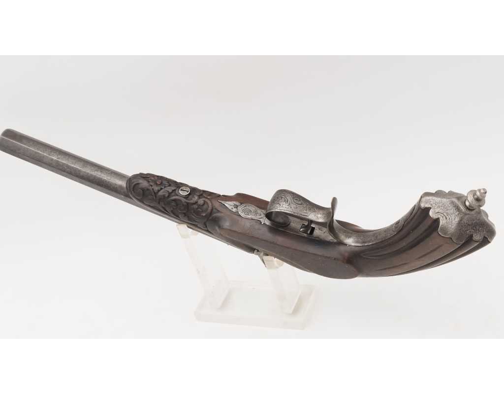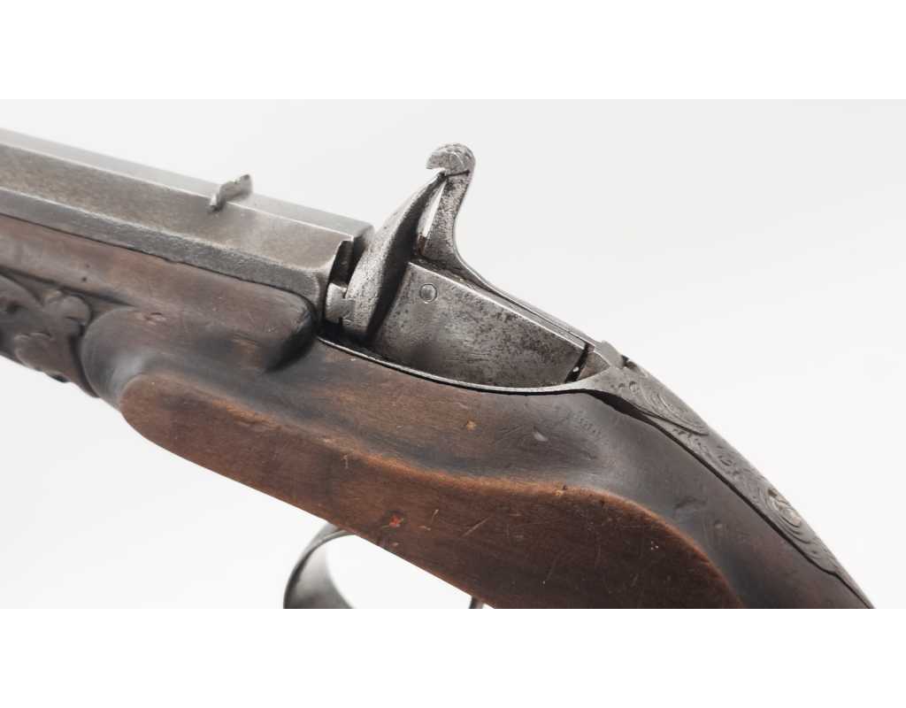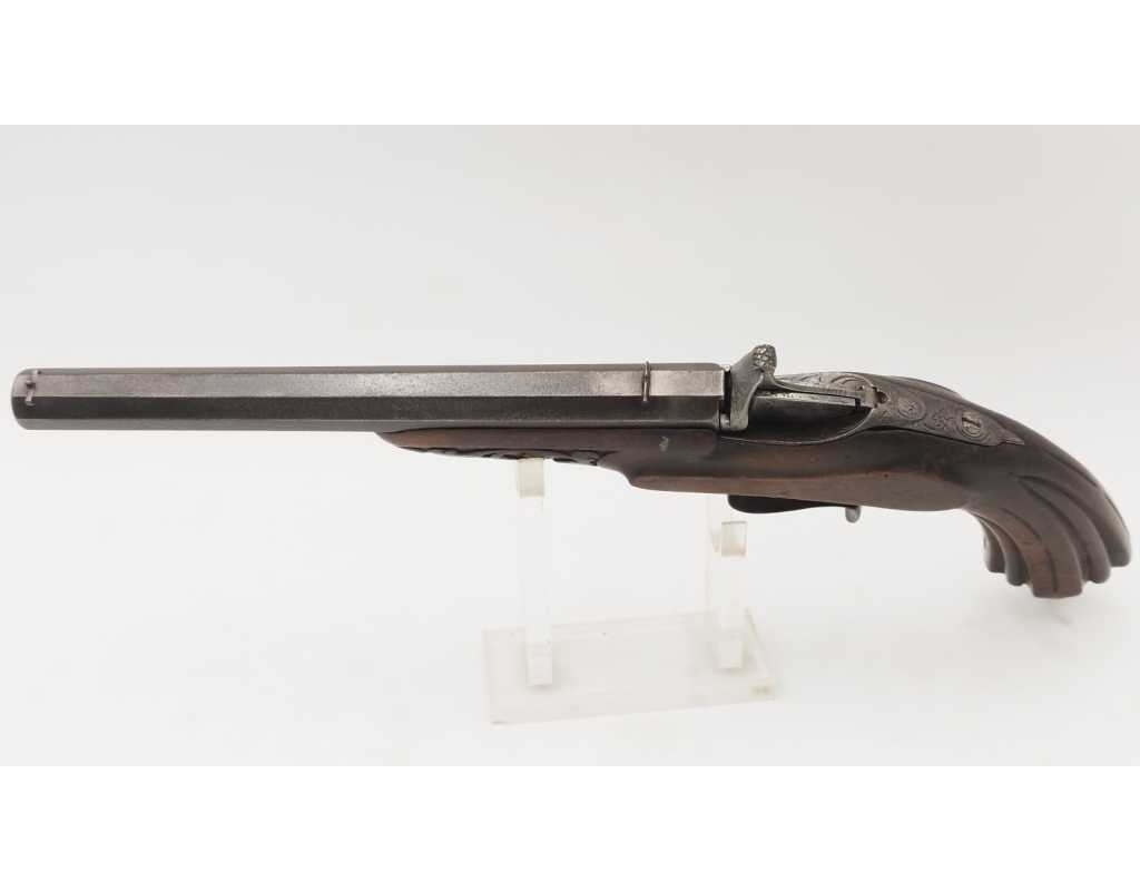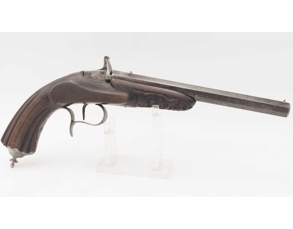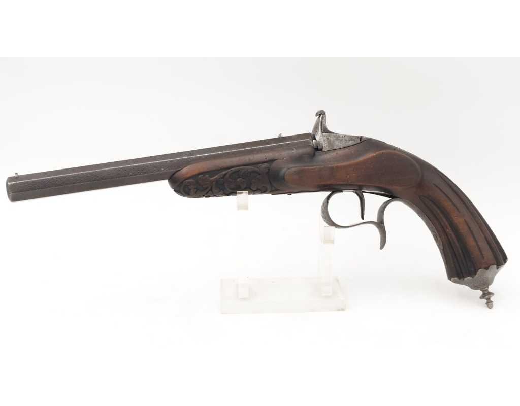 Pistolet de salon à un coup calibre 9mm flobert percussion annulaire. Crête de chien articulée, mécanisme fonctionnel, canon lisse sans corrosion, octogonal et long de 22cm avec hausse et guidon de visée. Longueur totale 38cm. Crosse en noyer type renaissance, sculptée de feuillage à l'avant, pontet à repose doigt.