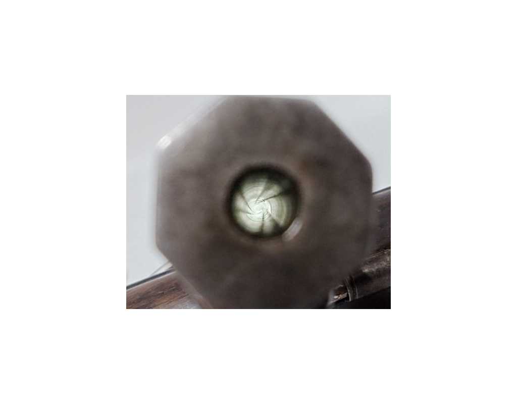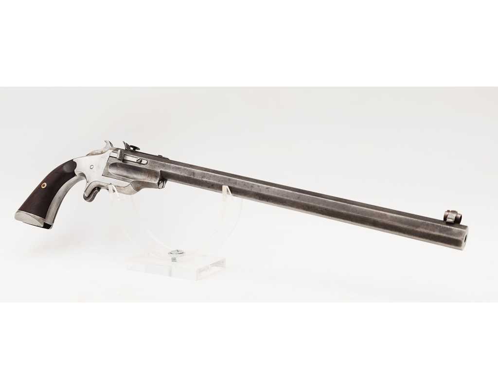 Pistolet de tir monocoup calibre 22 court Frank Wesson brevet de 1870 à canon pivotant, manque la crosse d'épaule. Finition d'origine patinée, canon octogonal de 32,5cm, rayures sans usure particulière légèrement tachées. Plaquettes de crosse en bois de rose. Mécanisme complet et fonctionnel. Hausse réglable et guidon dérivable. Longueur totale 415mm