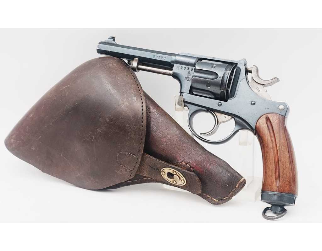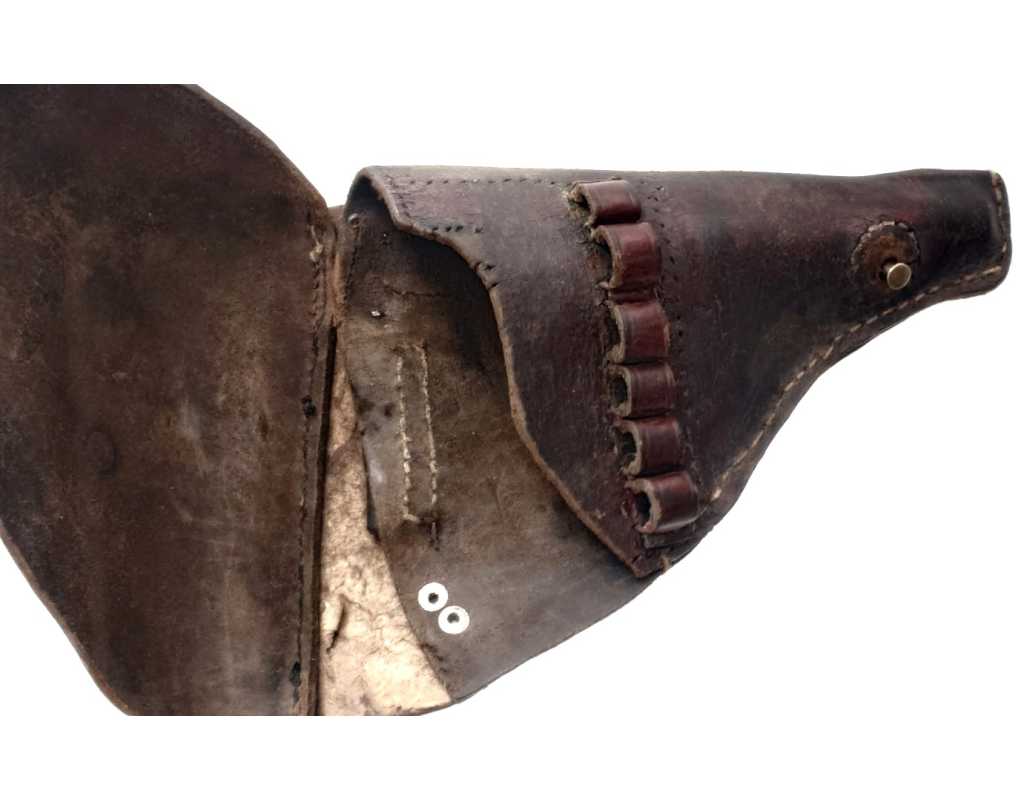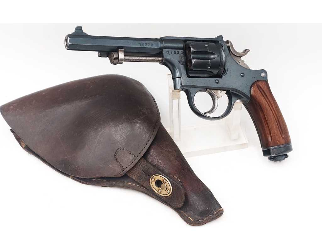 Revolver Suisse modèle 1882 trouvé dans un étui cuir à tampon de réception militaire dans l'est de la France surement utilisé par un résistant en hiver 1944, calibre 7,5mm dans son bronzage d'origine sans usure ni oxydation, mécanisme complet et fonctionnel sans aucun jeu, toutes pièces au même numéro, plaquette de crosse en noyer cannelées, pièces mécanique dans leurs coloration jaunie. Canon à rayures d'aspect miroir sans usure ni tache.
