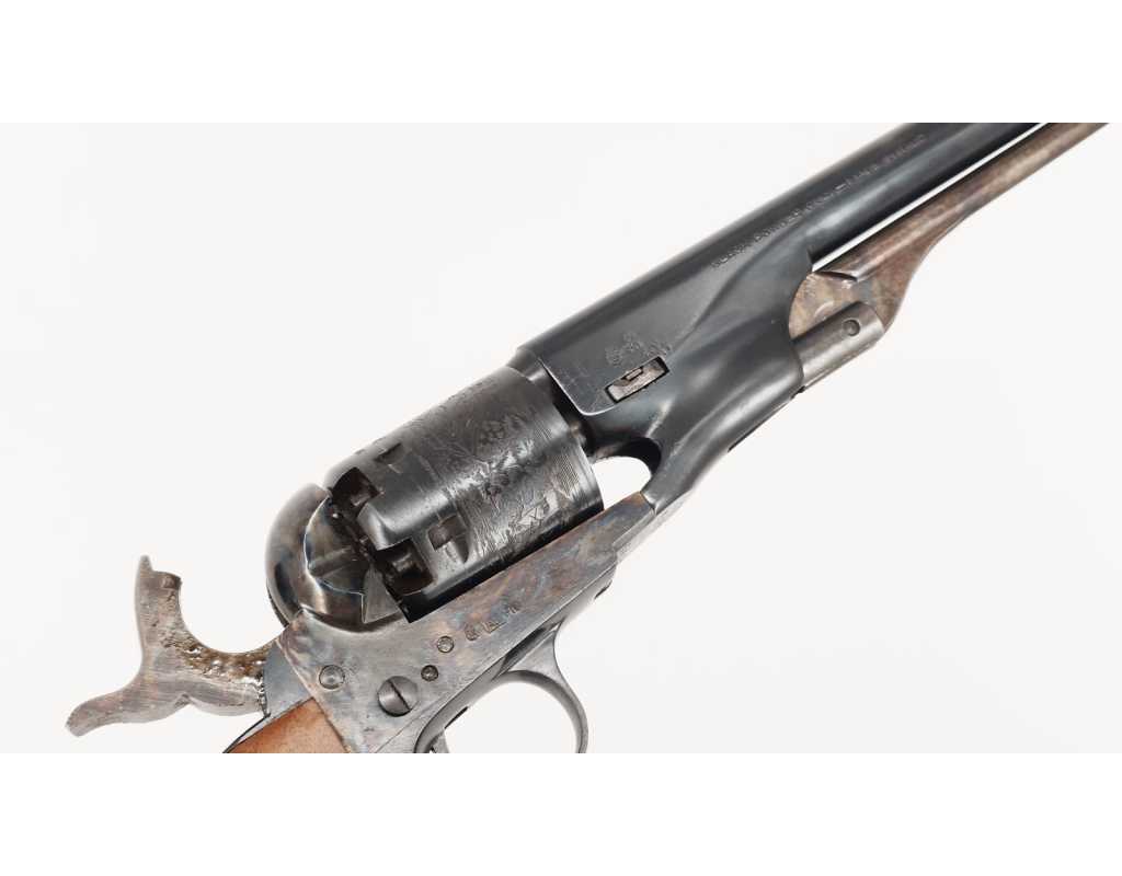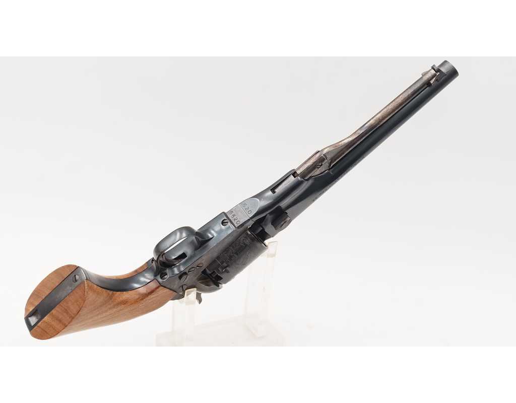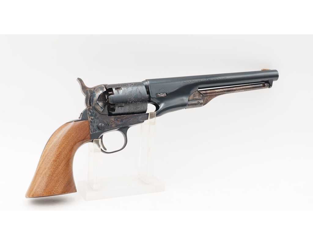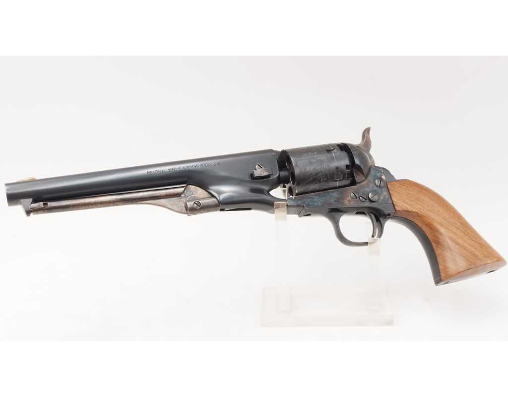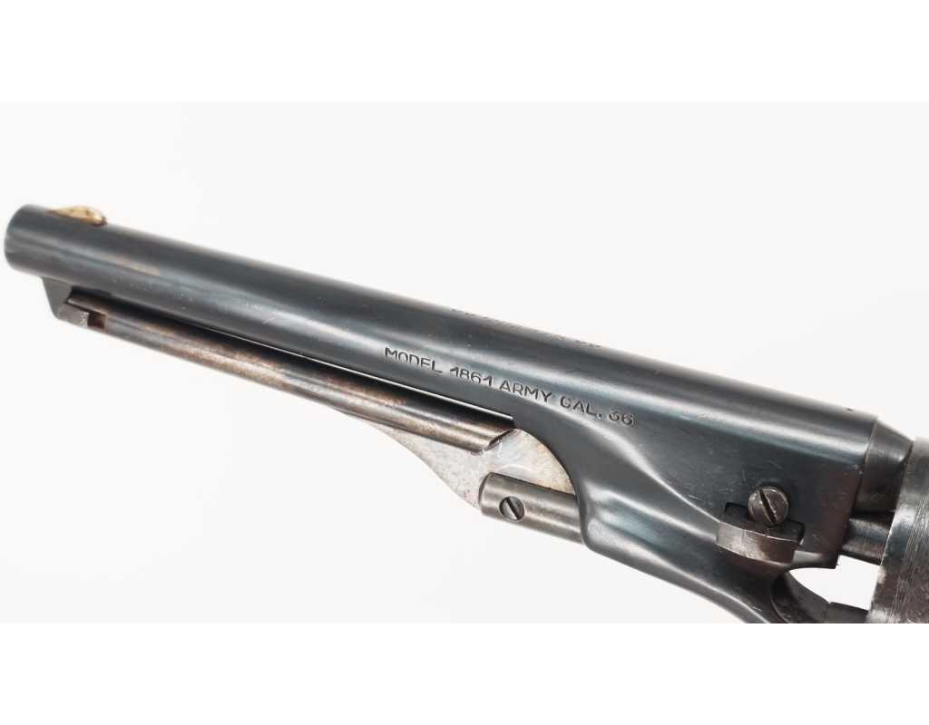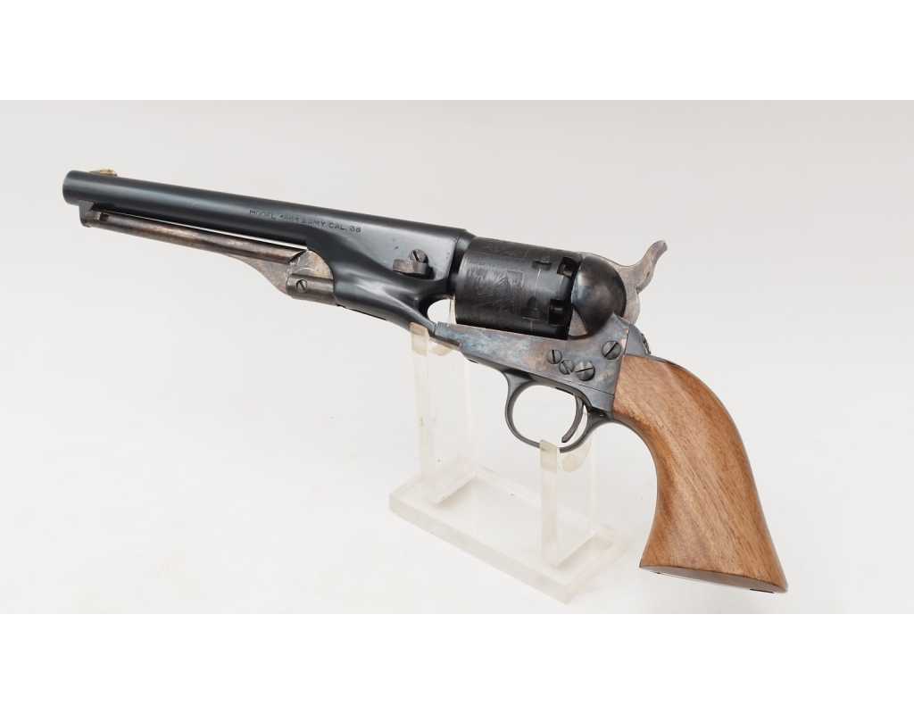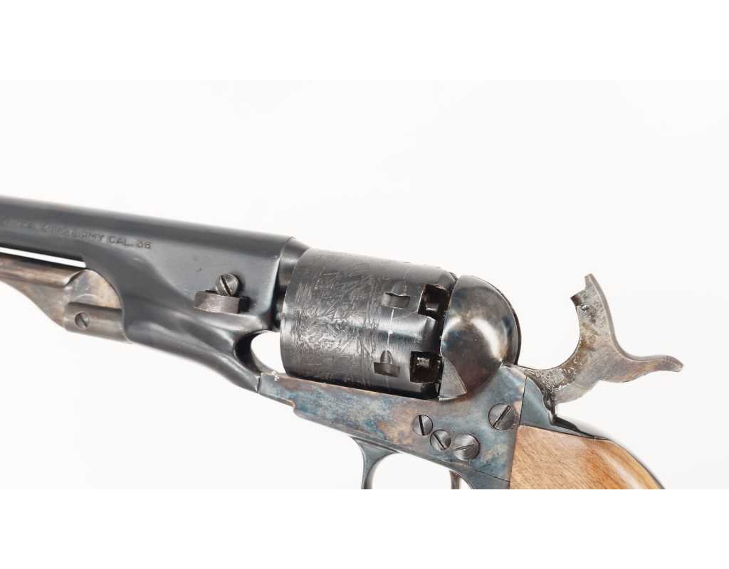 Revolver Coltman modèle 1961 Army calibre 36 à percussion, finition gravée jaspée et bronzée sans usure, mécanisme parfaitement fonctionnelle, rayures sans usure particulière, crosse noyer. Attache de crosse au talon et sur la carcasse.