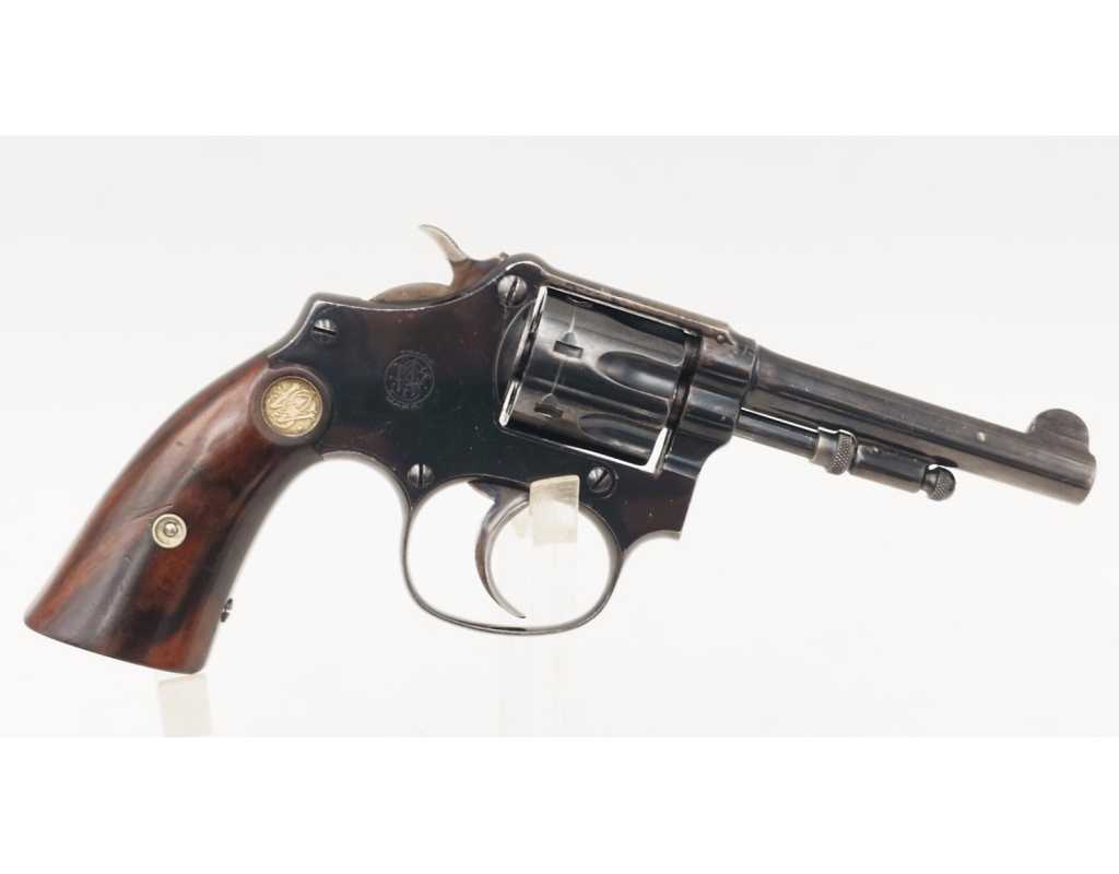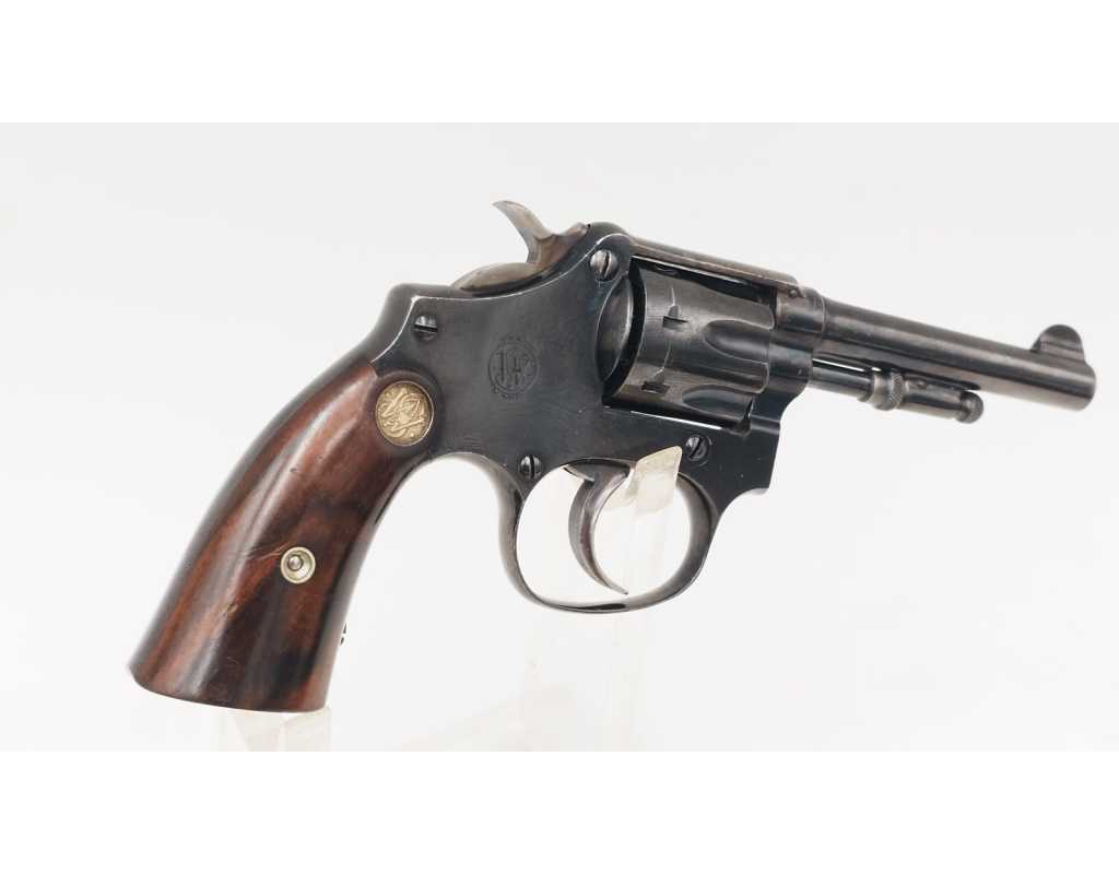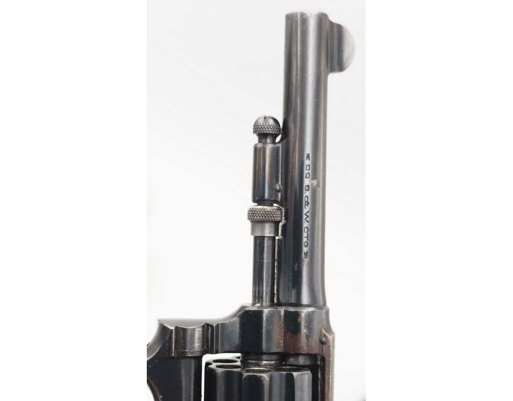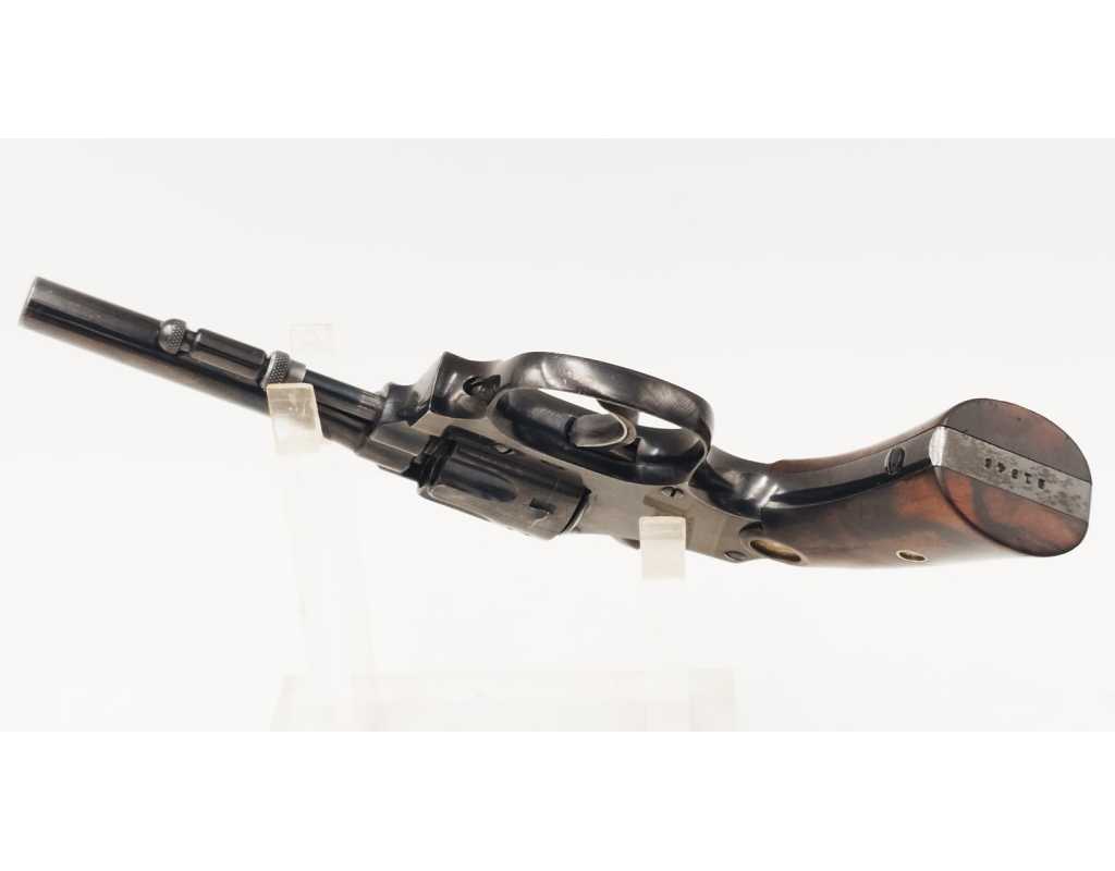 Mécanisme complet et parfaitement fonctionnel avec toutes pièces d'origine, entre fer non excessif, aucun jeu au verrouillage, indexation des chambres parfaite, barillet basculant à gauche, cran d'armé, demi-armé bien marqués, ressorts bien ferme. Canon long de 83mm, belles rayures peu usagées d'aspect brillante avec une tache en son milieu. Plaquettes en noyer d'origine estampillées du logo S&W en laiton doré, non accidentées.