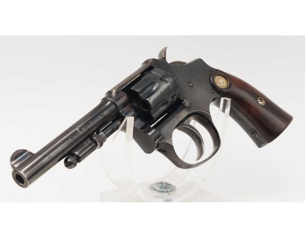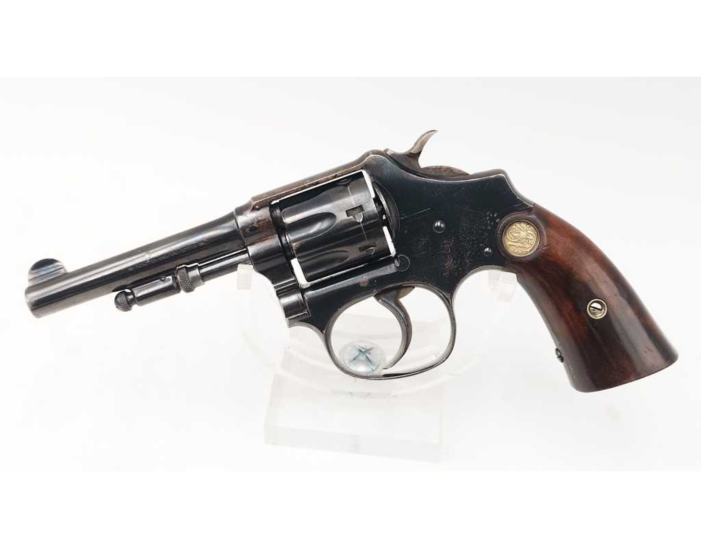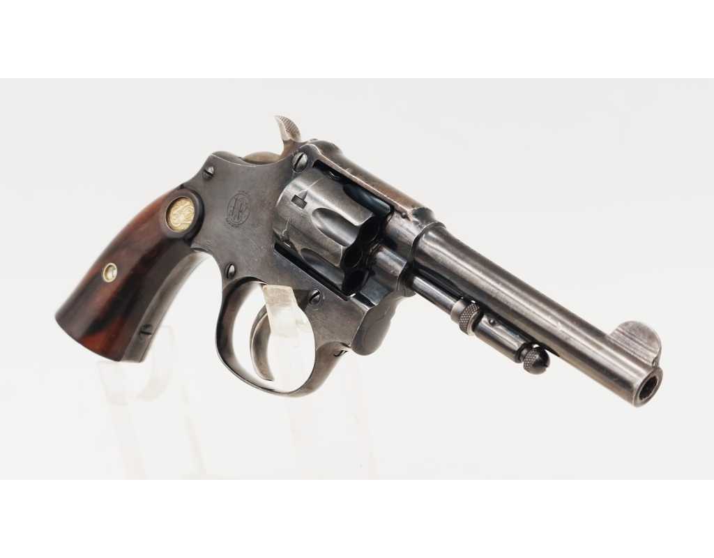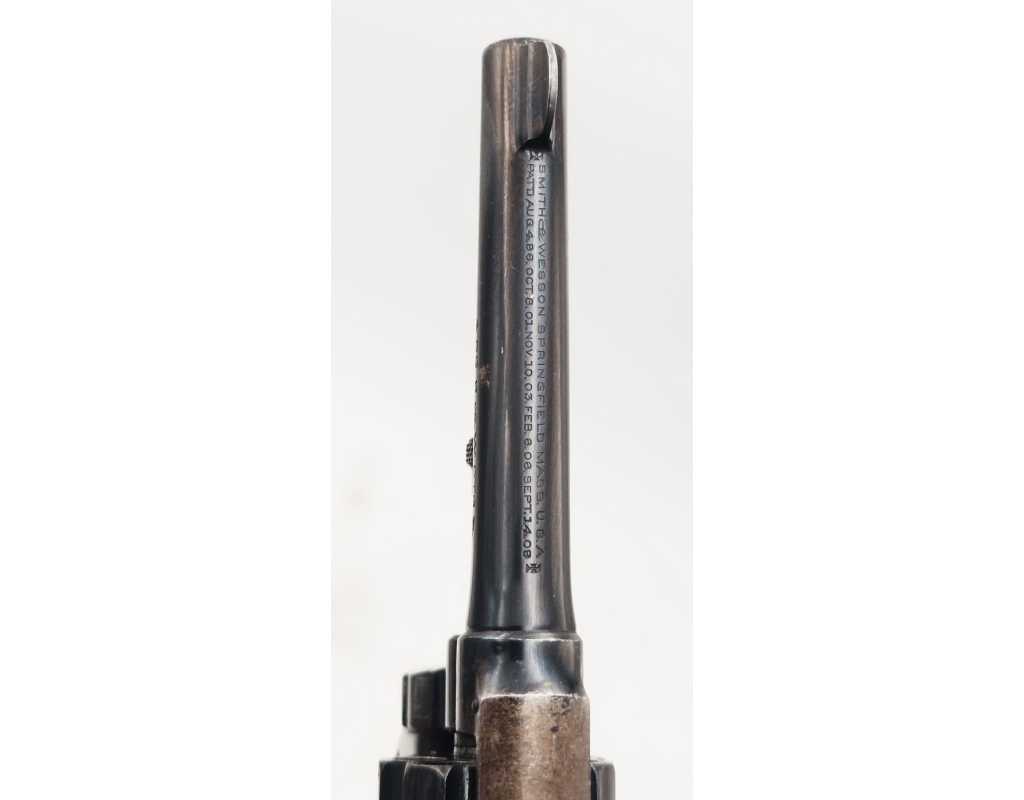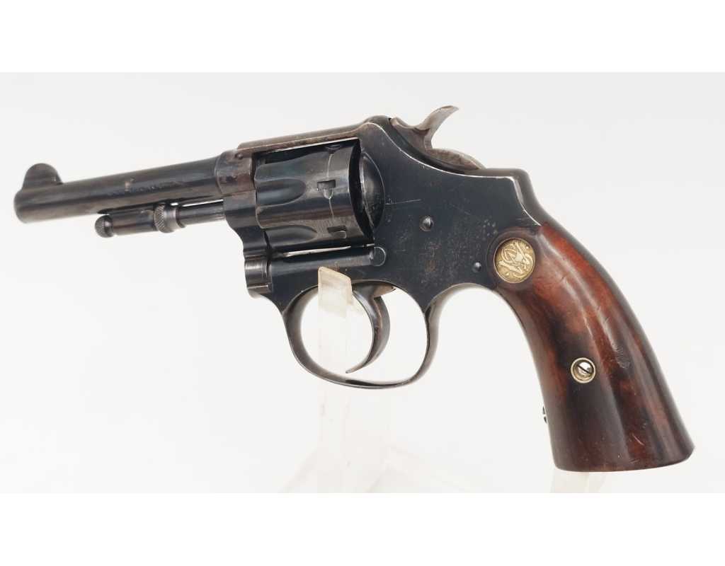 Mécanisme complet et parfaitement fonctionnel avec toutes pièces d'origine, entre fer non excessif, aucun jeu au verrouillage, indexation des chambres parfaite, barillet basculant à gauche, cran d'armé, demi-armé bien marqués, ressorts bien ferme. Canon long de 83mm, belles rayures peu usagées d'aspect brillante avec une tache en son milieu. Plaquettes en noyer d'origine estampillées du logo S&W en laiton doré, non accidentées.