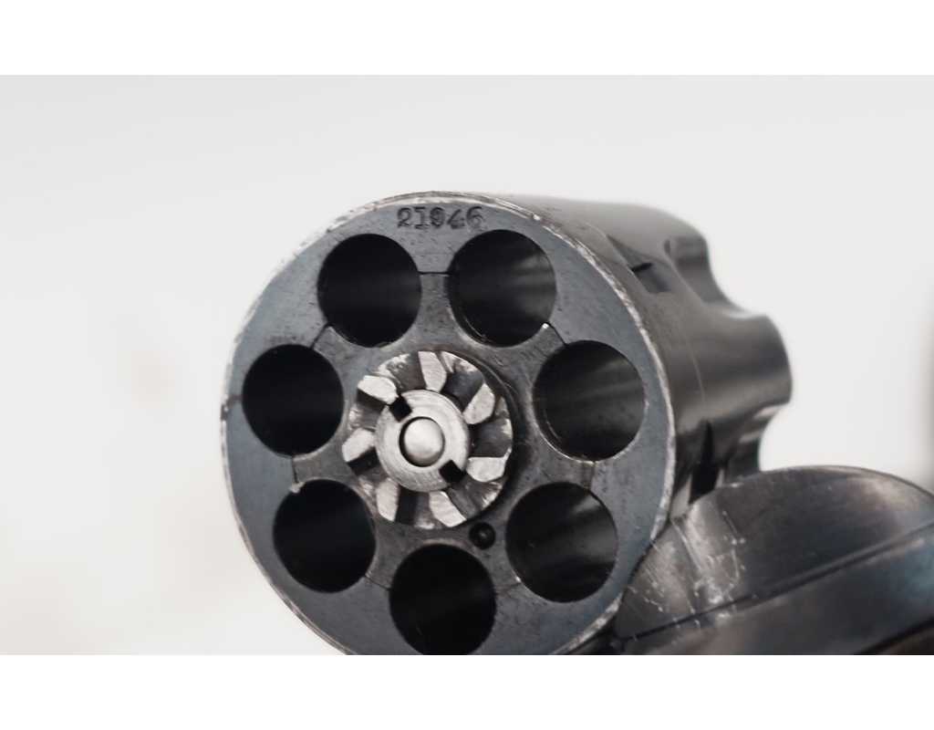 Revolver Smith & Wesson Ladysmith 3e modèle en calibre 22 long, numéro de série 21946, capacité 7 coups en simple et double action. Bronzage d'origine légèrement patiné sans aucune oxydation. Logo Smith & Wesson sur le côté droit, patent et indication du calibre sur le canon non atténués. Jaspage d'origine sur le chien et la détente bien présent.