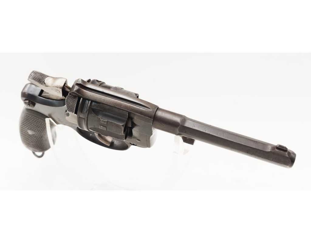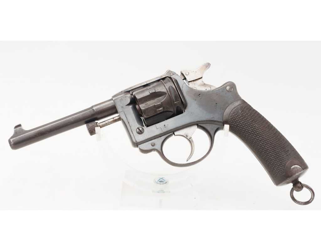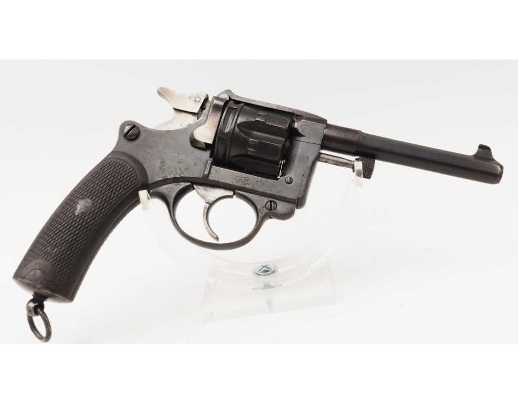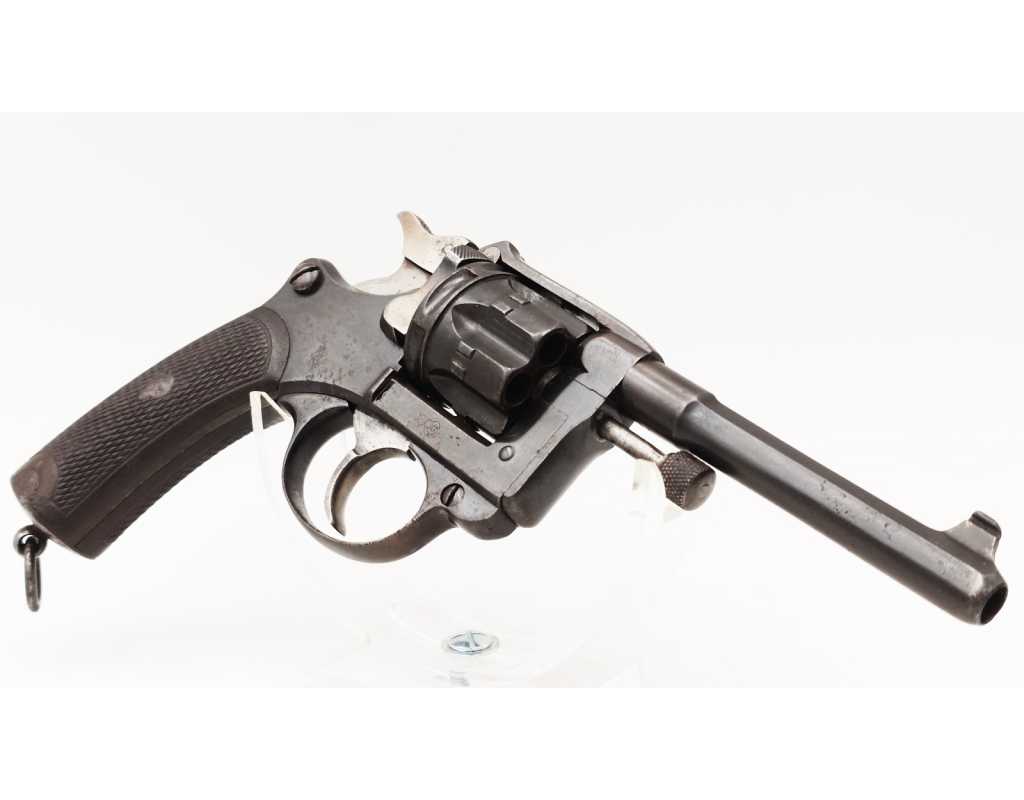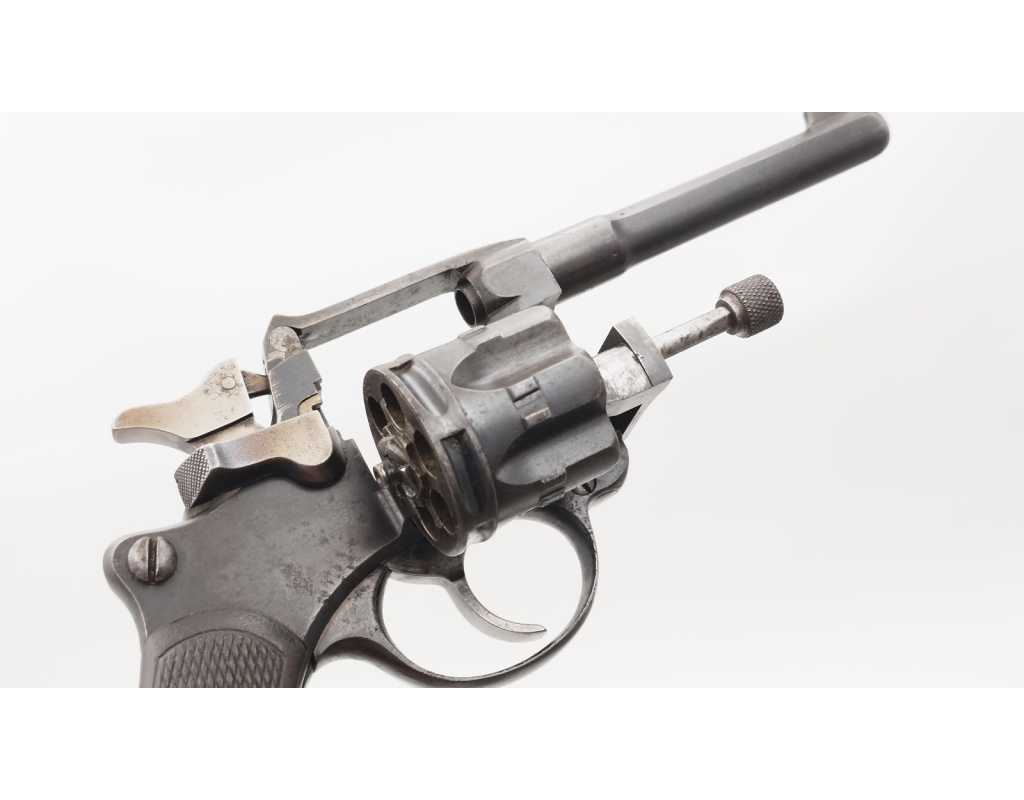 Revolver modèle 1892 de fabrication privée par Lamurre et Gidrol à Saint Etienne, début de production numéroté 51, achat privé d'un officier suite au manque de production d'arme militaire, capacité 6 coups en simple et double action en calibre 8 mm 92. Bronzage d'origine patiné avec fines traces d'oxydation, poinçon d'épreuve de st Étienne sur le contour barillet et sous le canon, logo LH sur le côté droit de la carcasse, poinçon "L" de Lamurre sur côté gauche de la carcasse, "LG51" à l'intérieur sous la plaquette gauche et sur la face avant du barillet. Mécanisme complet au fonctionnement irréprochable avec toutes pièces d'origine au même numéro sans entre fer excessif à la jonction du canon et du barillet, verrouillage sans jeu important, bonne indexation des chambres, système de portière abadie permettant le chargement et déchargement du barillet en toute sécurité. Rayures d'aspect brillantes sans usure prononcées, superficielles taches interne, chambres du barillet sans usure. Plaquettes de crosse en noyer sans accident.