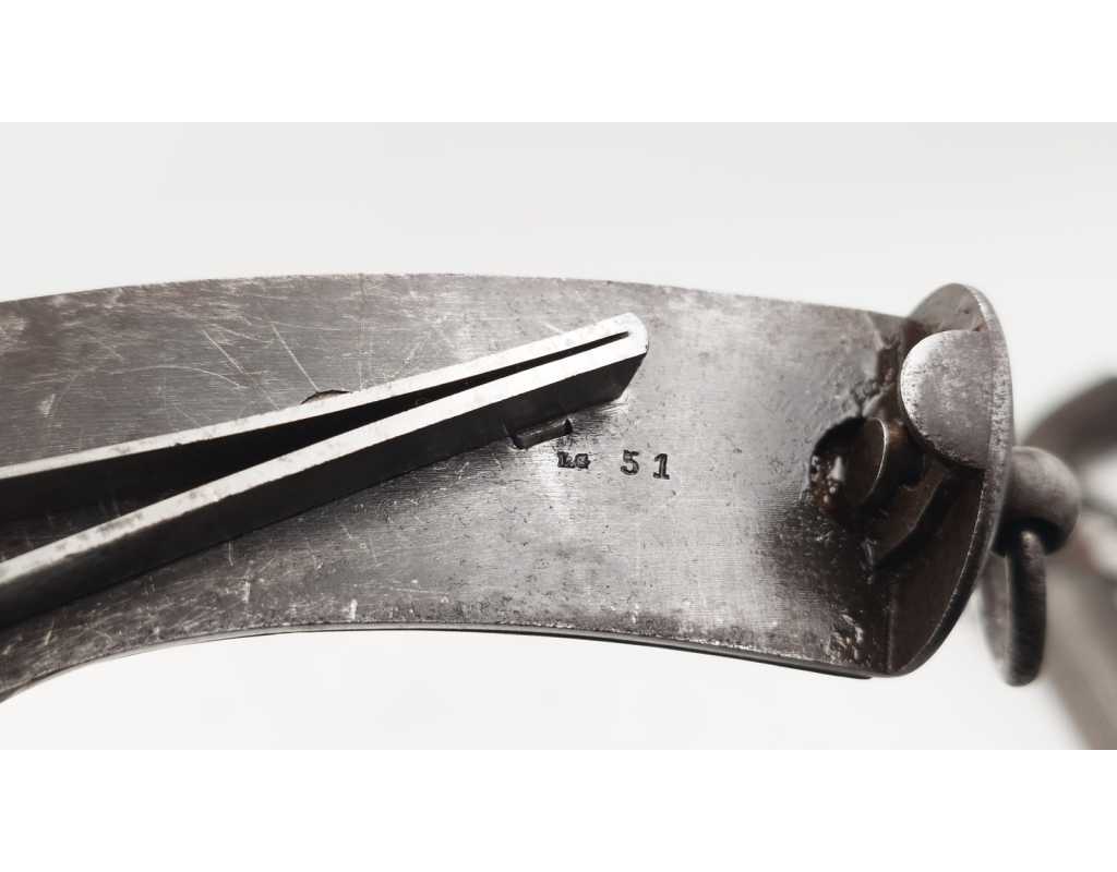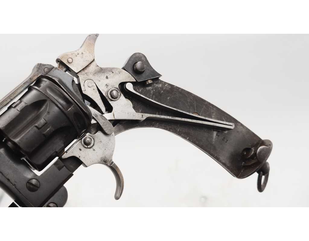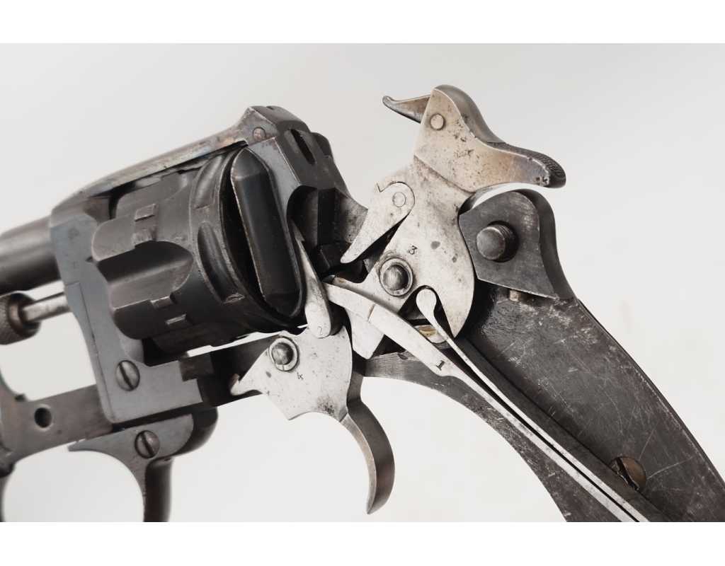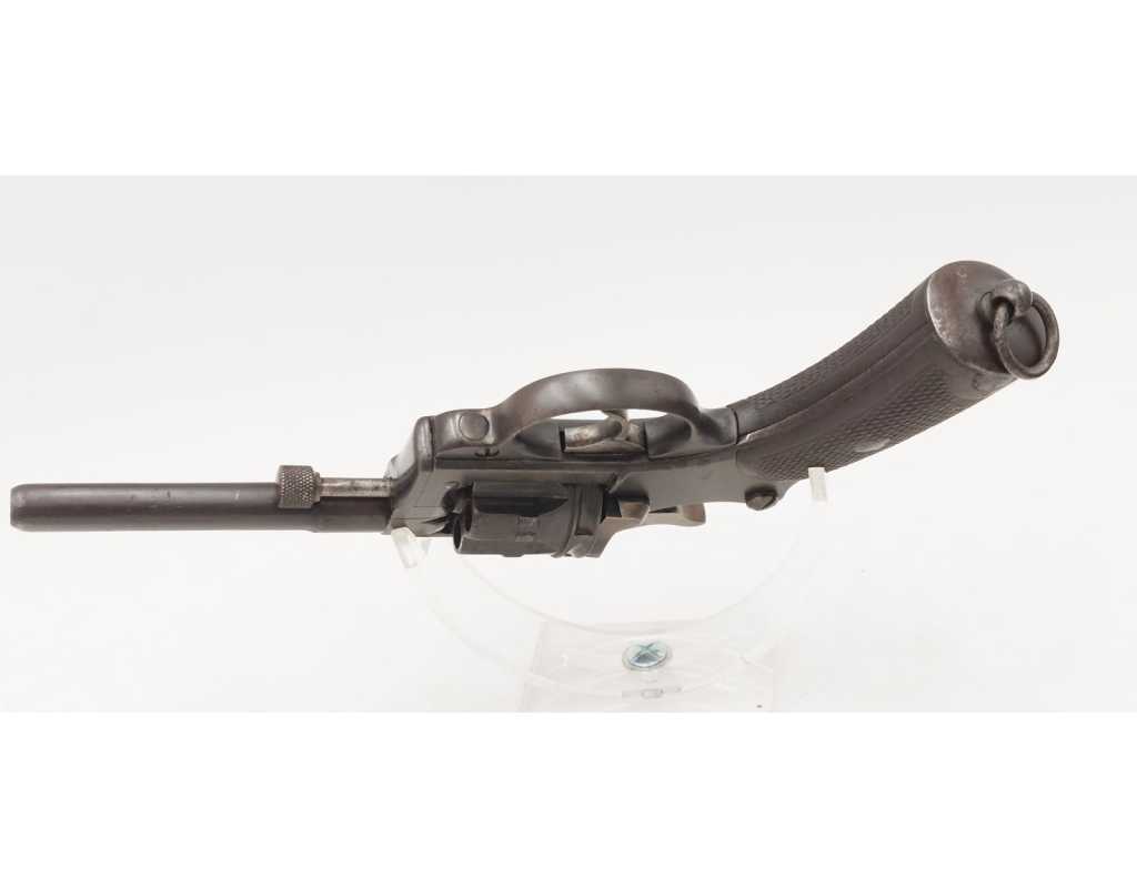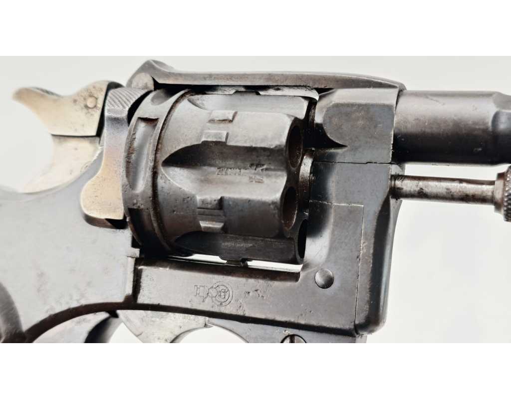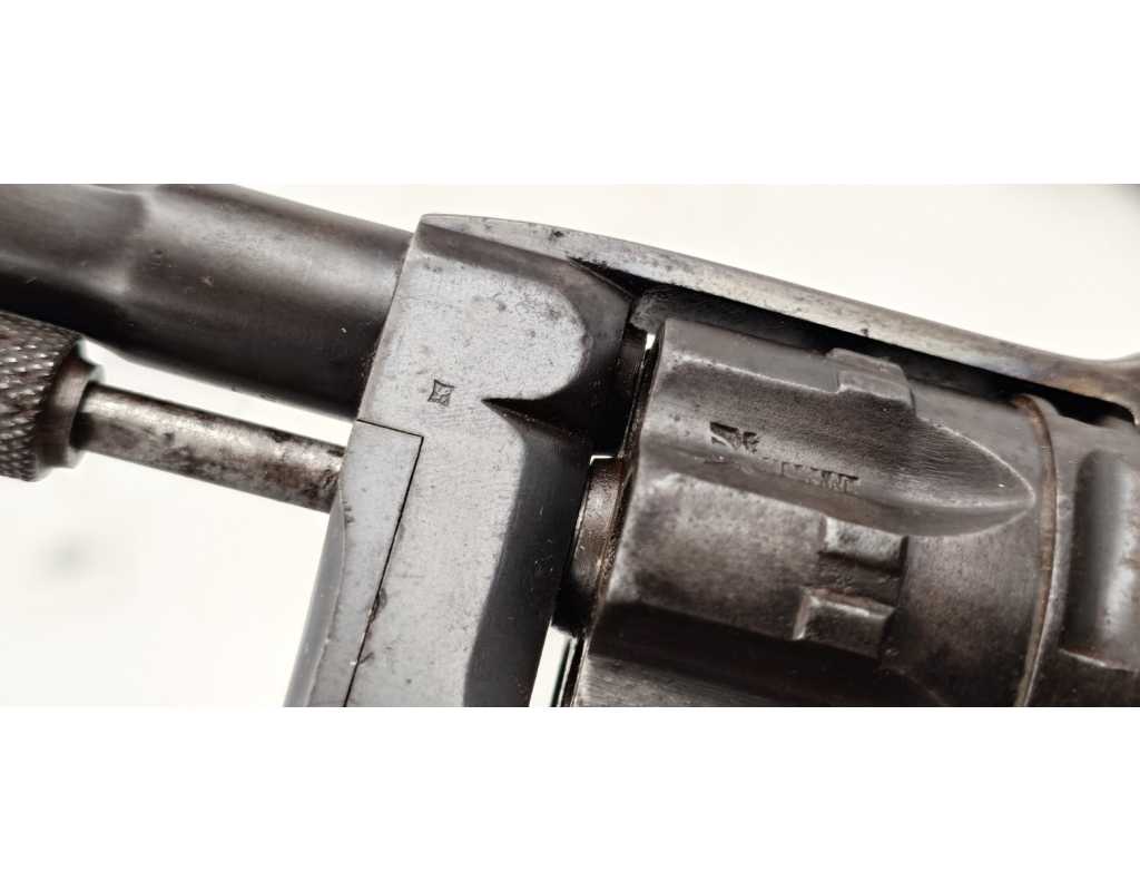 Revolver modèle 1892 de fabrication privée par Lamurre et Gidrol à Saint Etienne, début de production numéroté 51, achat privé d'un officier suite au manque de production d'arme militaire, capacité 6 coups en simple et double action en calibre 8 mm 92. Bronzage d'origine patiné avec fines traces d'oxydation, poinçon d'épreuve de st Étienne sur le contour barillet et sous le canon, logo LH sur le côté droit de la carcasse, poinçon "L" de Lamurre sur côté gauche de la carcasse, "LG51" à l'intérieur sous la plaquette gauche et sur la face avant du barillet. Mécanisme complet au fonctionnement irréprochable avec toutes pièces d'origine au même numéro sans entre fer excessif à la jonction du canon et du barillet, verrouillage sans jeu important, bonne indexation des chambres, système de portière abadie permettant le chargement et déchargement du barillet en toute sécurité. Rayures d'aspect brillantes sans usure prononcées, superficielles taches interne, chambres du barillet sans usure. Plaquettes de crosse en noyer sans accident.