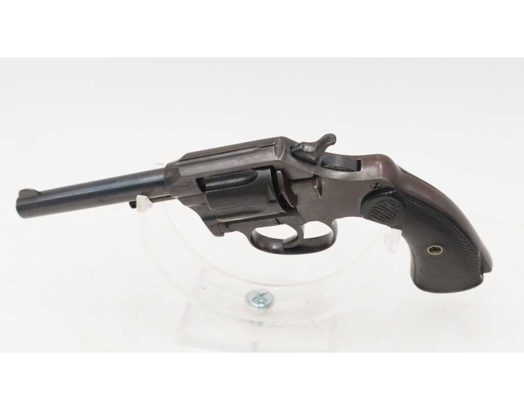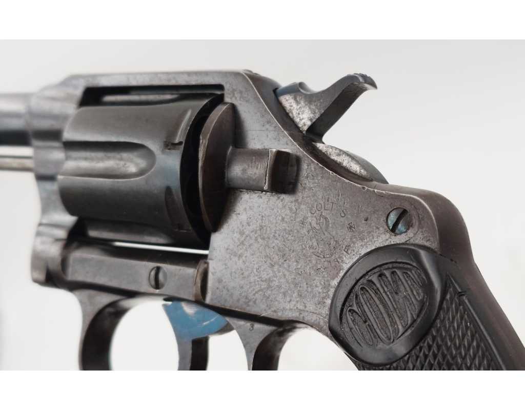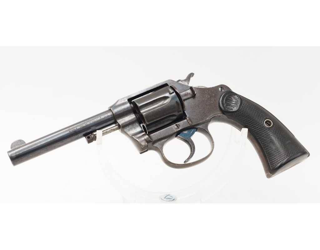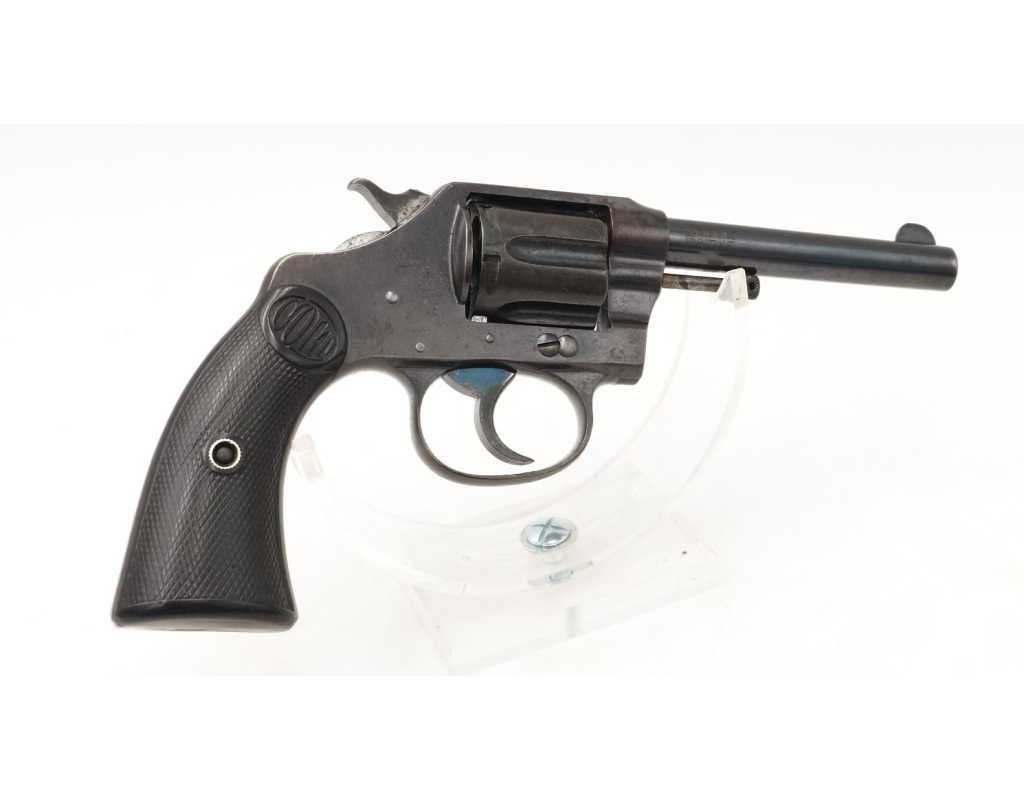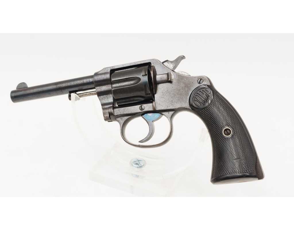 Revolver Colt double action modèle New Police Positive N°45951 produit en 1907, capacité de 6 coups simple et double action en calibre 32 Smith & Wesson long ou court. Bronzage d'époque patiné et légèrement taché. Beaux marquages sur le canon avec brevets 1884/1900/1905, logo Colt et inscription du modèle sur la carcasse bien visibles. Mécanisme complet au fonctionnement irréprochable avec toutes pièces d'origine au numéro, entre fer parfait entre le canon et le barillet, excellente indexation des chambres et verrouillage sans aucun jeu. Canon de 4" rayures sans usure particulière d'aspect brillantes avec fines taches. Plaquettes de crosse en gutta-percha, petit éclat au talon, elle pourra être remplacée par un plaquette gauche d'origine de la même couleur ou une paire neuve actuelle.