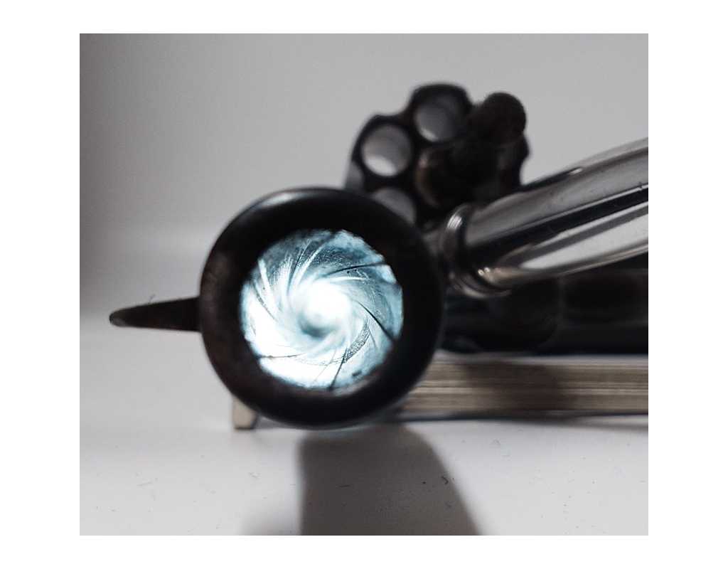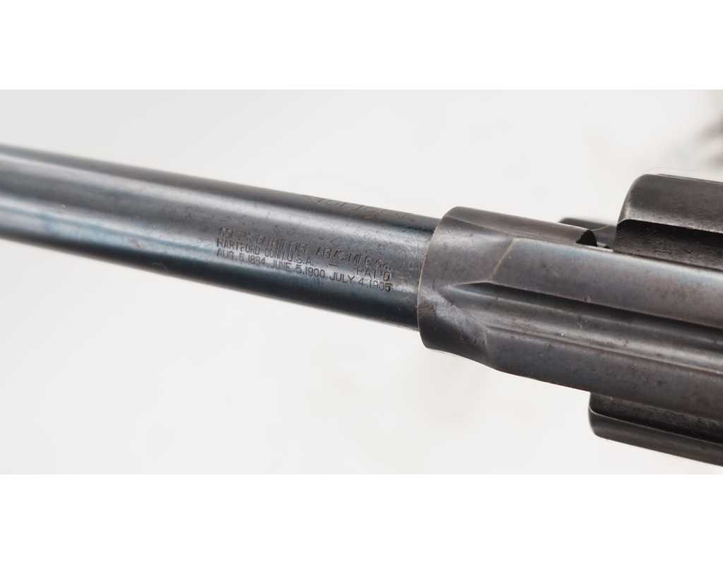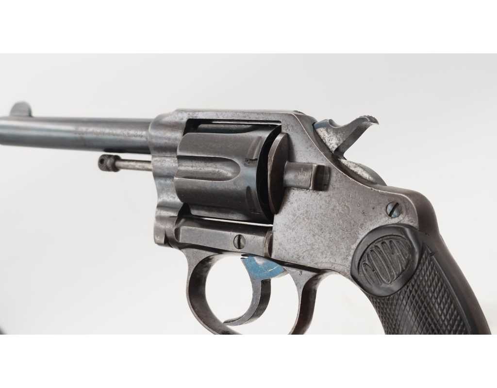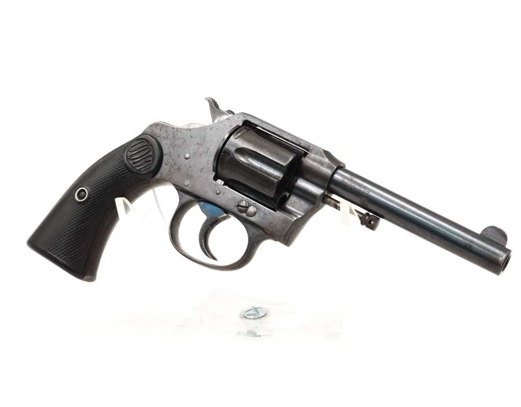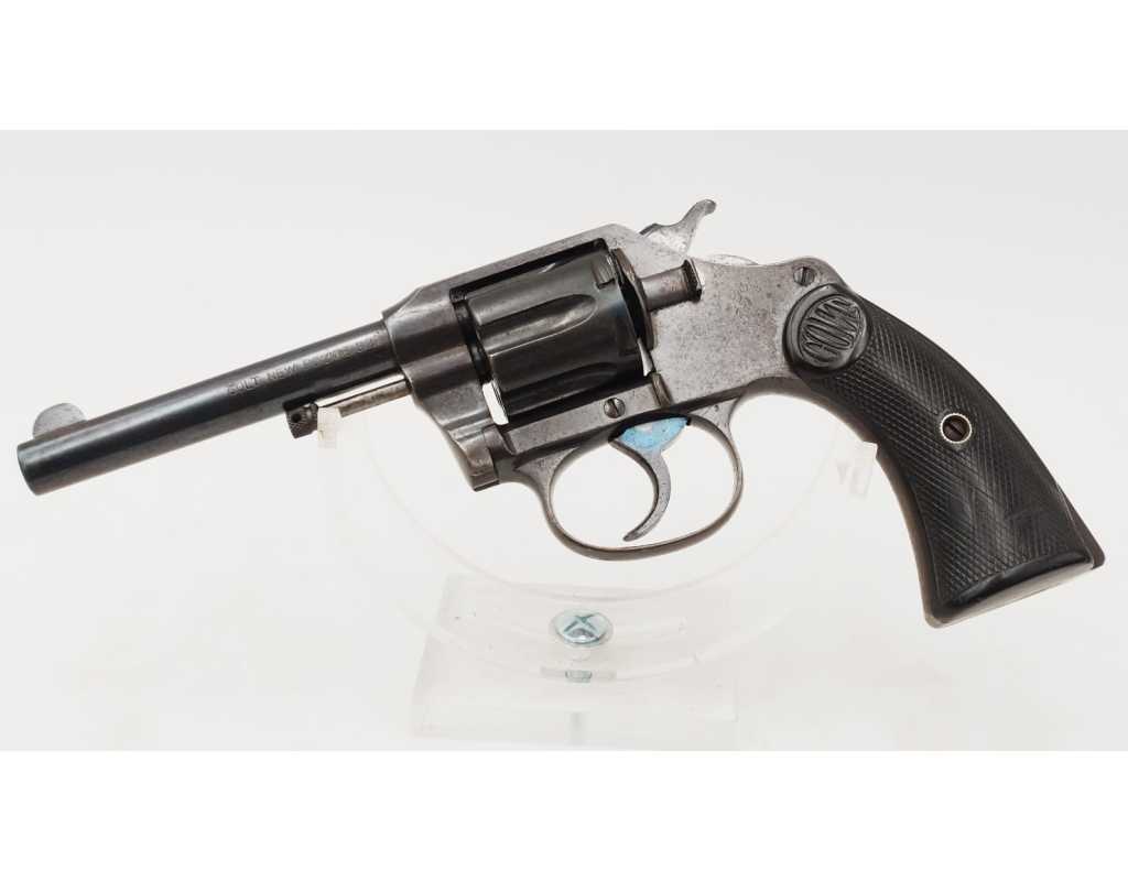 Revolver Colt double action modèle New Police Positive N°45951 produit en 1907, capacité de 6 coups simple et double action en calibre 32 Smith & Wesson long ou court. Bronzage d'époque patiné et légèrement taché. Beaux marquages sur le canon avec brevets 1884/1900/1905, logo Colt et inscription du modèle sur la carcasse bien visibles. Mécanisme complet au fonctionnement irréprochable avec toutes pièces d'origine au numéro, entre fer parfait entre le canon et le barillet, excellente indexation des chambres et verrouillage sans aucun jeu. Canon de 4" rayures sans usure particulière d'aspect brillantes avec fines taches. Plaquettes de crosse en gutta-percha, petit éclat au talon, elle pourra être remplacée par un plaquette gauche d'origine de la même couleur ou une paire neuve actuelle.