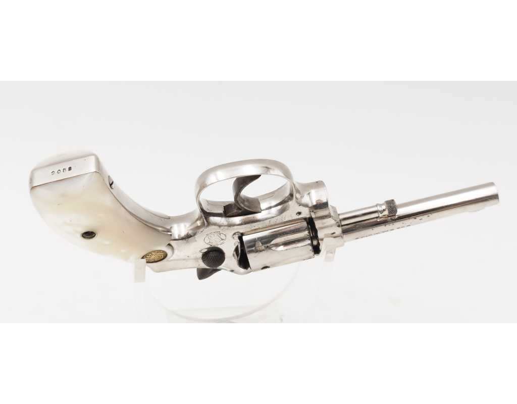 Revolver Smith & Wesson Lady Smith 1er modèle en calibre 22 long ou court, numéro de série 2058, produit à 4575 exemplaires entre 1902 et 1906 et capacité 7 coups en simple et double action. Nickelage d'origine légèrement patiné et légèrement taché. Logo Smith & Wesson sur le côté gauche, patent et indication du calibre sur le canon non atténués. Jaspage d'origine sur le chien et la détente bien présent.