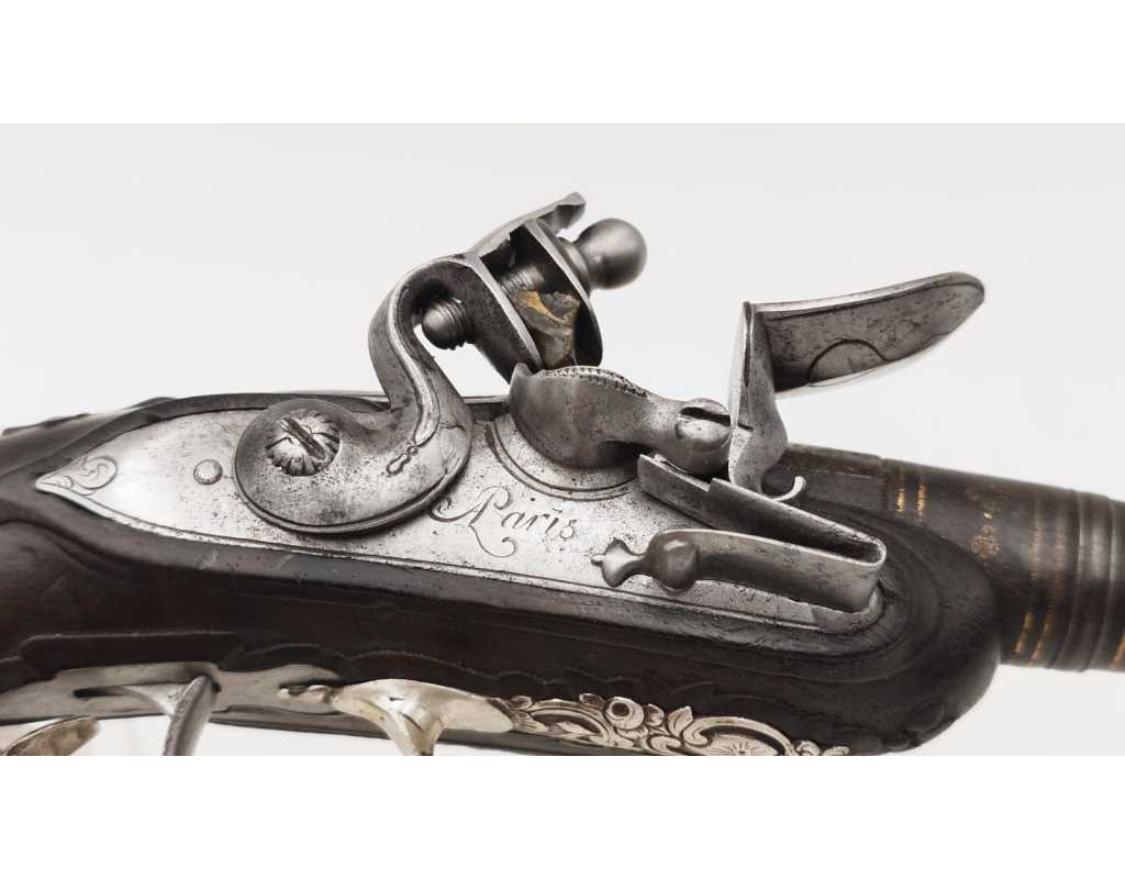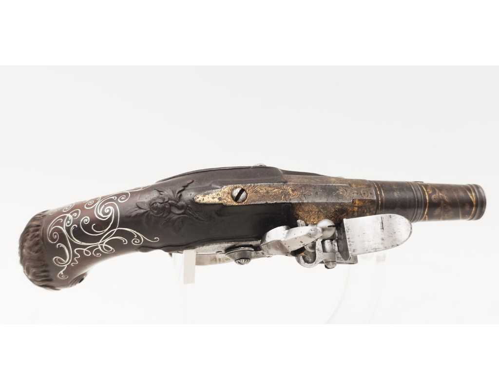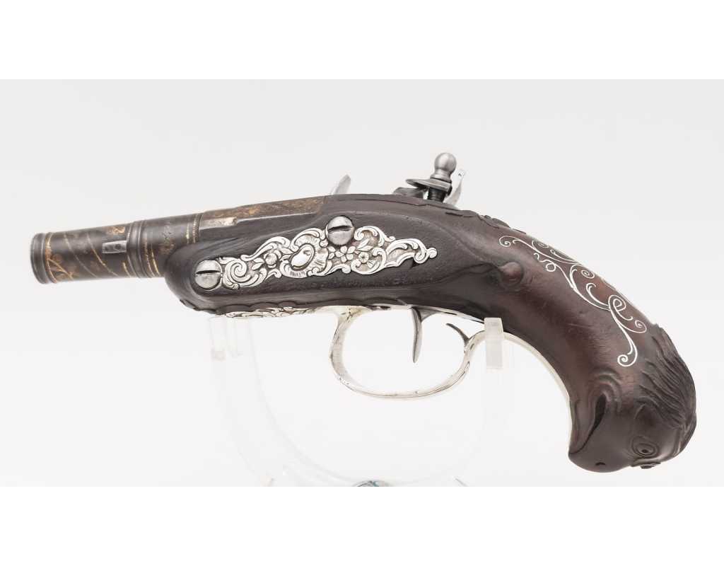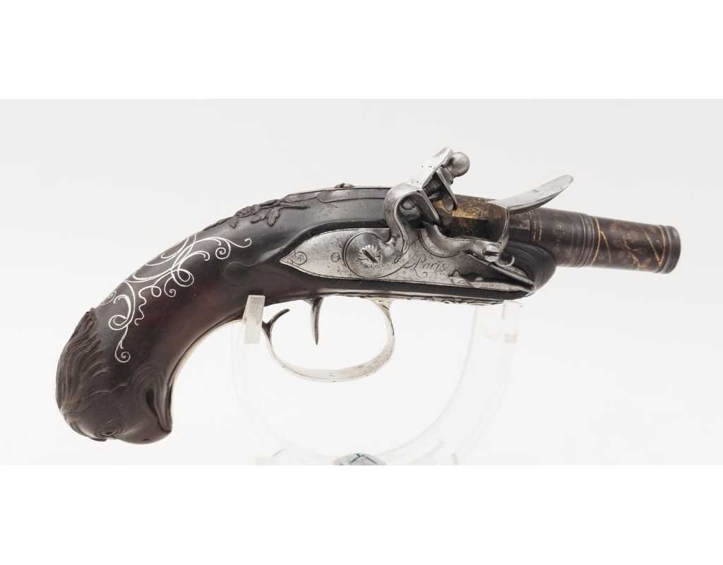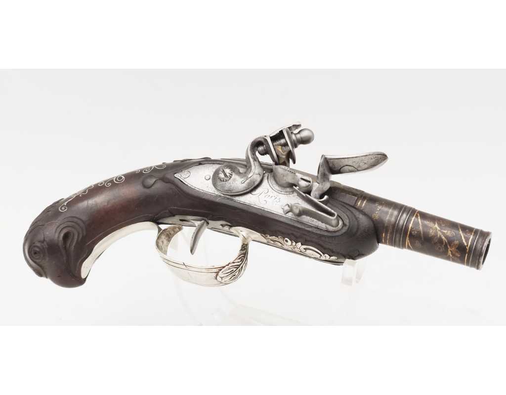 Rare et mignon pistolet de poche long de 175mm signé Paris en très bel état de conservation, finition d'origine avec une belle patine sans dommage particulier. Platine longue de 70mm à corps rond et chien à col de cygne, bassinet en fer à bride, mécanisme complet et fonctionnel entièrement d'origine. Canon dans sa finition d'origine bleui avec gravures de fleurs damasquinées à l'or, long de 80mm à pans au tonnerre, puis rond à balle forcée dévissable à l'aide de l'ergot, calibre 9,5mm lisse. Monture en noyer finement sculpté et sans accident, garnitures ciselées de fleurs et incrustations de volutes en fil d'argent, calotte figurant une tête d'oiseau, décors florales sculptés derrière la queue de culasse.