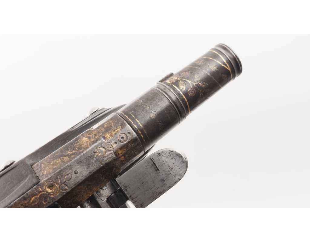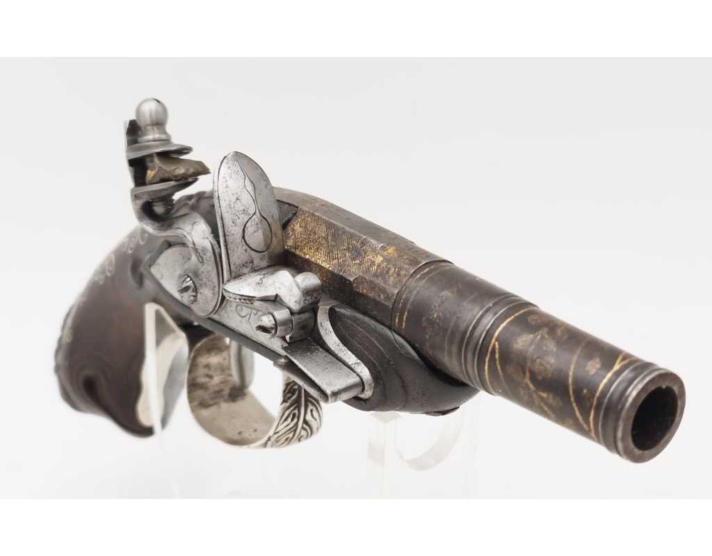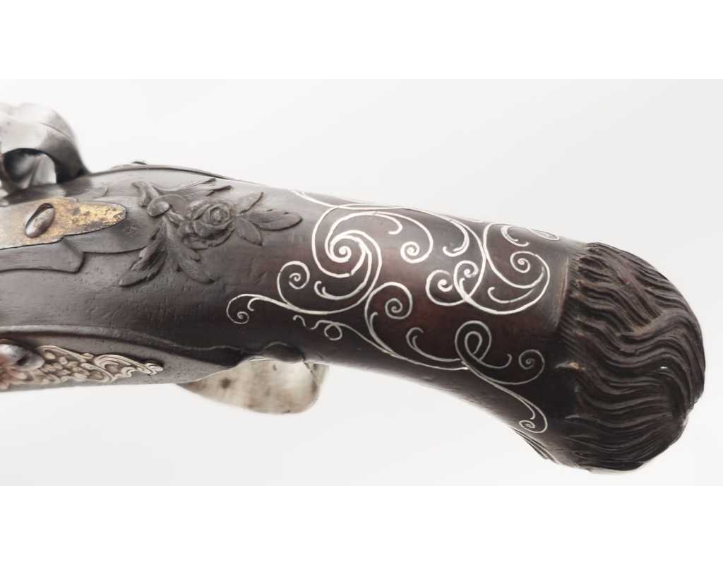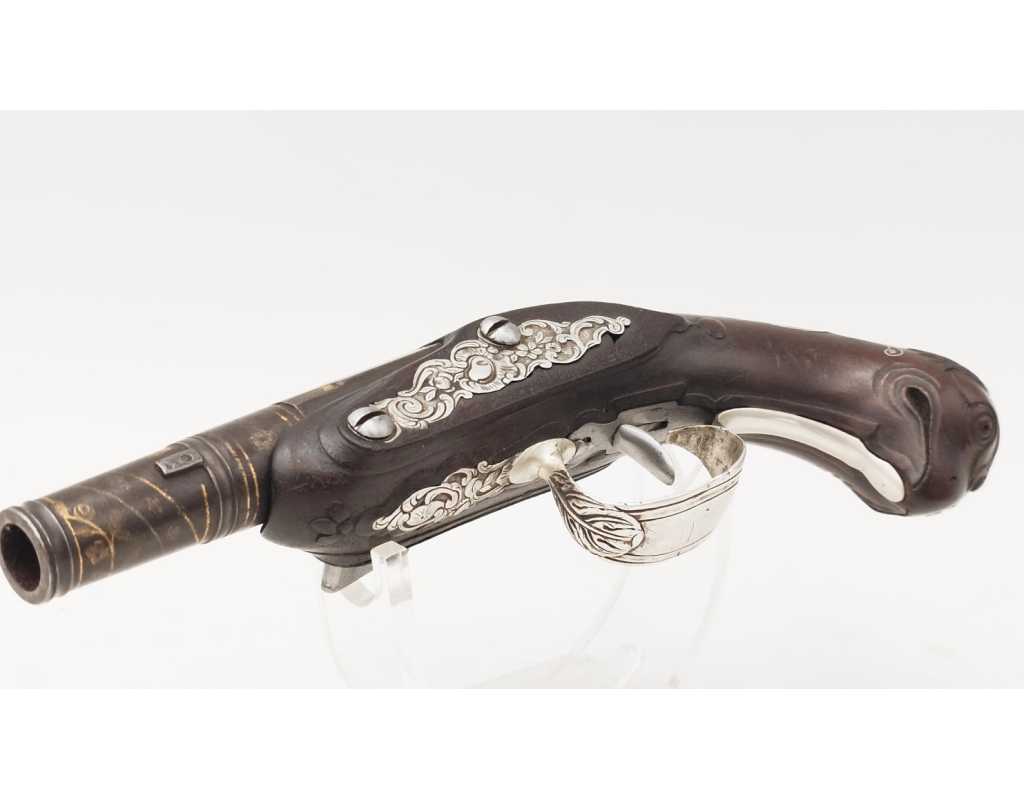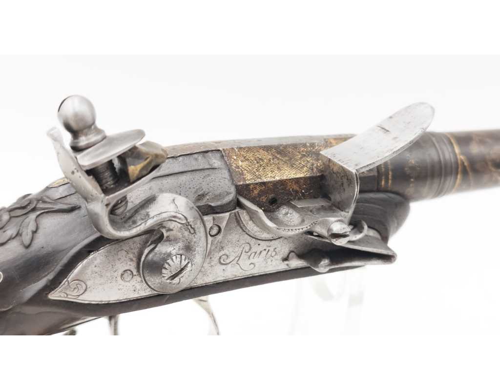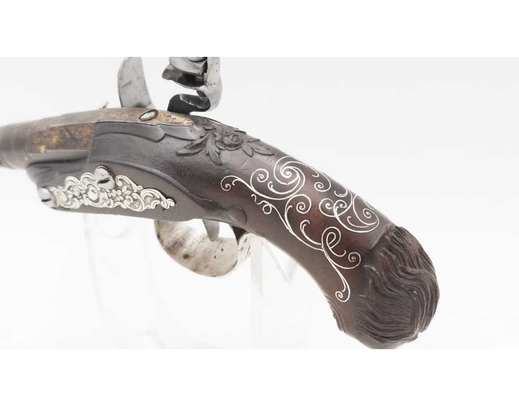 Rare et mignon pistolet de poche long de 175mm signé Paris en très bel état de conservation, finition d'origine avec une belle patine sans dommage particulier. Platine longue de 70mm à corps rond et chien à col de cygne, bassinet en fer à bride, mécanisme complet et fonctionnel entièrement d'origine. Canon dans sa finition d'origine bleui avec gravures de fleurs damasquinées à l'or, long de 80mm à pans au tonnerre, puis rond à balle forcée dévissable à l'aide de l'ergot, calibre 9,5mm lisse. Monture en noyer finement sculpté et sans accident, garnitures ciselées de fleurs et incrustations de volutes en fil d'argent, calotte figurant une tête d'oiseau, décors florales sculptés derrière la queue de culasse.