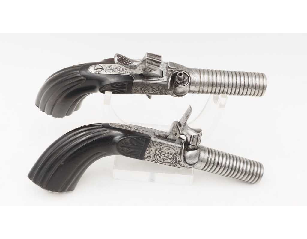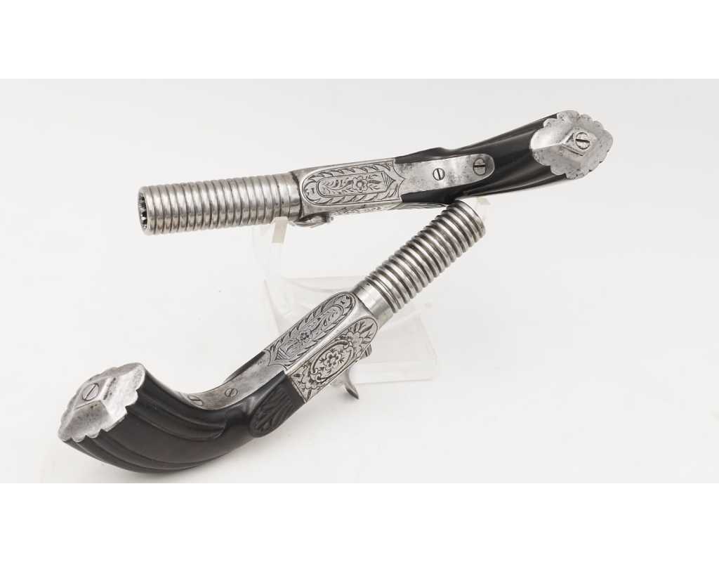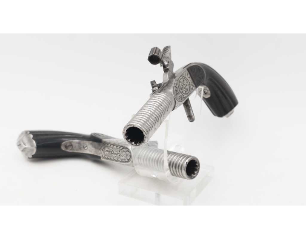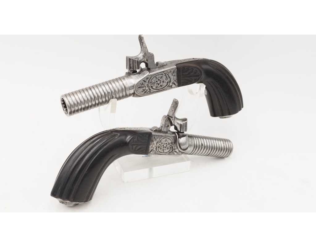 Belle paire de pistolets de poche dit de voyage, un coup à percussion, numérotés 14 et 15. Finition poli blanc dans une belle patine, gravures de fleurs sur les coffres, canons tournés formant des godrons, longs de 47mm à forte rayures, calibre 10mm. Mécanismes complet et fonctionnel. Crosses type renaissance en ébène, calottes à facettes. Longueurs totales 15,5cm.