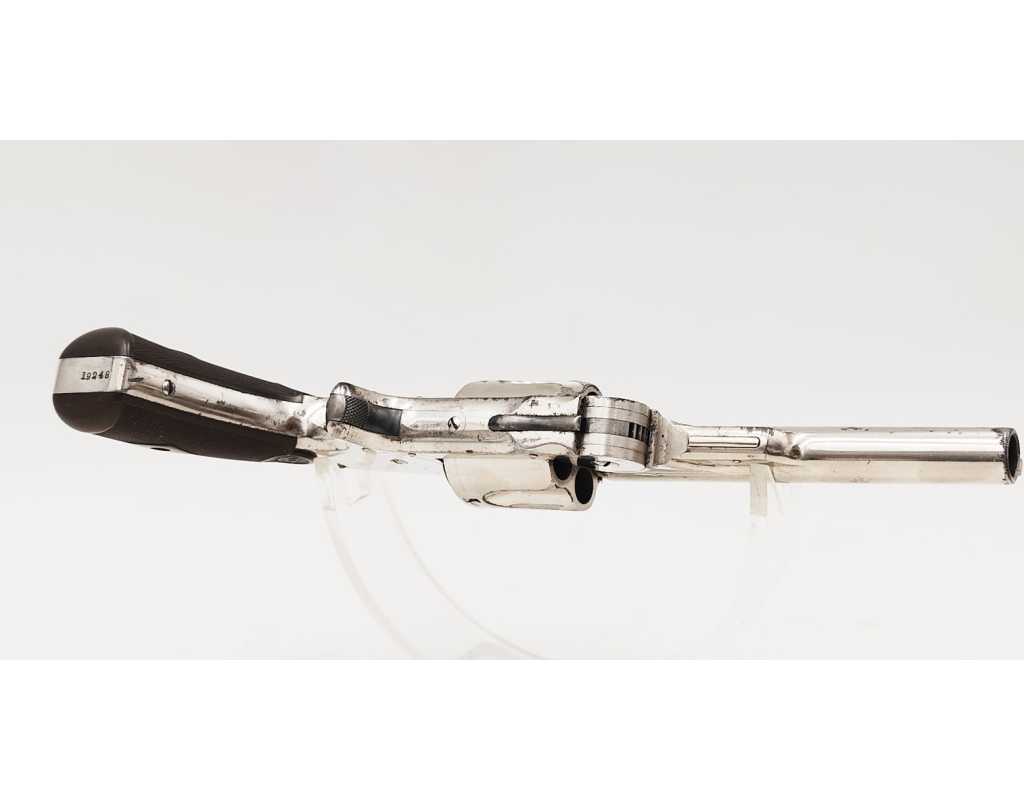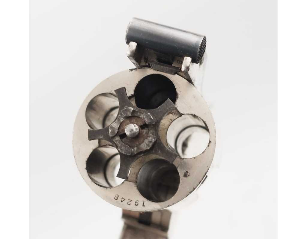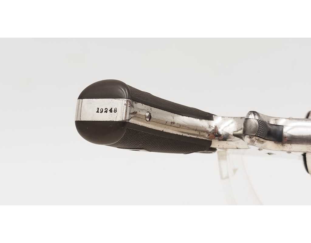 Revolver baby russian , finition nickelé d'origine bien conservée avec fines taches , chien et détente jaspés, capacité de 5 coups en calibre 38 smith & wesson. Mécanisme complet et fonctionnel avec toutes pièces d'origine, verrouillage sans jeu, entre fer et indexation de chambre parfaite. Plaquettes en gutta percha marron foncée d'origine. Canon de 4 pouces, rayures sans usure particulière d'aspect brillante avec fines taches. Marquages de l'adresse et des brevets non atténués sur la bande supérieur.