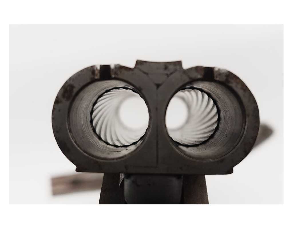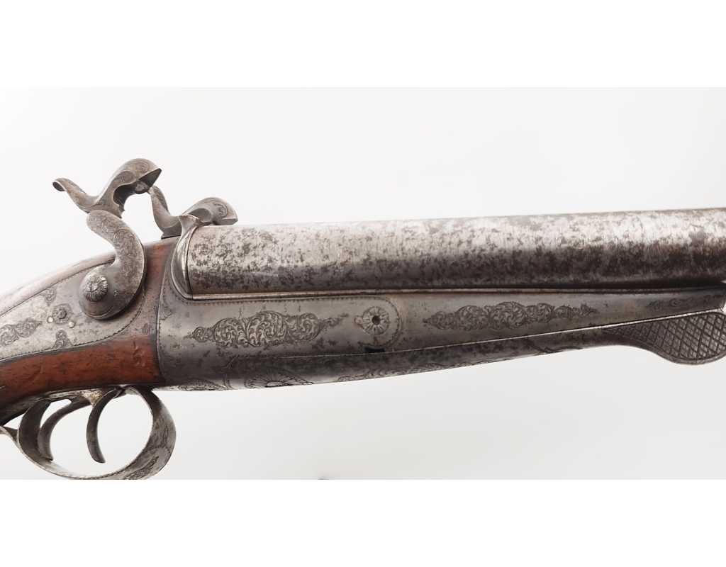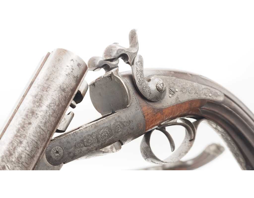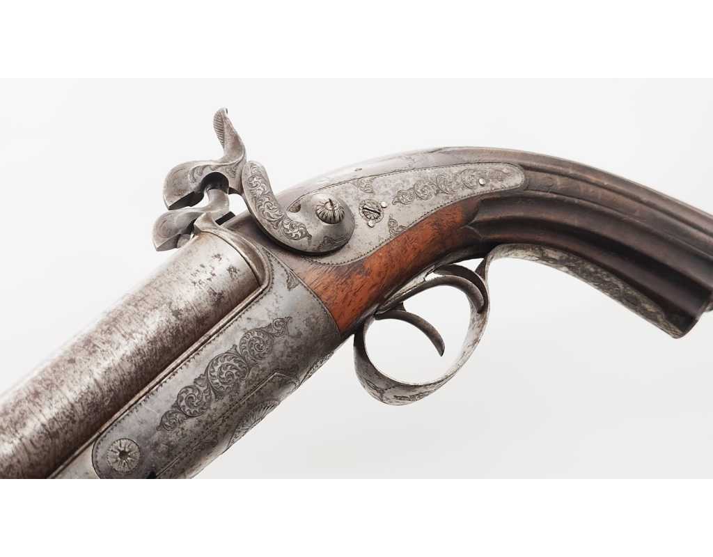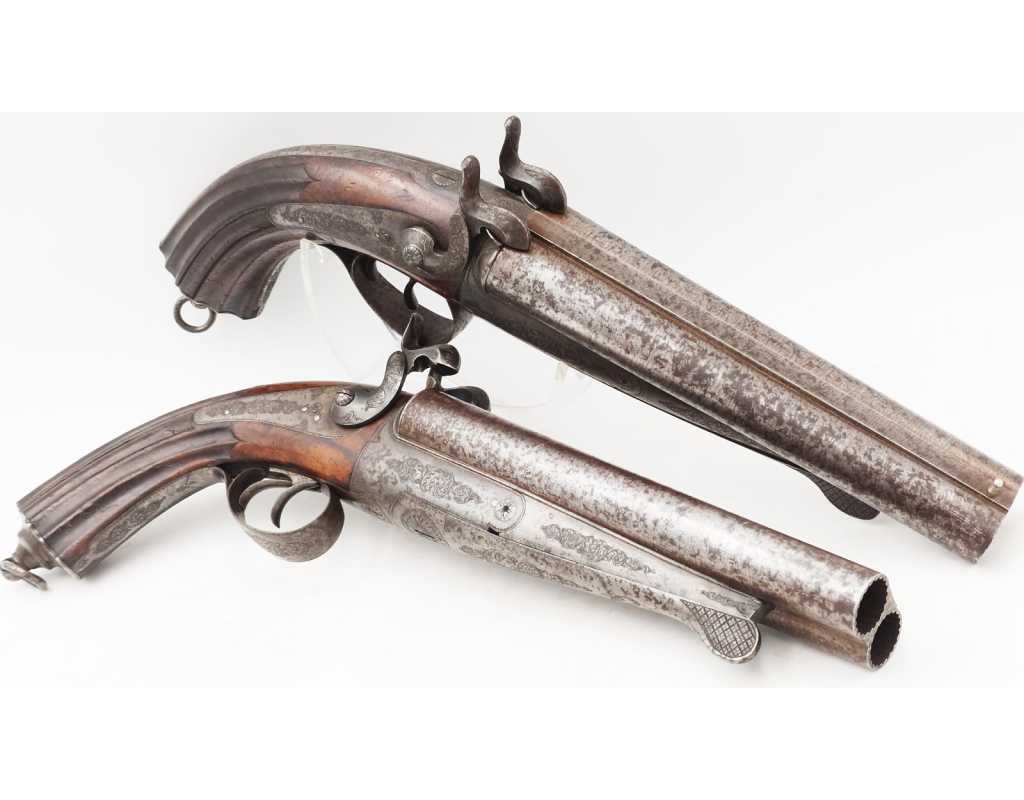 Paire de fort pistolets de vénerie juxtaposés à système Lefaucheux en calibre 16 à broche rayé pour balle. Dans leur finition d'origine avec canons en damas bruni à bourrelets de renfort médian, âmes rayées brillantes sans usure particulière, reste de jaspage sur la carcasse, le pontet et la calotte, ensemble finement gravé et ciselé de rinceaux. Mécanismes simple action complet et fonctionnels. Crosse en noyer sculptés dans le gout de la Renaissance. Longueur totale 36cm. Aucune marque ni poinçon.