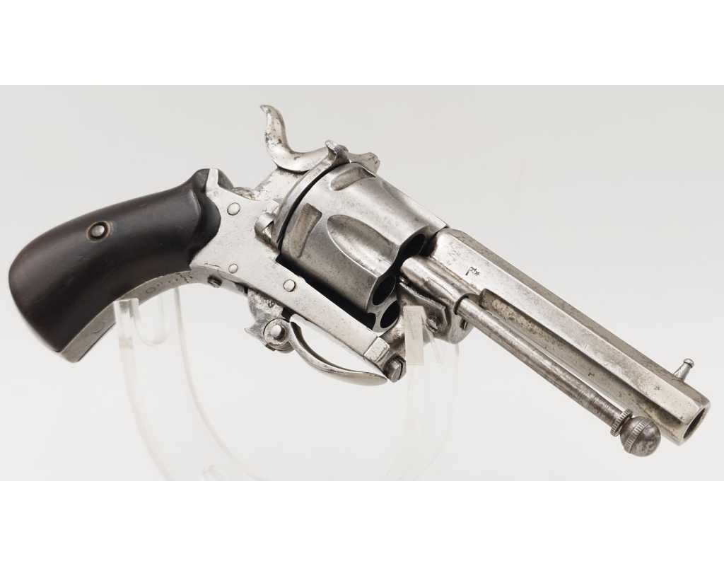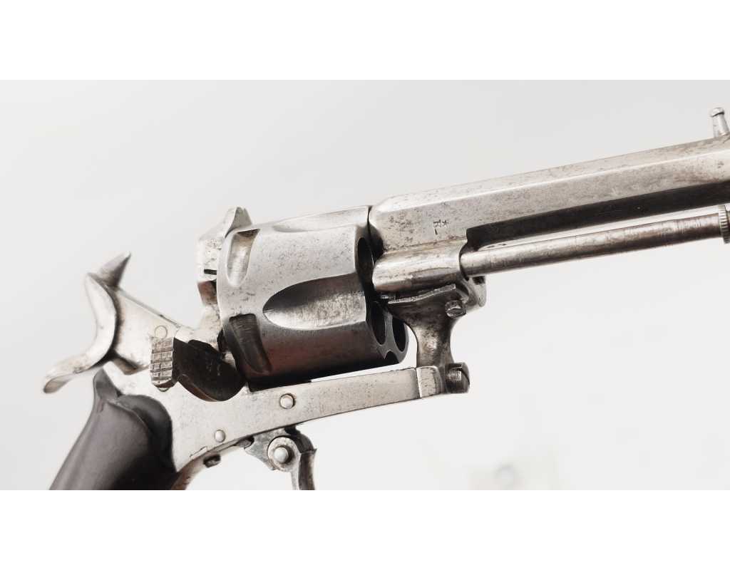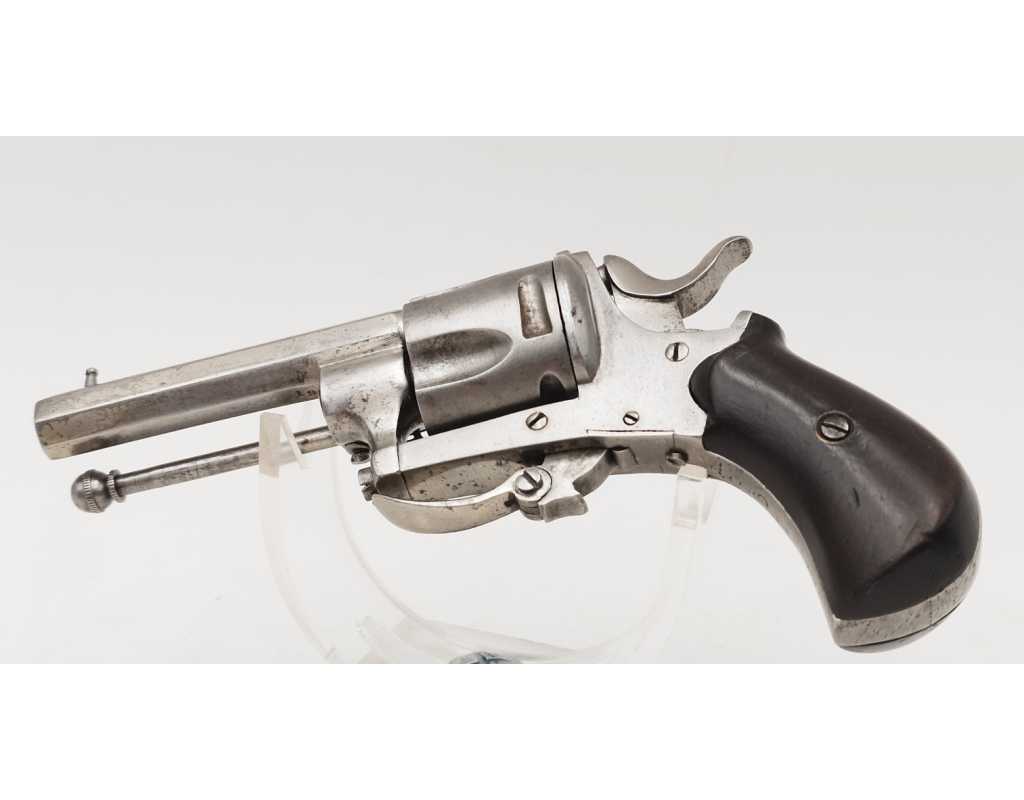 Revolver "Le Foudroyant" présenté à l'exposition universelle de 1878, 5 coups calibre 320 simple et double action. Finition poli blanc dans une belle patine sans oxydation, mécanisme complet et fonctionnel, canon à pans marqué sur le dessus, rayures brillantes satinées finement tachées, plaquettes de crosse en ébène. L. totale 16,5cm