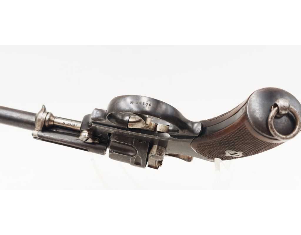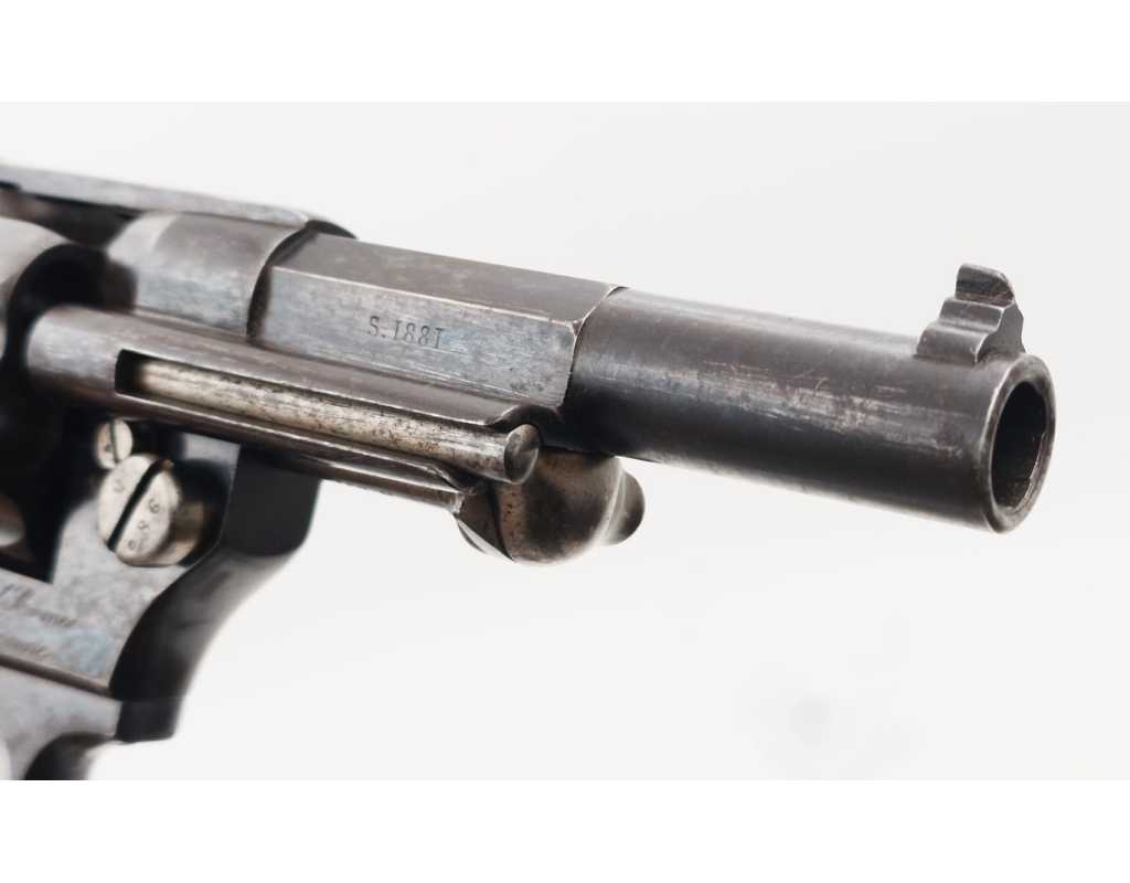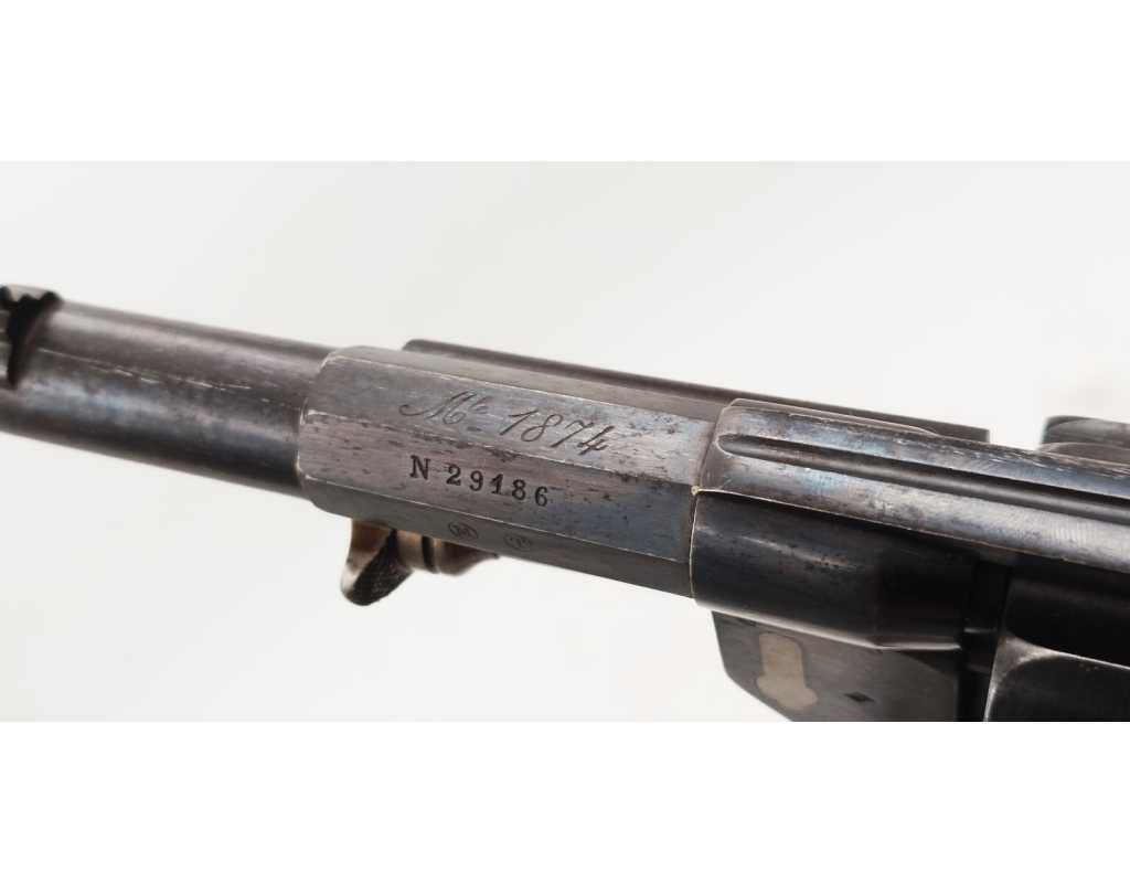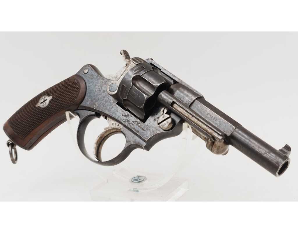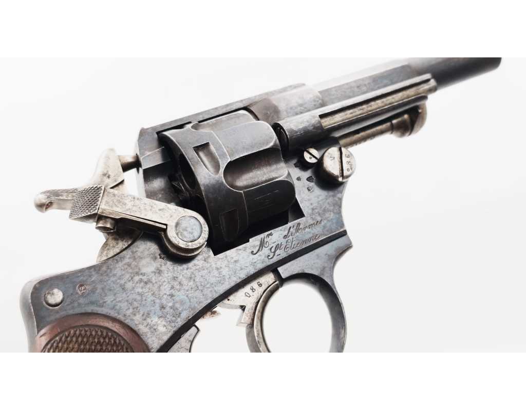 Revolver réglementaire modèle 1874 daté 1881 en excellent état de conservation sans usure particulière, capacité 6 coups en simple et double action calibre 11mm73. Finition bronzée d'origine bleu nuit brillant avec fines taches d'oxydation localisées principalement du côté droit, sans corrosion. Inscription du modèle et marquage de la Manufacture d'Armes de Saint-Étienne bien nets, poinçons de contrôleur conformes sans atténuation. Mécanisme complet et fonctionnel avec toutes pièces d'origine au même numéro, sans entre fer excessif à la jonction du canon et du barillet, verrouillage sans jeu, indexation parfaite, les pièces internes et externes dans leurs coloration jaune paille patinées. Canon avec de belles rayures d'aspect brillantes miroir sans usure particulière ni tache. Plaquettes de crosse en noyer non usagées encore bien rugueuse, poinçons de réception vers la talon bien visibles.