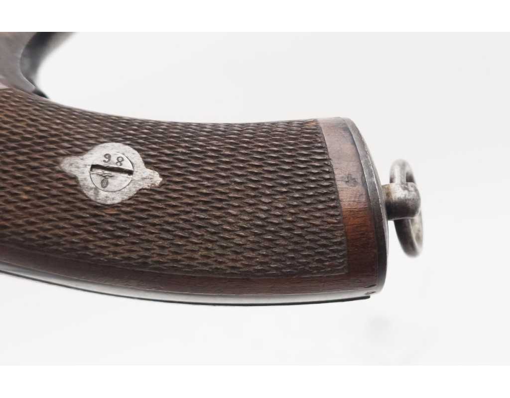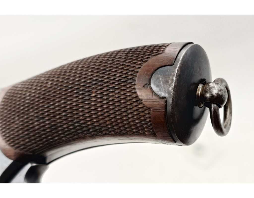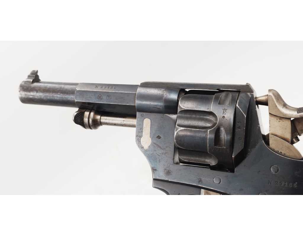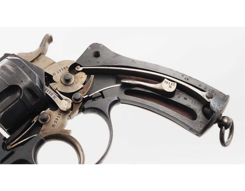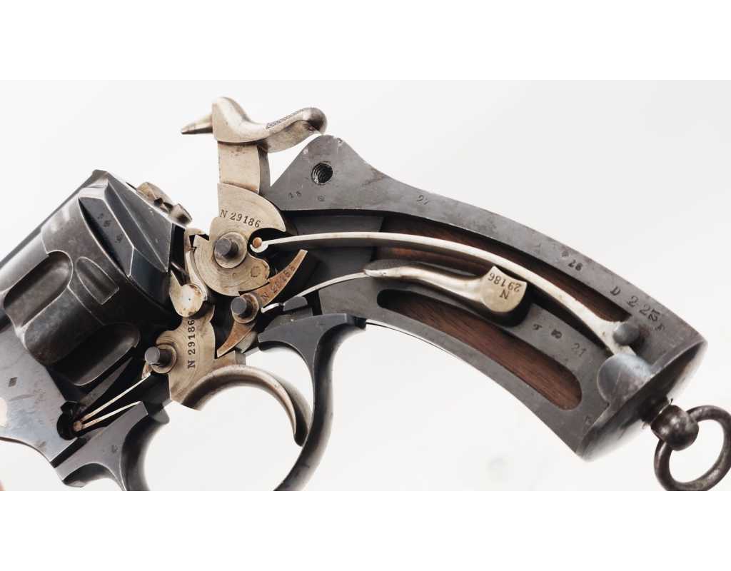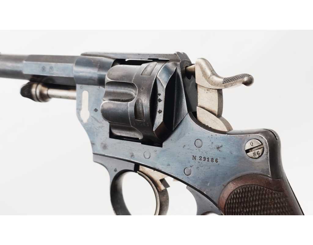 Revolver réglementaire modèle 1874 daté 1881 en excellent état de conservation sans usure particulière, capacité 6 coups en simple et double action calibre 11mm73. Finition bronzée d'origine bleu nuit brillant avec fines taches d'oxydation localisées principalement du côté droit, sans corrosion. Inscription du modèle et marquage de la Manufacture d'Armes de Saint-Étienne bien nets, poinçons de contrôleur conformes sans atténuation. Mécanisme complet et fonctionnel avec toutes pièces d'origine au même numéro, sans entre fer excessif à la jonction du canon et du barillet, verrouillage sans jeu, indexation parfaite, les pièces internes et externes dans leurs coloration jaune paille patinées. Canon avec de belles rayures d'aspect brillantes miroir sans usure particulière ni tache. Plaquettes de crosse en noyer non usagées encore bien rugueuse, poinçons de réception vers la talon bien visibles.