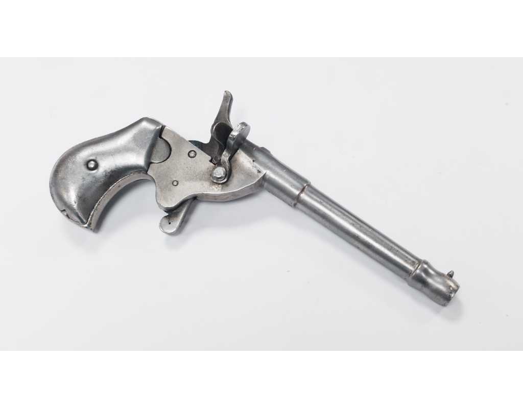 Pistolet dit de cycliste (facteur) à un coup en calibre 6mm flobert percussion annulaire, complet et fonctionnel, finition patiné gris sans oxydation, canon lisse à bourrelet à la bouche, extracteur de douille présent. Plaquettes de crosse alu. Longueur totale 14.5cm