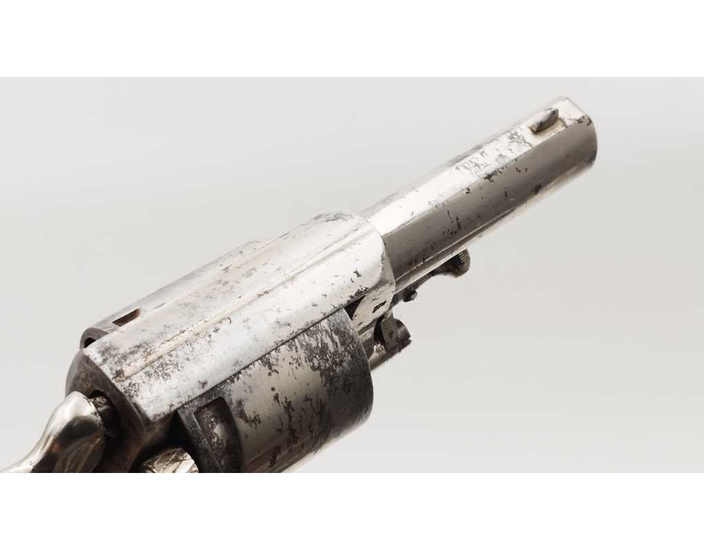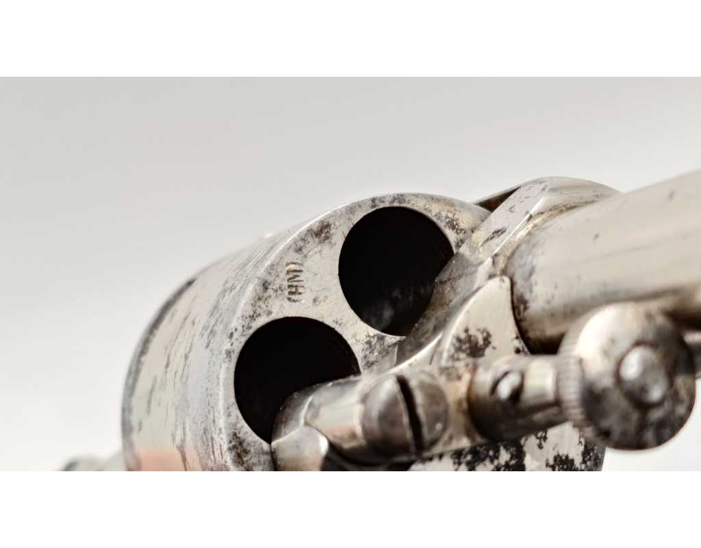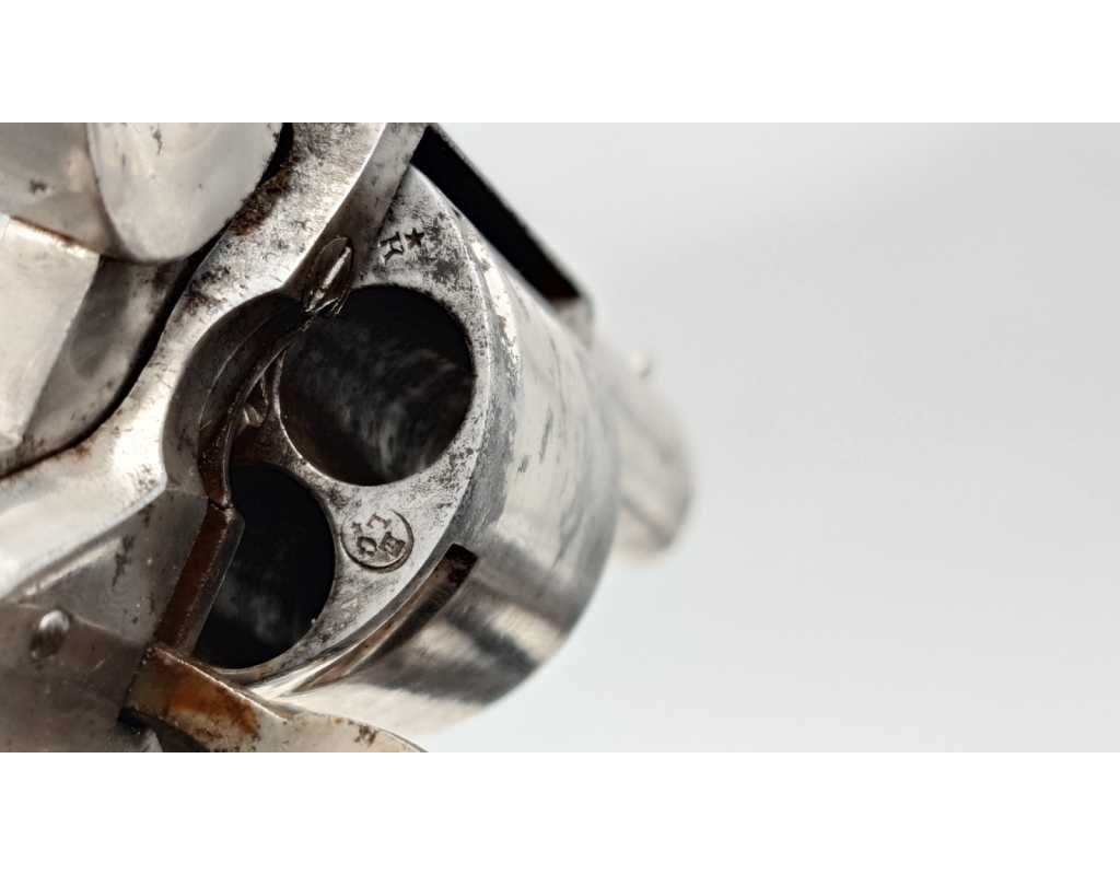 Revolver de défense calibre 450 (ou 11mm MAS1873) , 5 coups en simple et double action, mécanique sans jeu parfaitement fonctionnel, finition d'origine nickelée avec patine d'usage et taches. Canon de 63mm à rayures légèrement usagées et tachées. Plaquettes de crosse en ébène quadrillées. Longueur totale 18cm