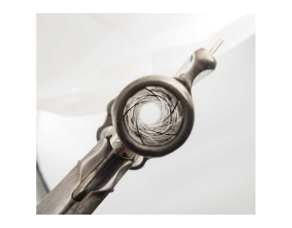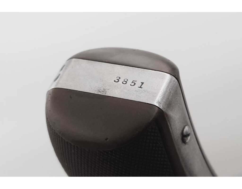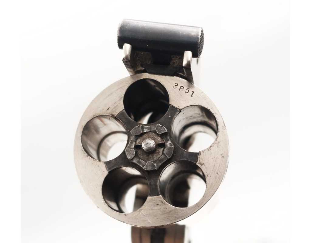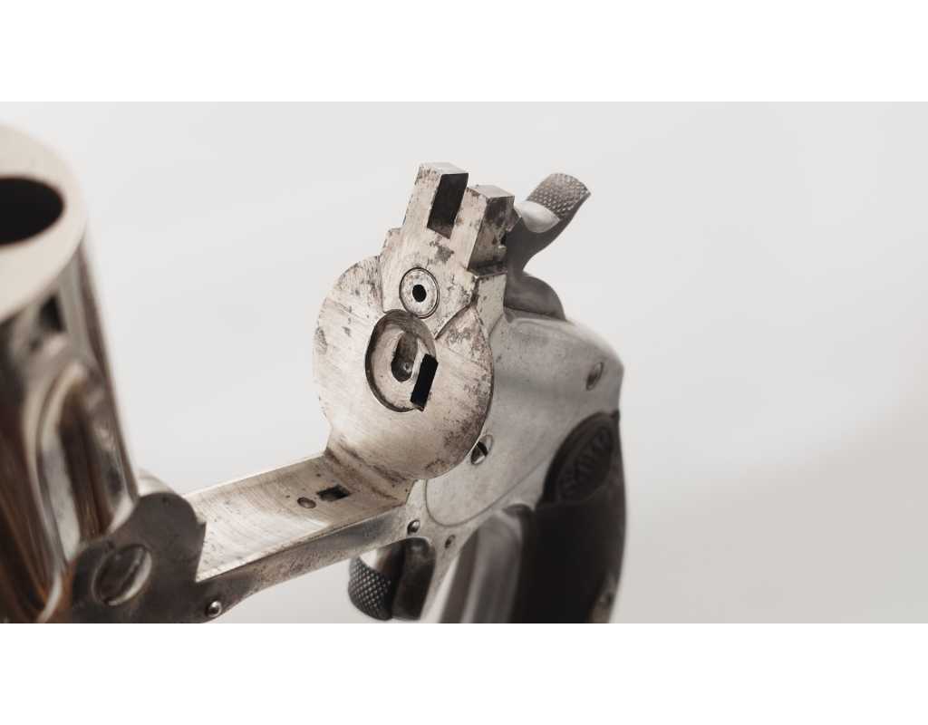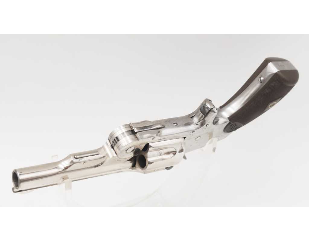 Revolver baby Russian premier modèle numéro 3851 , finition nickelé d'origine bien conservée avec fines taches , chien et détente jaspés, capacité de 5 coups en calibre 38 smith & wesson. Mécanisme complet et fonctionnel avec toutes pièces d'origine, verrouillage sans jeu, entre fer et indexation de chambre parfaite. Plaquettes en gutta percha marron foncée d'origine. Canon de 2" 3/4 pouces, rayures usagées et tachées. Marquages de l'adresse et des brevets non atténués sur la bande supérieur.