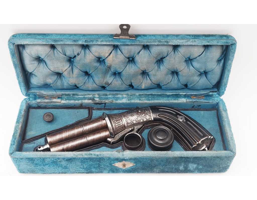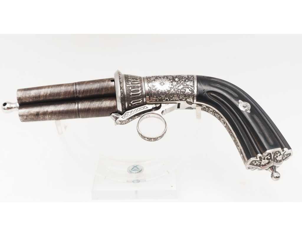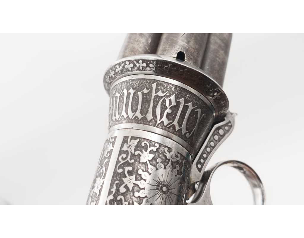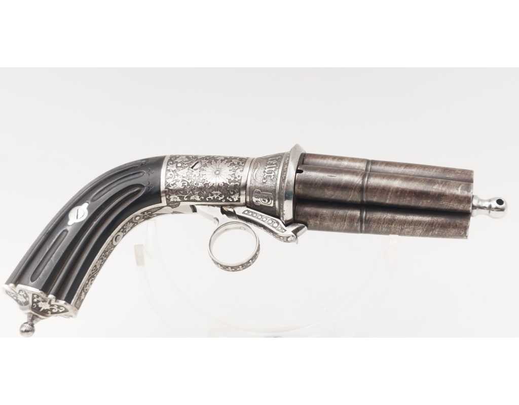 Grosse poivrière à broche 12 mm à 6 coups d’une longueur totale de 21,5cm. Présentation version luxe, canons damas bronzés bruns avec le corps gravé de fleurs, de lianes et de feuilles de vigne en fonds noirci. Crosse en ébène de forme gothique. Un bloc canon de 6 tubes lisse soudé autour d’un axe central, sans marquages ou poinçons. Le bloc canon est maintenu par un petit « ergot » sur l’axe central au niveau de la culasse et maintenue par un écrou sur le devant. Détente anneau type Mariette actionnant le chien par le dessous. Culasse tournante avec l’axe du barillet gravé sur le devant :« INV 74 LEFAUCHEUX BREVETE » en triangle. En périphérie et en lettres gothique : « Lefaucheux Inventeur » et son fameux poinçon au pistolet brisé et numéro "LF 384". Coffret velours bleu postérieur.