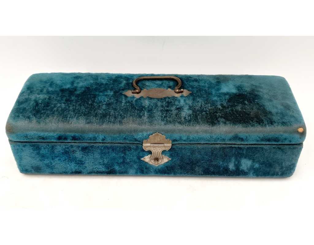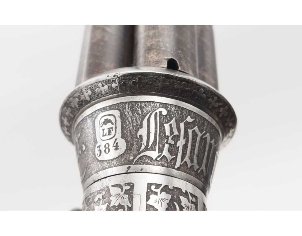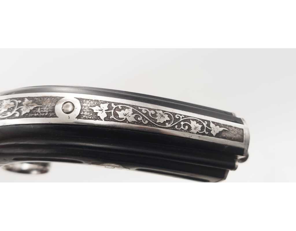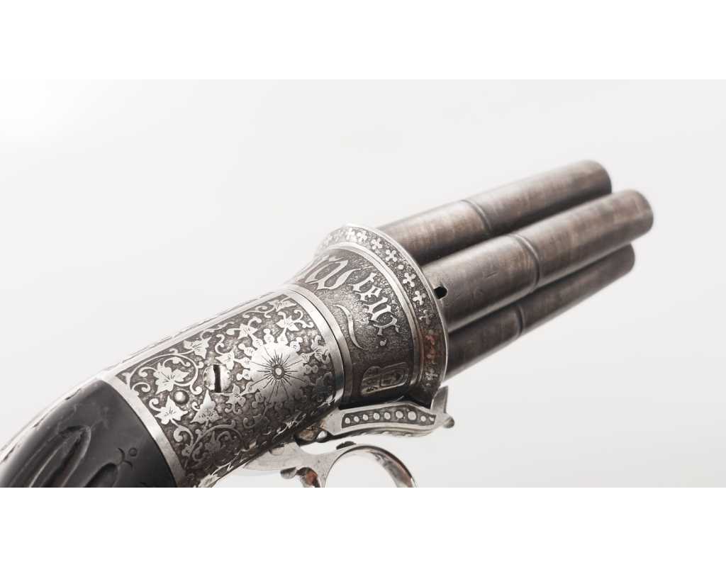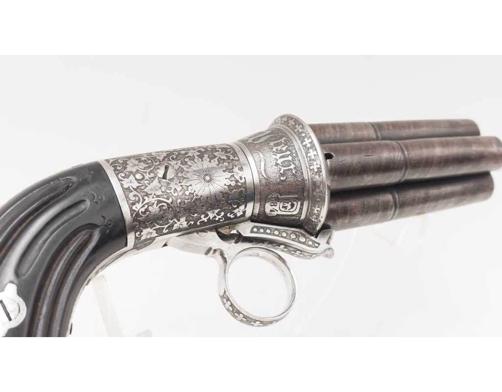 Grosse poivrière à broche 12 mm à 6 coups d’une longueur totale de 21,5cm. Présentation version luxe, canons damas bronzés bruns avec le corps gravé de fleurs, de lianes et de feuilles de vigne en fonds noirci. Crosse en ébène de forme gothique. Un bloc canon de 6 tubes lisse soudé autour d’un axe central, sans marquages ou poinçons. Le bloc canon est maintenu par un petit « ergot » sur l’axe central au niveau de la culasse et maintenue par un écrou sur le devant. Détente anneau type Mariette actionnant le chien par le dessous. Culasse tournante avec l’axe du barillet gravé sur le devant :« INV 74 LEFAUCHEUX BREVETE » en triangle. En périphérie et en lettres gothique : « Lefaucheux Inventeur » et son fameux poinçon au pistolet brisé et numéro "LF 384". Coffret velours bleu postérieur.
