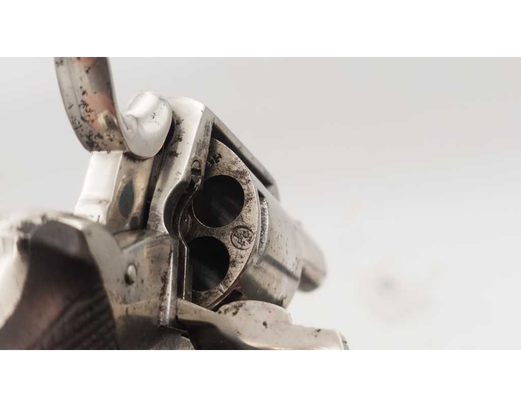 Revolver de défense calibre 450 (ou 11mm MAS1873) , 5 coups en simple et double action, mécanique sans jeu parfaitement fonctionnel, finition d'origine nickelée avec patine d'usage et taches. Canon de 63mm à rayures légèrement usagées et tachées. Plaquettes de crosse en ébène quadrillées. Longueur totale 18cm