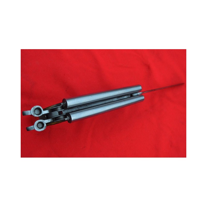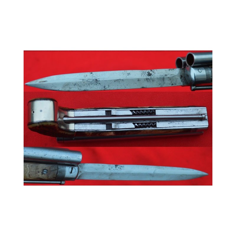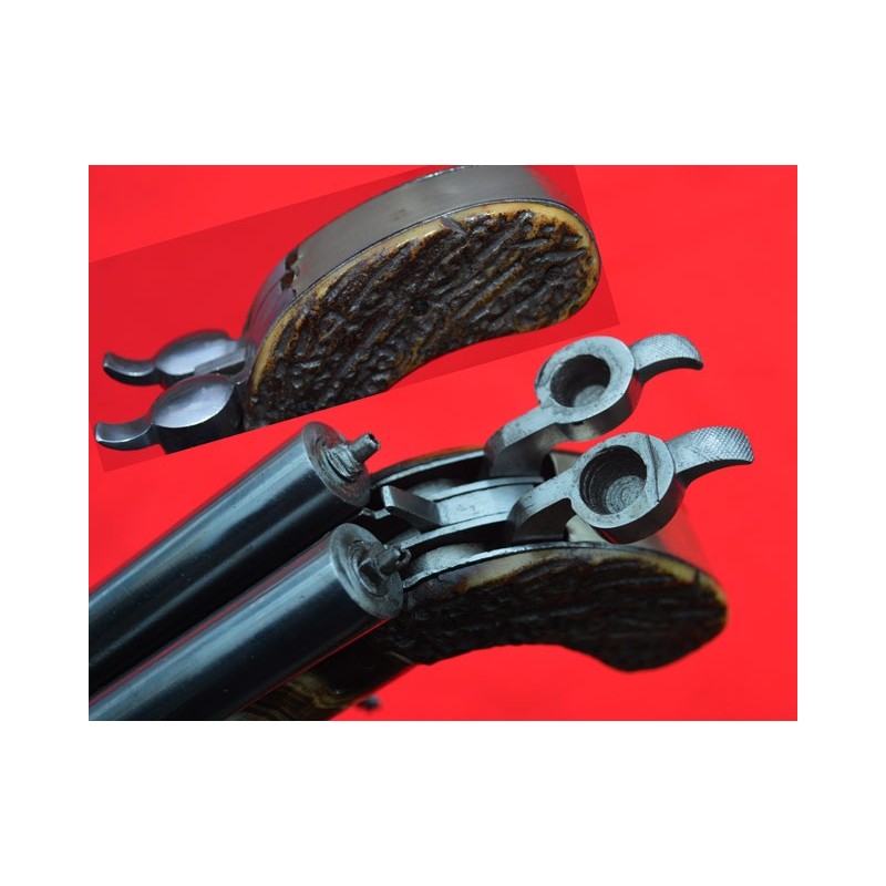 Mécanisme complet et fonctionnel avec toutes pièces d origine. Les deux chiens ont de bons crans d armé, mise à feu par deux détentes tire bouchon repliable qui libère également la lame de couteau.