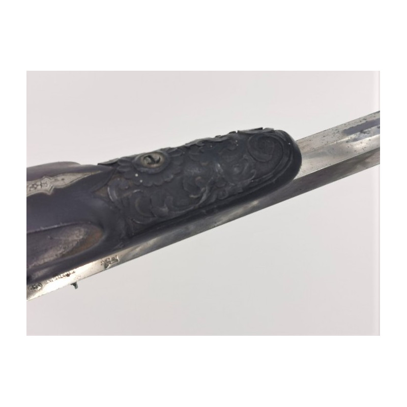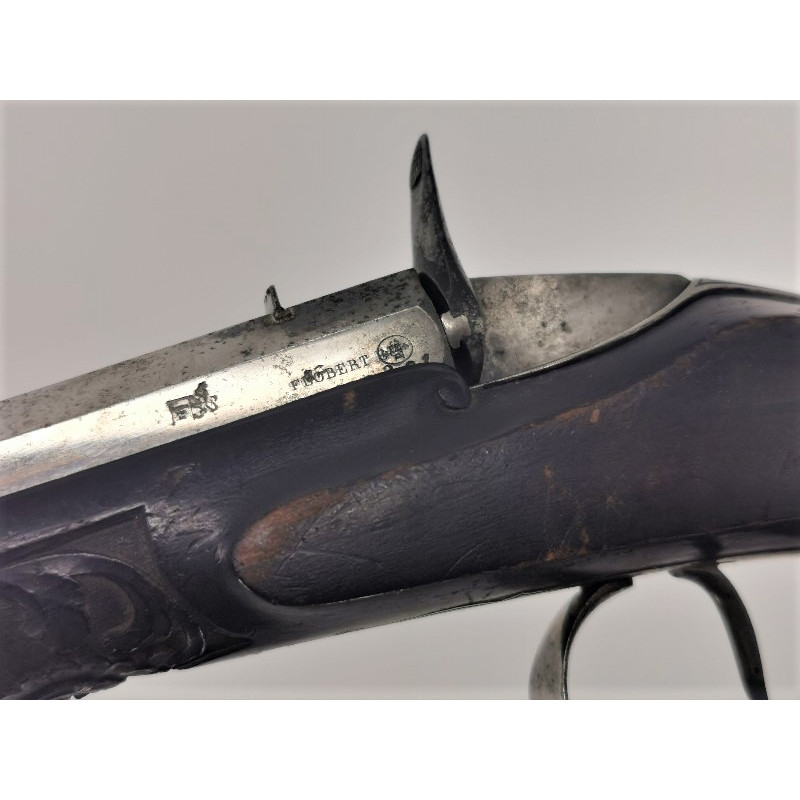 Pistolet de tir sa salon calibre 6mm bosquette, fabrication de qualité poinçonné par FLOBERT sur la gauche du canon avec l'épreuve ELG avant 1893. Canon de 23cm à âme lisse brillante miroir sans tache, à pans en fer poli brillant patiné d'usage, pontet culasse et calotte finement gravés. Crosse type renaissance en noyer foncé finement sculpté de fleurs. Mécanisme bien ajusté au fonctionnement irréprochable. Longueur totale 39cm, Très bon état.
