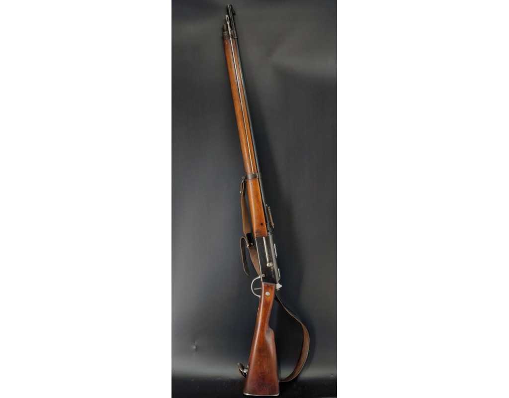 Rare Prototype du fusil Lebel modèle 1886 en superbe état de conservation dans sa finition d'origine bronzée sans usure particulière, culasse pontet baguette et plaque de couche poli blanc. Monture en noyer bien réceptionnée sans accident hormis un léger manque au départ du fût. Canon de 76cm à cinq pans au tonnerre daté 1876 puis rond, hausse du modèle gras 1874, rayures brillantes miroir sans usure ni tache, chambré en 11mm Gras. Mécanisme complet et fonctionnel avec toutes pièces d'origine au même numéro