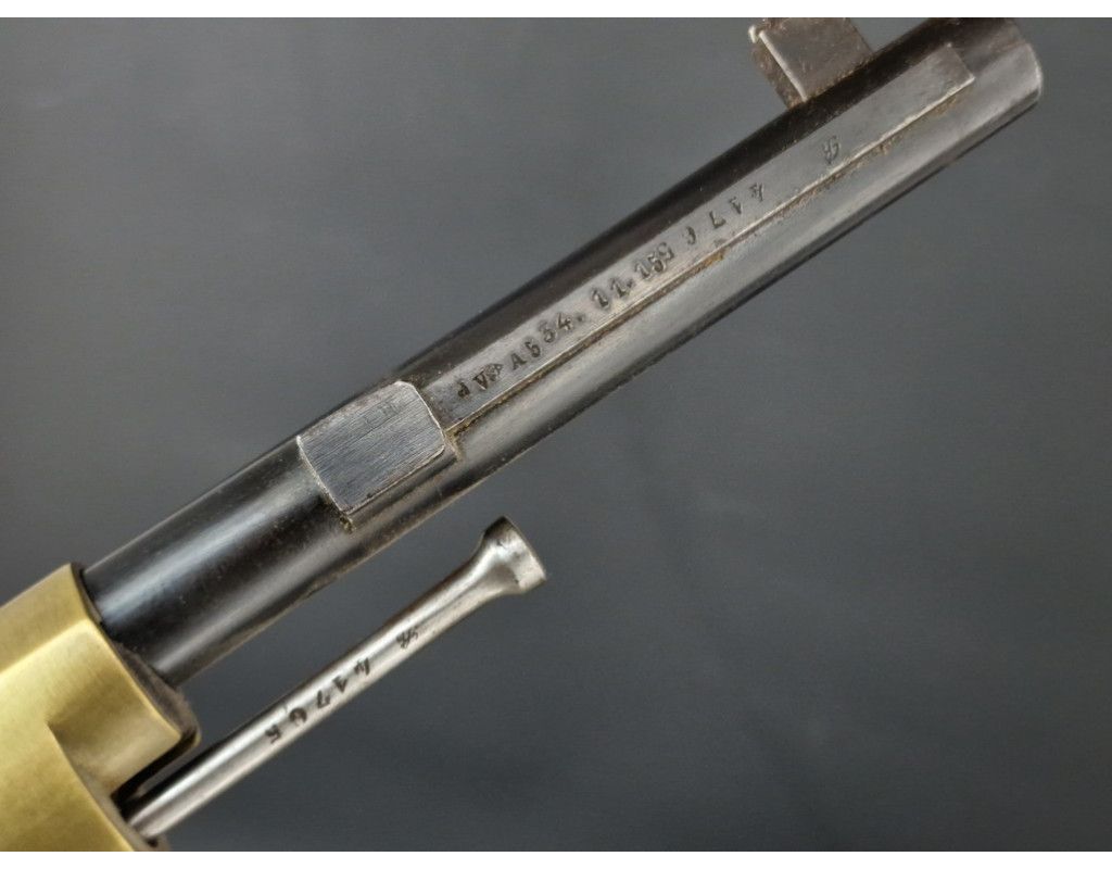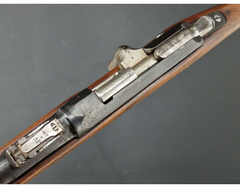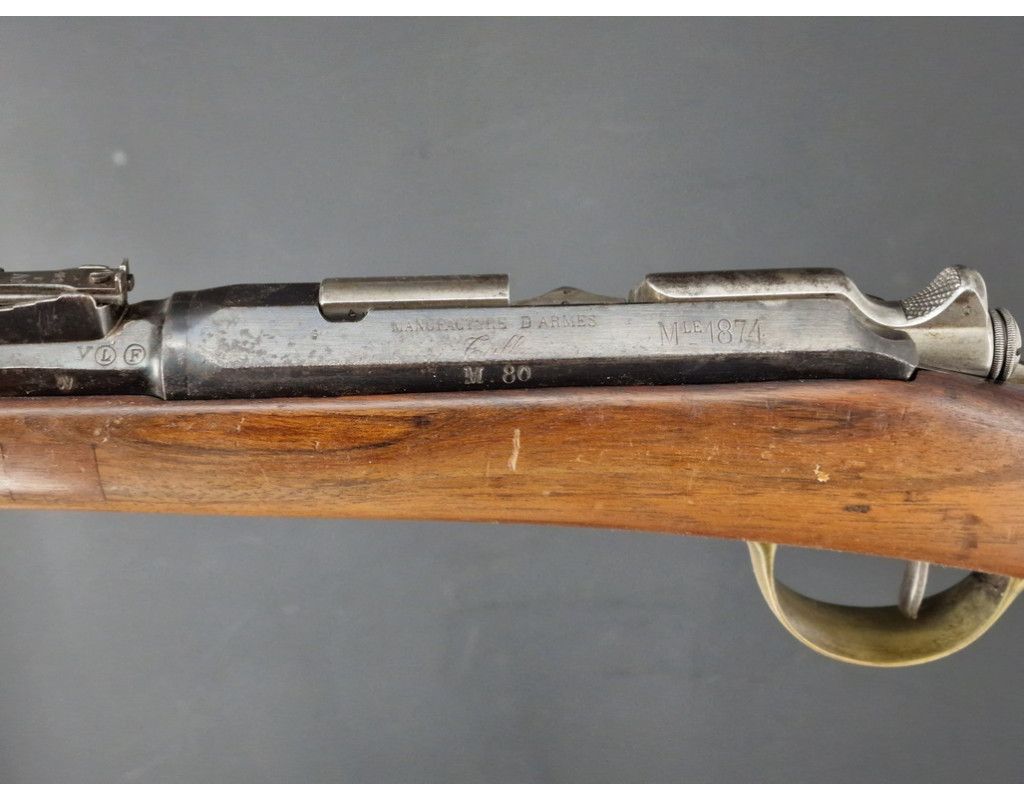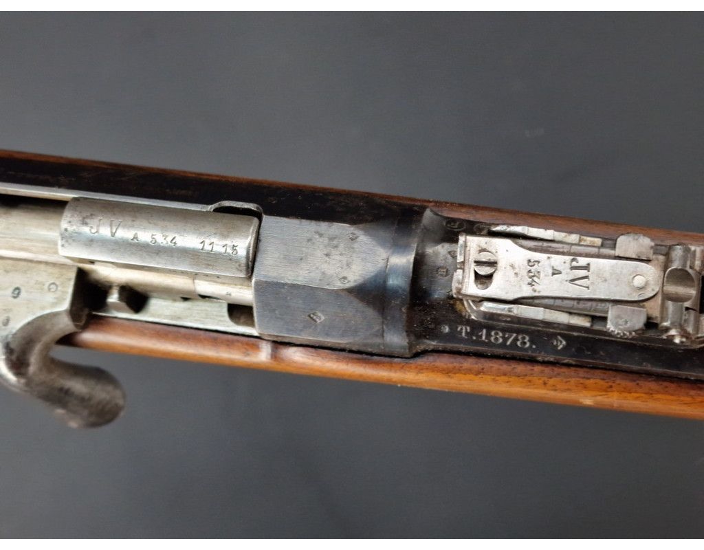 Finition d'origine légèrement patiné sans oxydation, arme vendue par la Manufacture d'armes de Saint Etienne comme en atteste le marquage sur le dessus du canon et l'absence de numéro au tonnerre et sur la crosse, une petit enture côté gauche sans accident. Tenon de baïonnette et baguette au même numéro, planchette de hausse du modèle 1874 avec ajout d'un curseur particulier dérivable et guidon de visée de type Lebel 1886. Rayures brillantes sans usure ni tache. Poinçons JV sur le pan gauche du canon, sur le curseur de hausse et la tête de culasse.