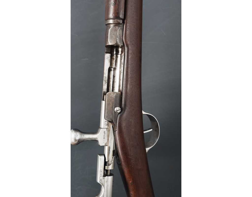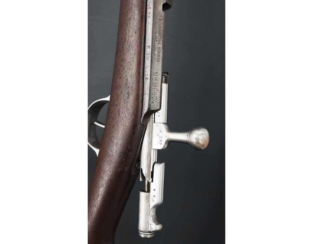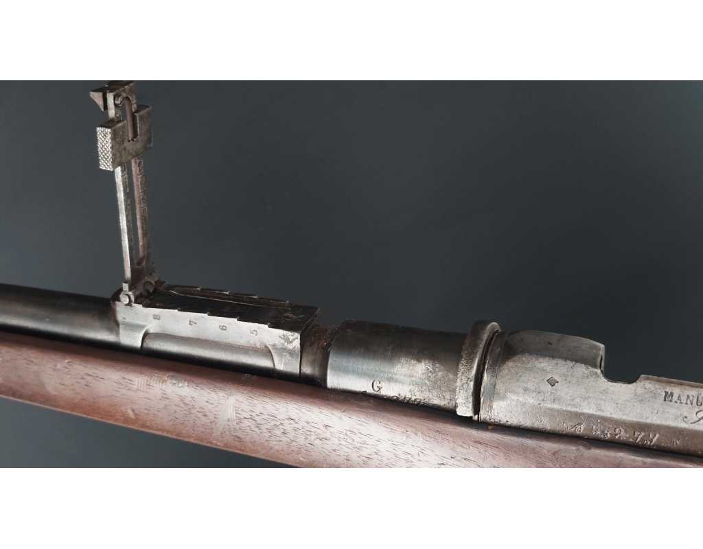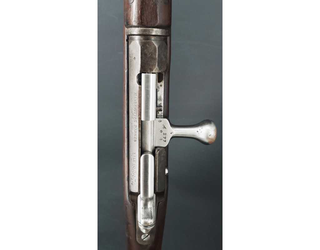 Finition bronzée d'origine avec forte patine, marquage de la Manufacture d'Armes de St-Etienne et modèle 1866-74 non atténué, mécanisme complet et fonctionnel, toutes pièces d'origine au même numéro A277. Culasse pontet et plaque de couche poli blanc. Crosse et garde main en noyer sans usure particulière ni enture, macarons de réception devinables. Canon chambré en 8mm Lebel, ajout du tenon de baïonnette du système Gras, rayures brillantes légèrement usagées et tachées qui permettra de bons résultats à la cible.