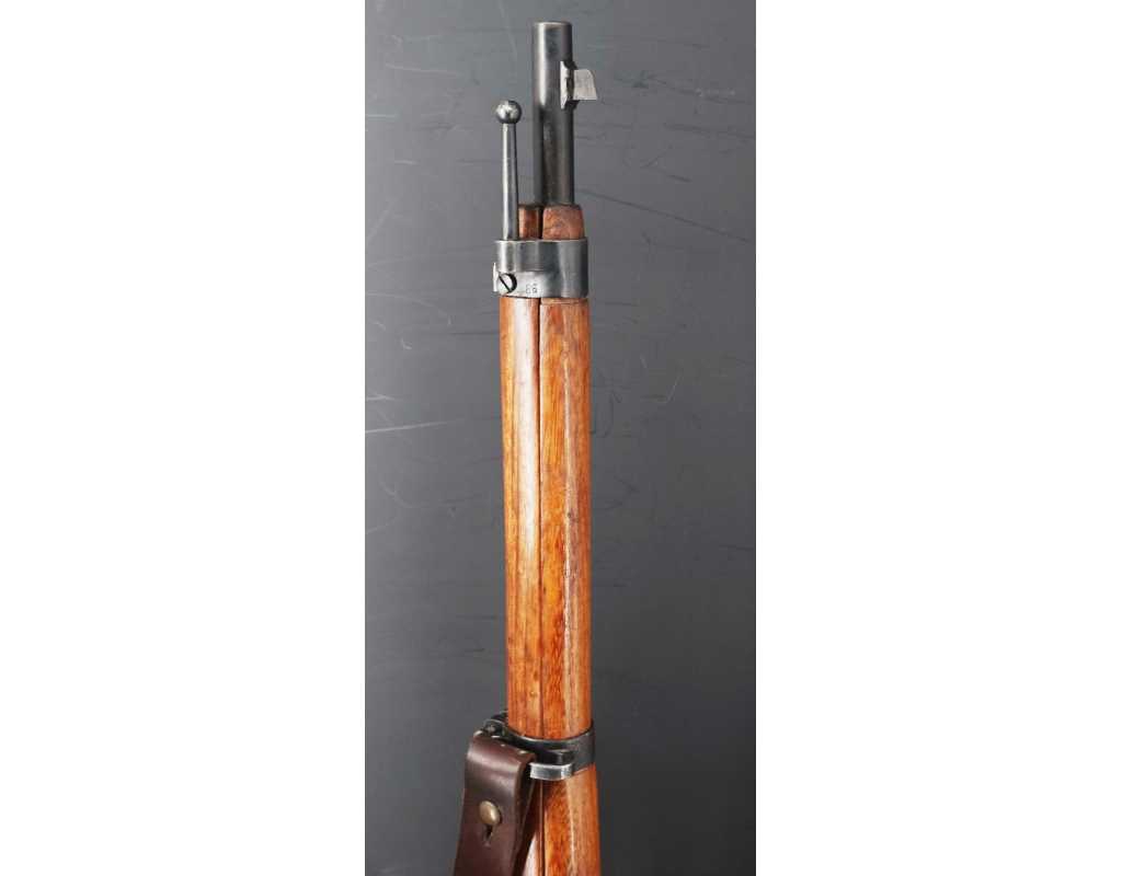 Mousqueton Steyr Mannlicher Modèle 1895 de l'usine de Budapest calibre 8x56R éprouve allemande. Bronzage d'origine sans oxydation, mécanisme complet et fonctionnel au même numéro, bois réassemblé en usine à la transformation dans les années 30's, canon de 51cm (totale 1m), rayures d'aspect brillantes. Crosse et garde main en noyer sans accident. Bretelle cuir.