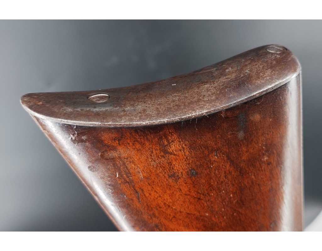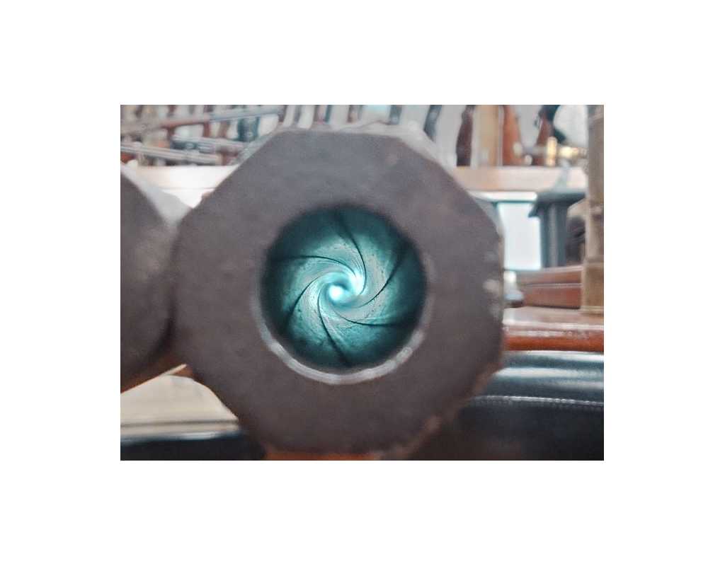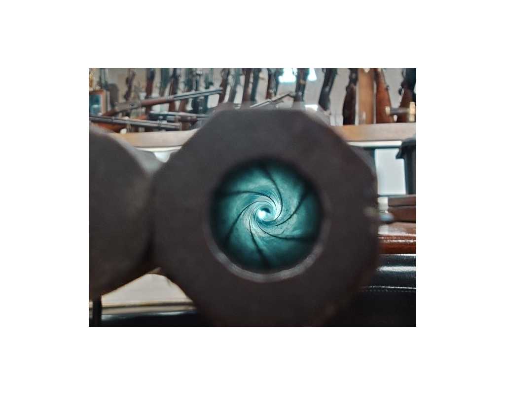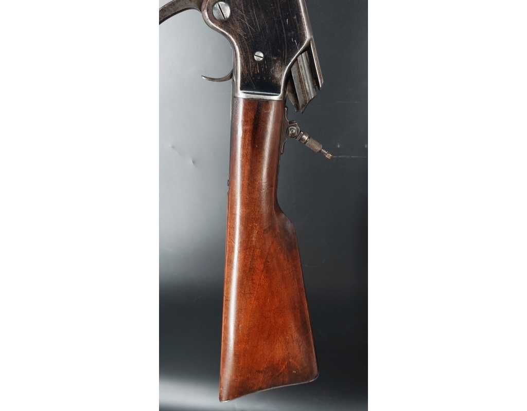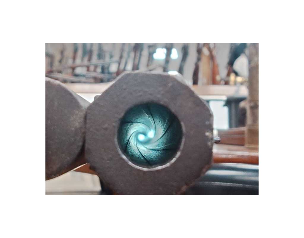 imposant fusil Marlin fabriqué en 1885 dans sa finition d'origine bronzé, patine d'usage et fines taches localisées,  marquages bien visibles sans atténuation. Mécanisme complet et fonctionnel entièrement d'origine. Canon octogonal long de 28’’ équipé de sa hausse et guidon d'origine présente de superbes rayures d'aspect brillantes miroir sans usure notable. Crosse et garde main en noyer avec restant de verni patiné, aucune usure des angles, très fines traces de manipulation sans aucun accident. Ce rare exemplaire Marlin rifle 1881 est une des armes de légende de l’époque de la conquête de l’Ouest.