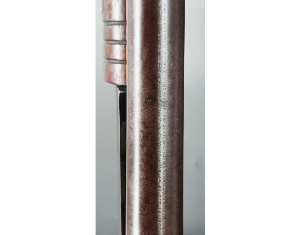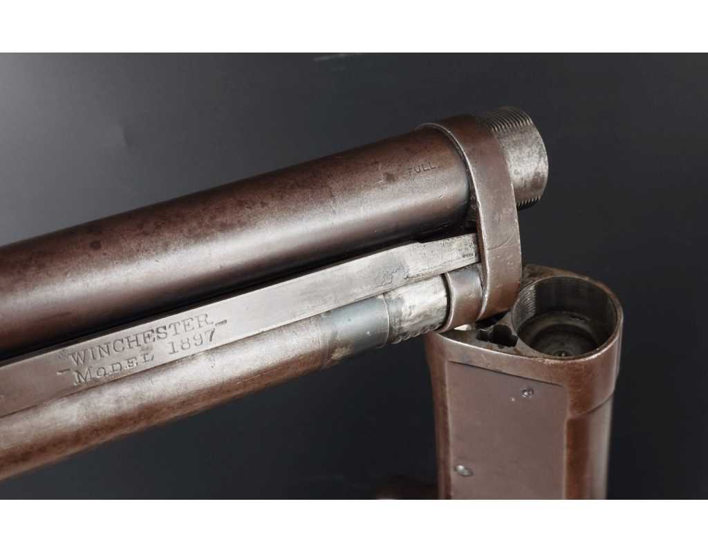 Fusil à pompe à répétition manuelle Winchester modèle 1897 takedown, 5 coups à répétition manuel en calibre 12/70. Numéroté 214506 produit en 1904. Bronzage d'origine avec patine sans oxydation, aucune atténuation des marquages. Mécanisme complet et fonctionnel entièrement d'origine. Canon facilement démontable sans jeu, long de 70cm, âme lisse d'aspect brillante avec fines taches, choke Full. Crosse et pompe en noyer sans accident, talon en gutta-percha noir estampillé winchester.
