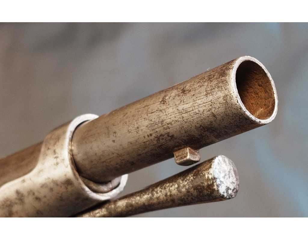Canon lisse de 126cm avec sa baguette d'origine, bouche parfaitement compassée, fine oxydation interne, pontet, contre platine, capucine laiton, plaque de couche, embouchoir et grenadière en fer. Platine complète et parfaitement fonctionnelle. Belle monture en noyer sans usure particulière, un léger fêle côté droit du fut sans fragilité, sans autre accident ni aucune enture.