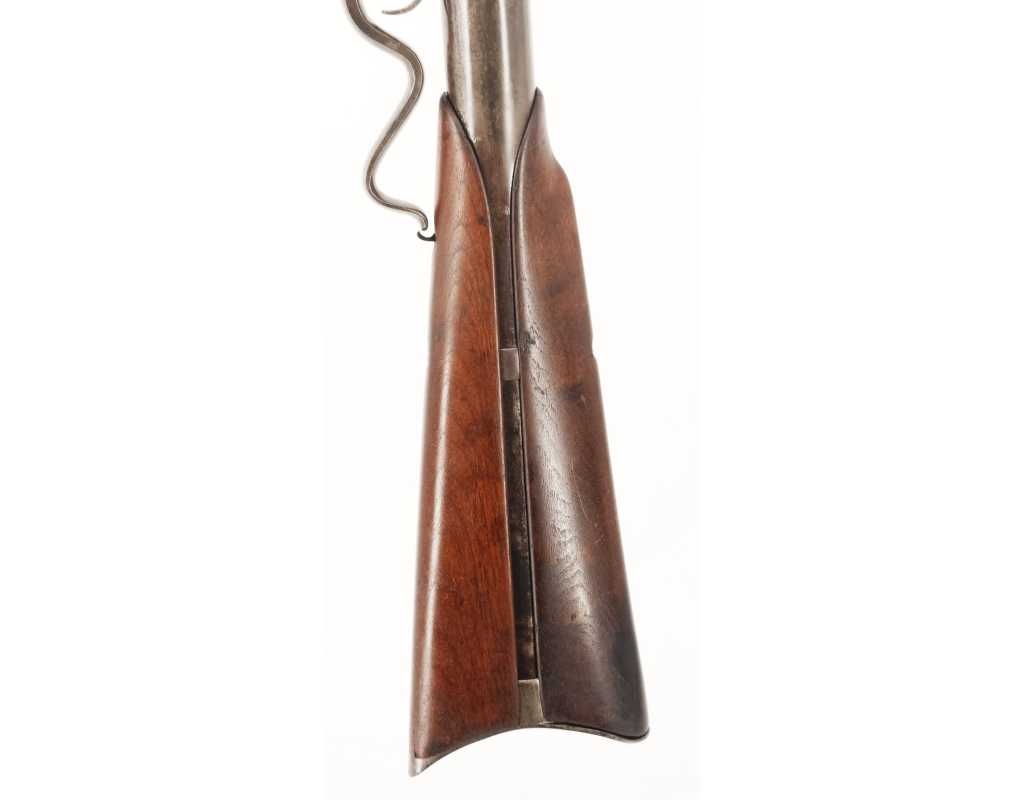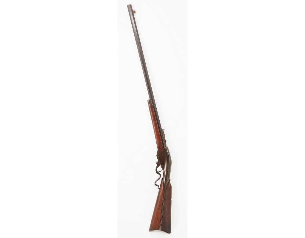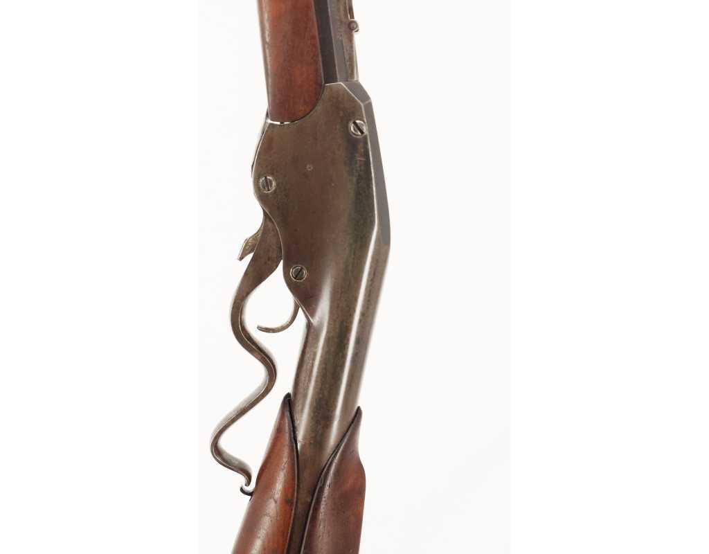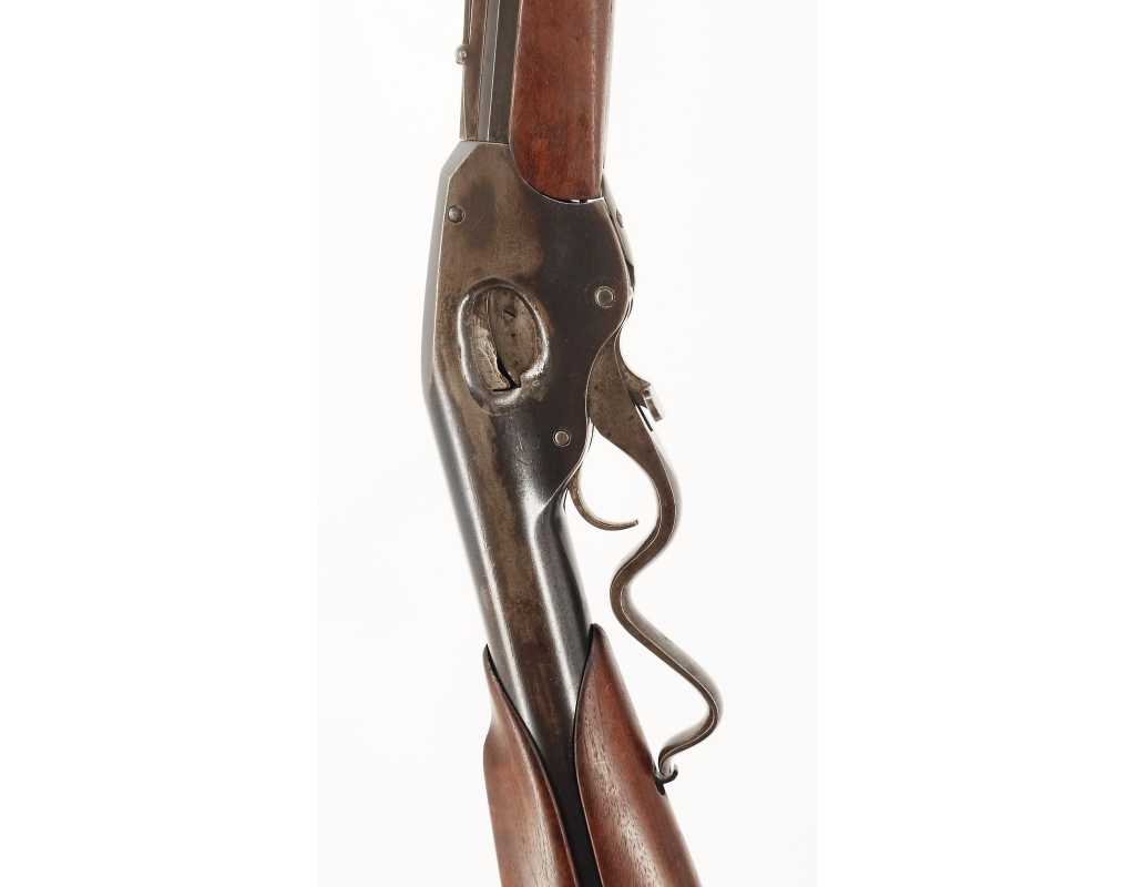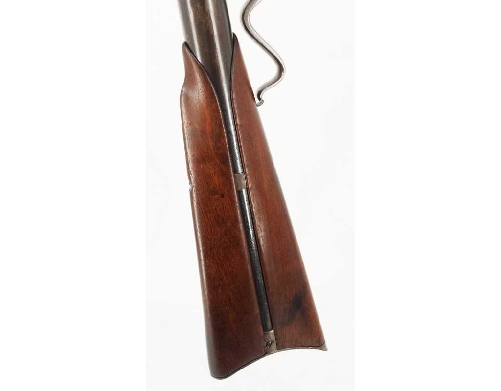 Finition d'origine dans une belle patine homogène sans oxydation, marquage de fabricant sur le canon non atténué. Canon octogonal long de 28 pouces à rayures légèrement tachées sans usure prononcée, hausse à gradins et guidon fixe. Mécanisme complet et fonctionnel entièrement d'origine. Crosse et fut en noyer sans accident.