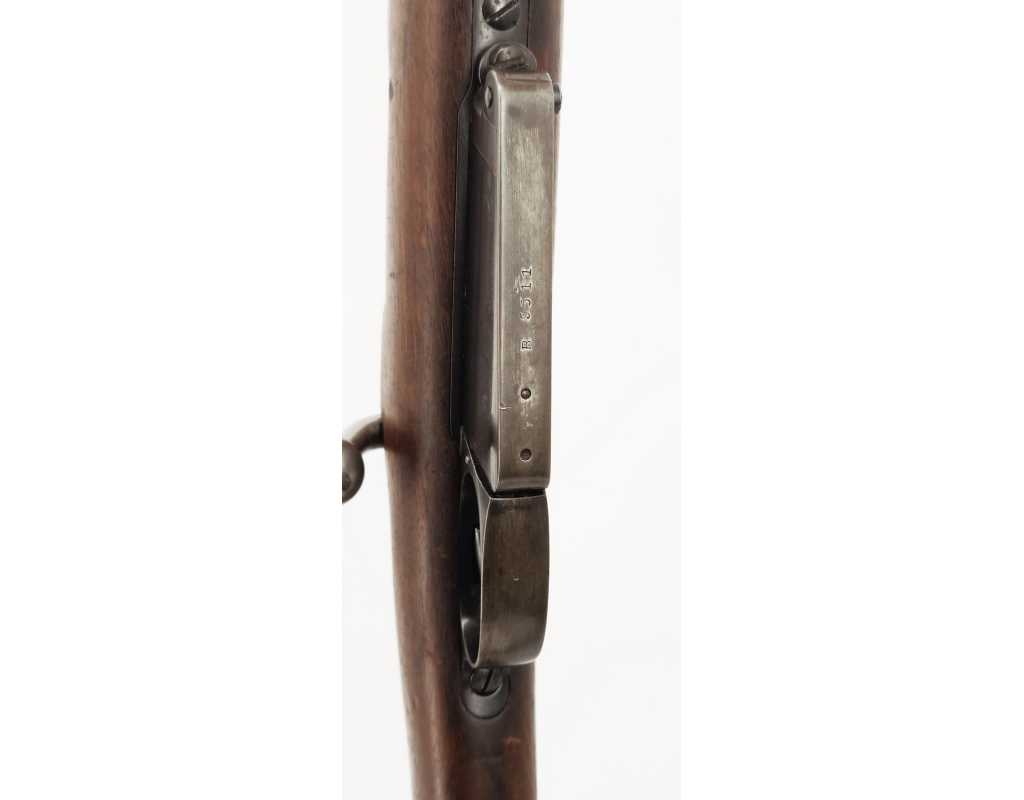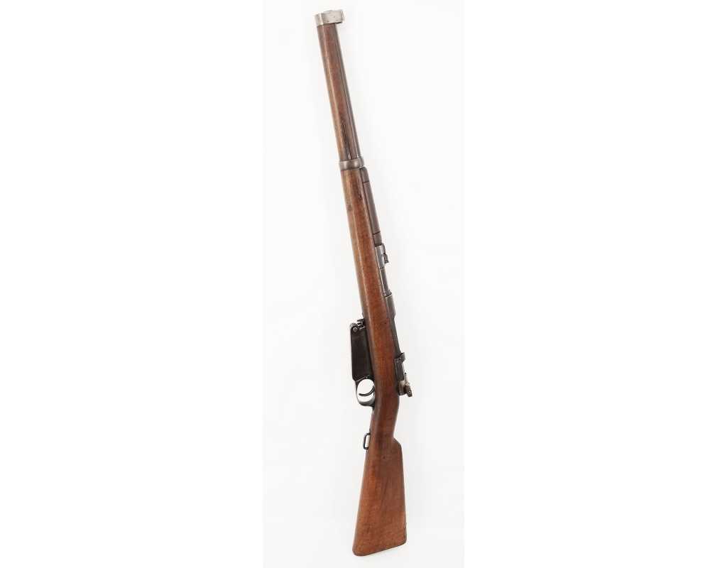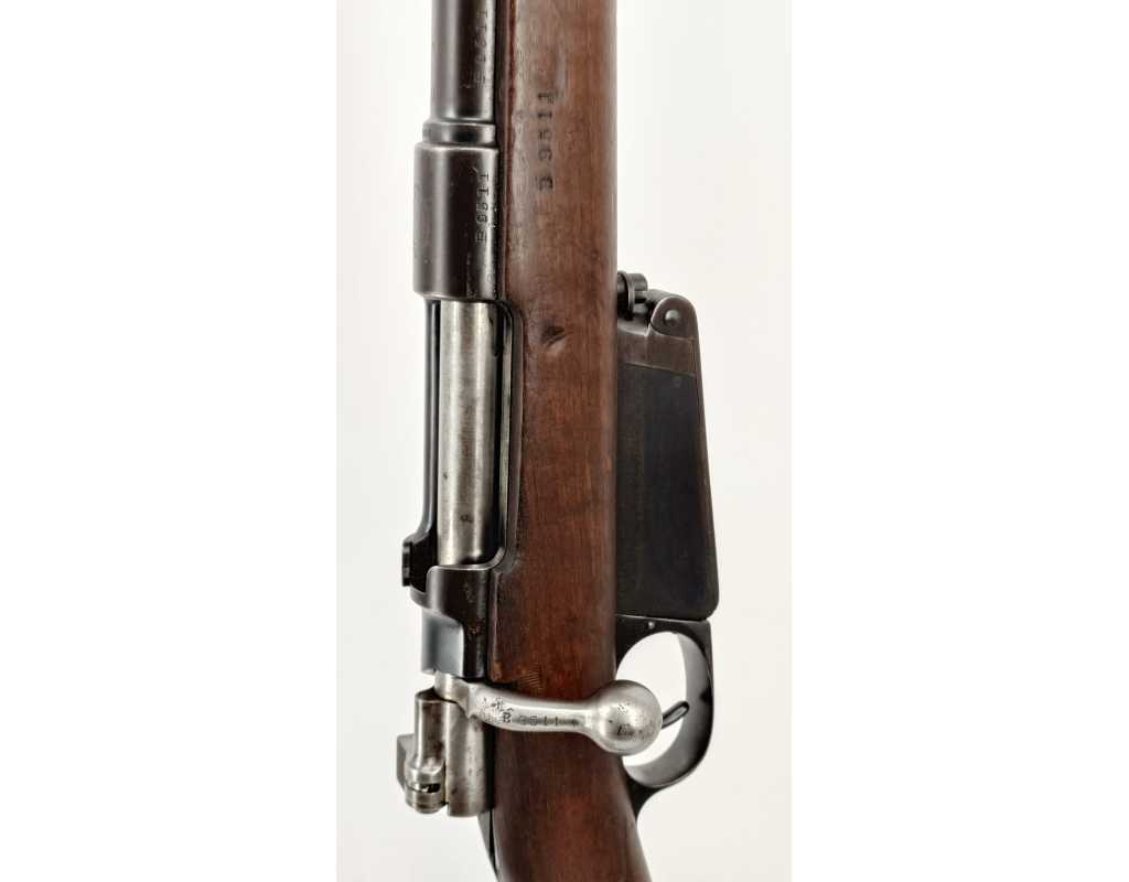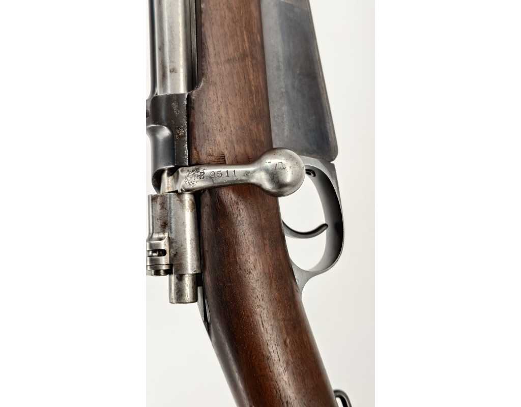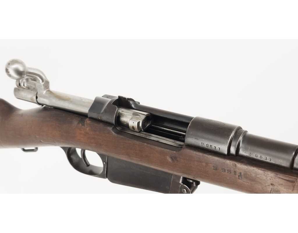 Peu courante carabine Mauser modèle 1891 pour l'Argentine, produite par la DWM à Berlin en calibre 7.65 x 53. Finition d'origine, légère patine sans oxydation, marquages non atténués, crosse noyer sans accident. Mécanisme complet et fonctionnel au même numéro B9511. Rayures brilantes sans usure particulière ni tache.