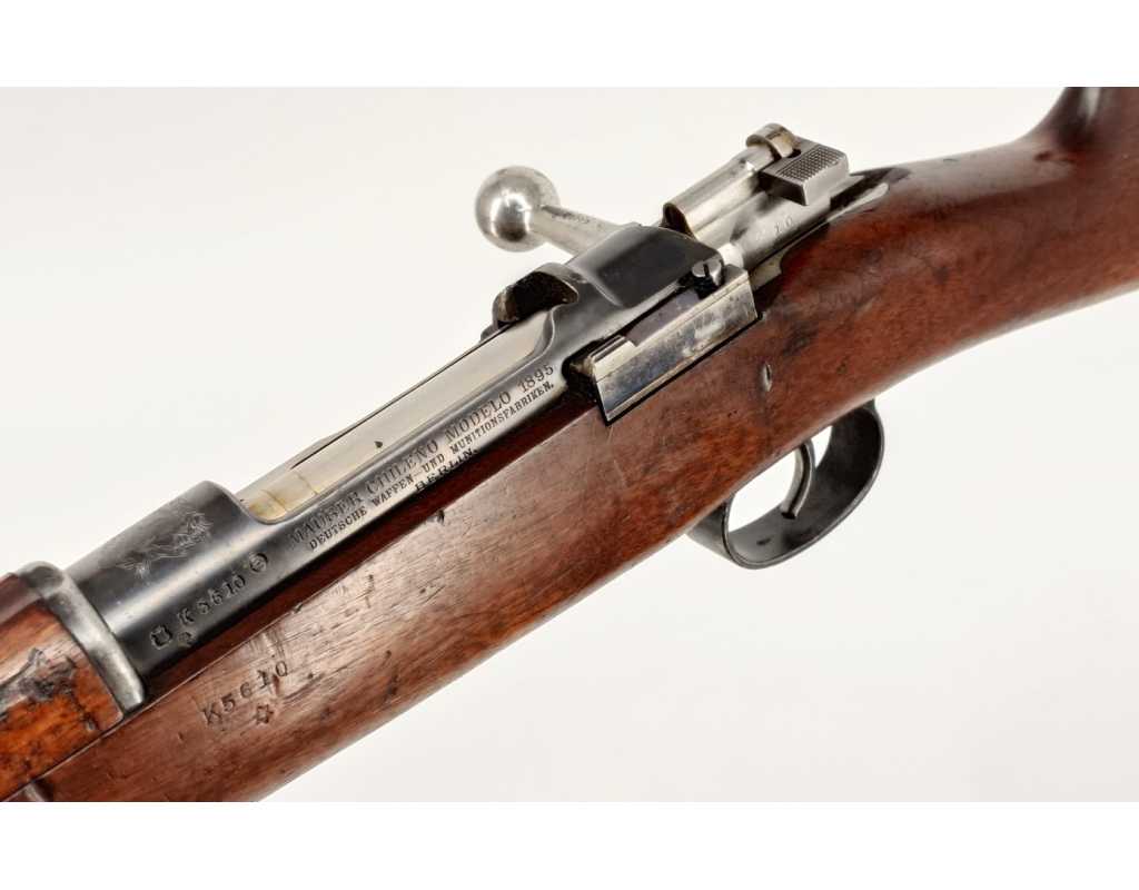 Fusil Mauser Chilien modèle 1895 produit par la DWM à Berlin en calibre  d'origine 7x57 éprouvé CIP, finition bronzée sans usure particulière, mécanisme complet et fonctionnel avec toutes pièces d'origine au même numéro, crosse noyer vernie bien réceptionnée par timbre daté 1898, traces de manipulation sans accident, rayures usagées et oxydées.