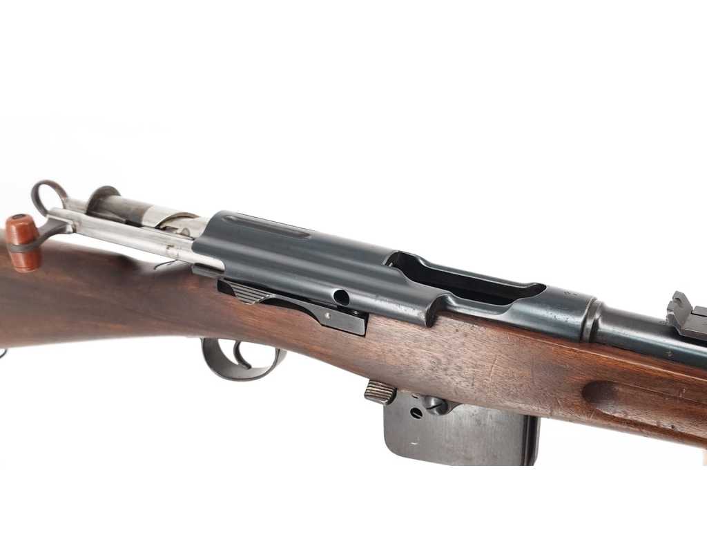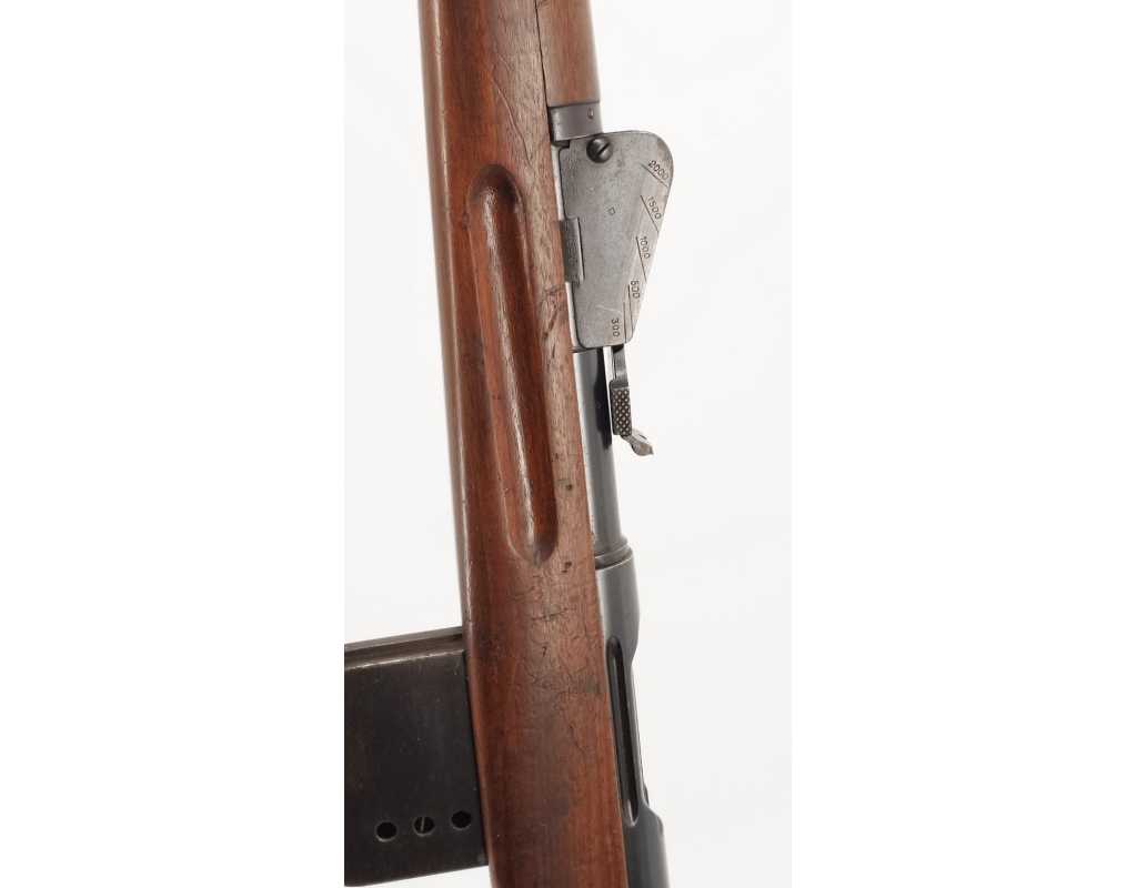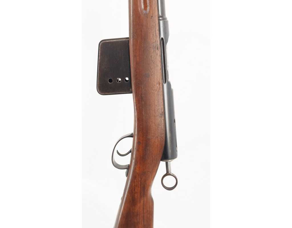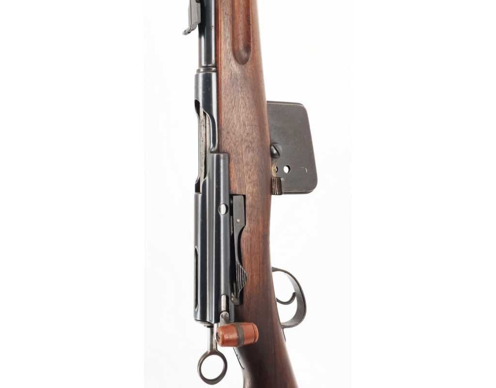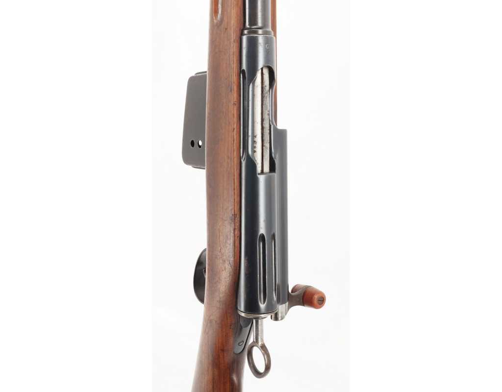 Fusil Schmidt Rubin modèle 1889, calibre 7.5x53.5, chargeur de 12 coups à répétition manuelle. Bronzage d'origine sans oxydation. Mécanisme complet et fonctionnel à culasse linéaire, tous poinçons de conformité présents, toutes pièces d'origine au même numéro. Rayures brillantes. Crosse et garde main en noyer, fines traces de manipulation sans accident. Cette belle mécanique dont la réputation de précision n'est plus à faire satisfera un tireur sportif (TAR).